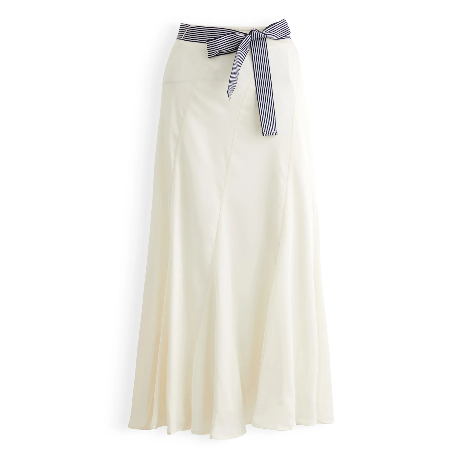 1930s Gore Skirt (No. 1825), made of silky 100% poly with great luster and drape. Self-lining. Low-calf length. Nautical striped ribbon belt. Ten topstitched gores to swirl and catch the breeze off the water.