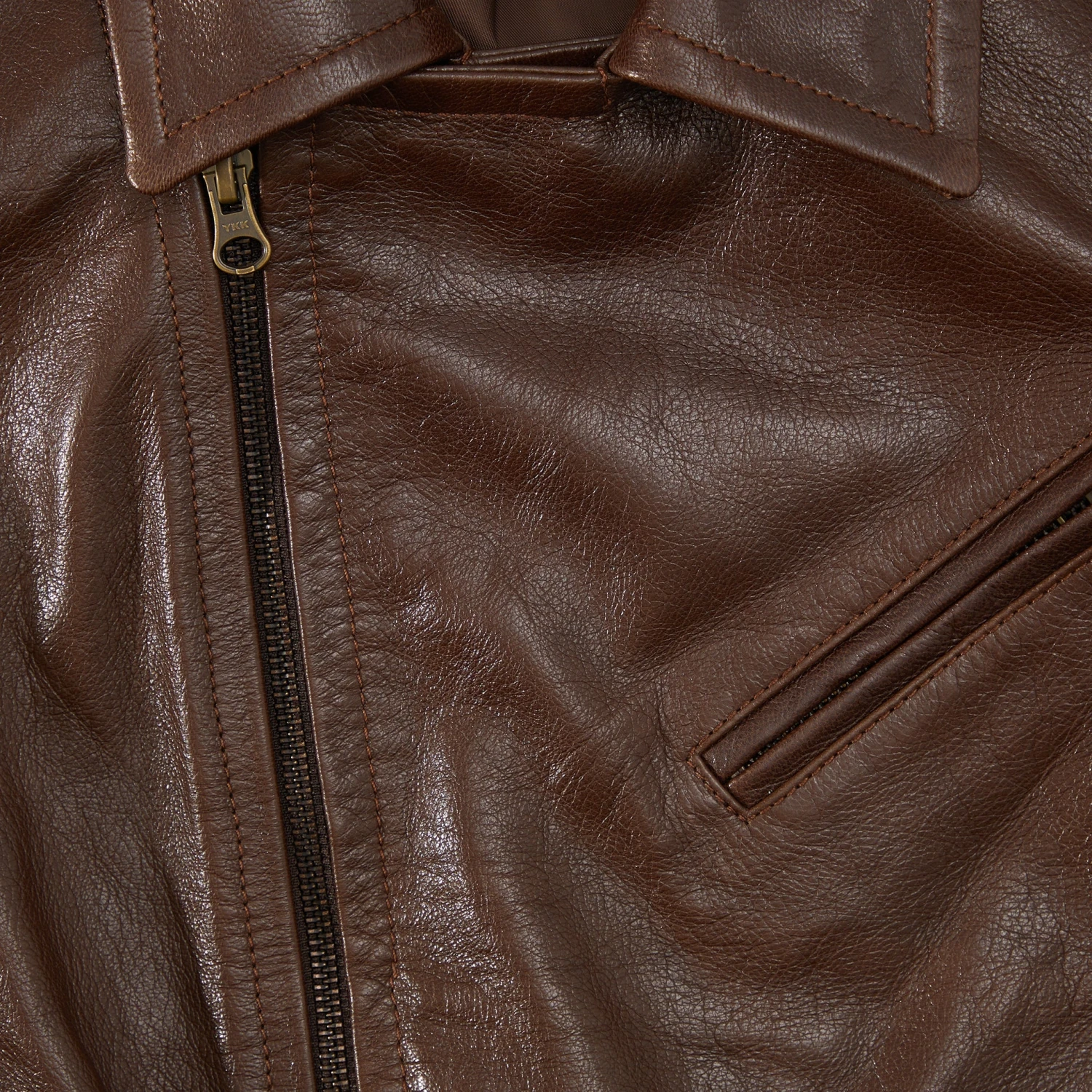 1930s European Motorcycle Jacket (No. J8121). Buttery and supple in hand—a testament to the quality of Italian vegetable-tanned calfskin—ensures dreaminess in the wearing. Fully lined. Three angled pockets. Zippers allow sleeves to expand. Adjustable waist tabs. Antique brass zippers. Italian vegetable-tanned calfskin. Viscose/cotton lining. Tailored fit (when in doubt, size up). Made in India