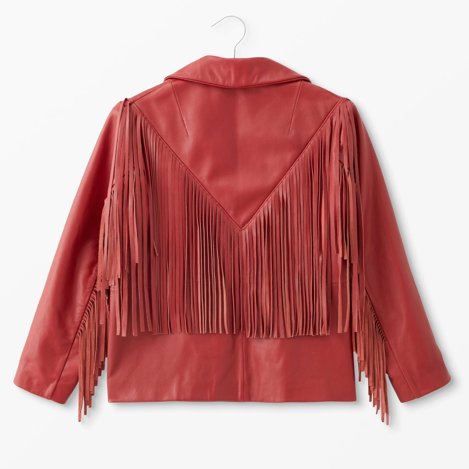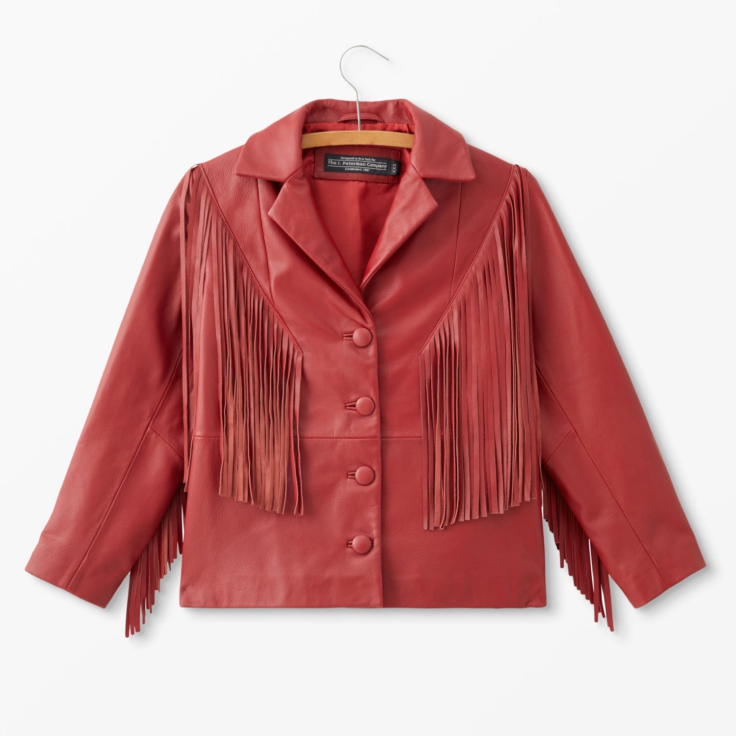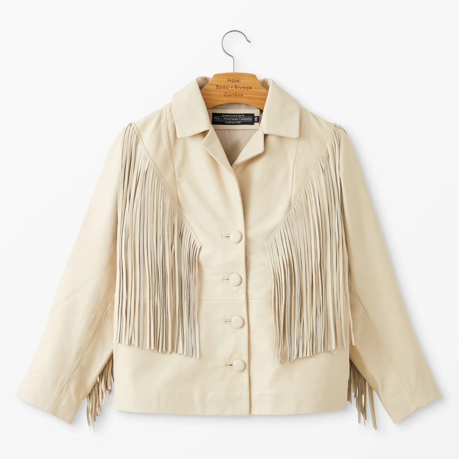 Absaroka Fringe Leather Jacket (No. J7501). Classic Western fringe jacket artfully and meticulously constructed from 100% goat suede. Lined in Korean twill. Suede-covered buttons. Fringe along front and back yoke and sleeve seams. Notched collar. Back and front yokes come to a point. Slightly cropped. Imported.