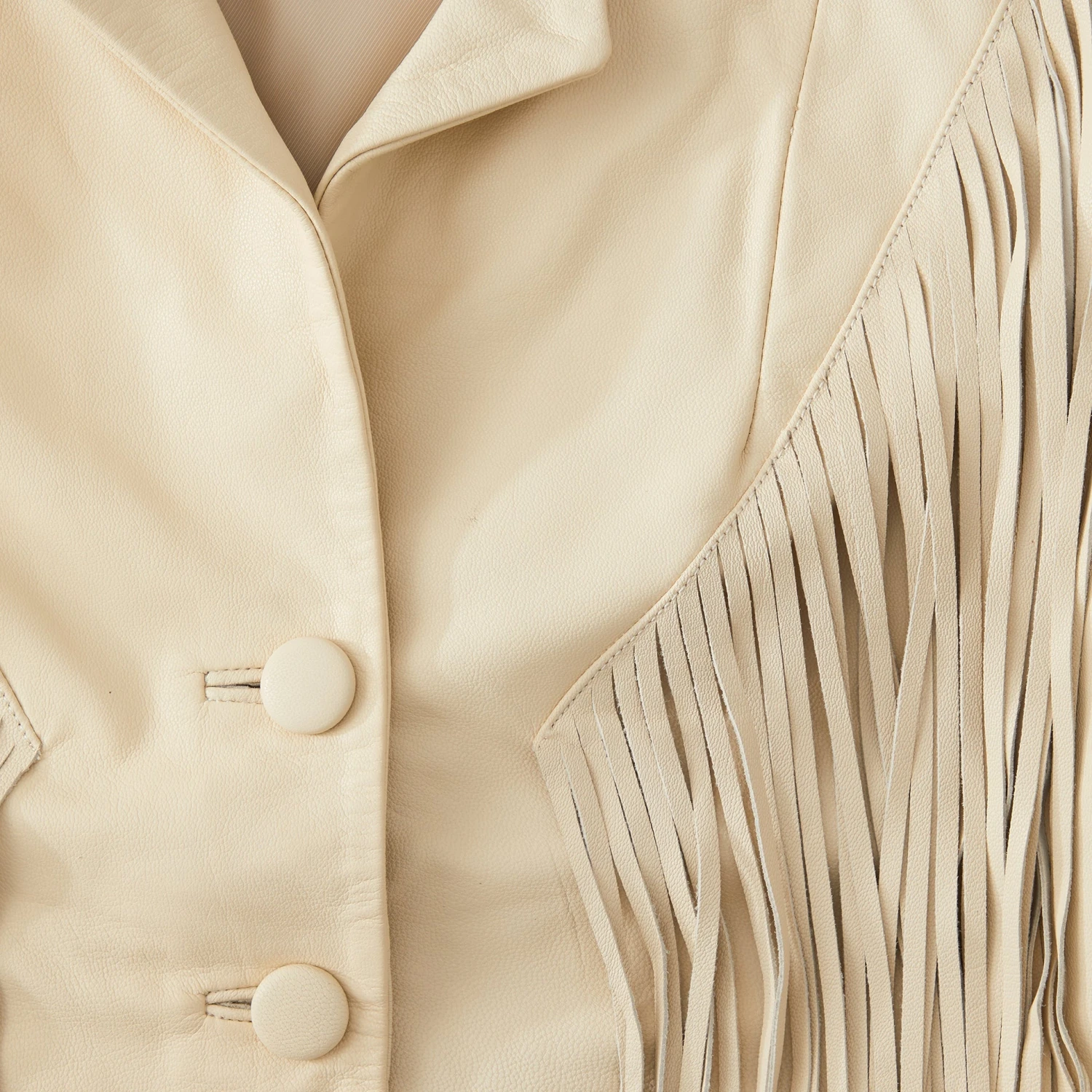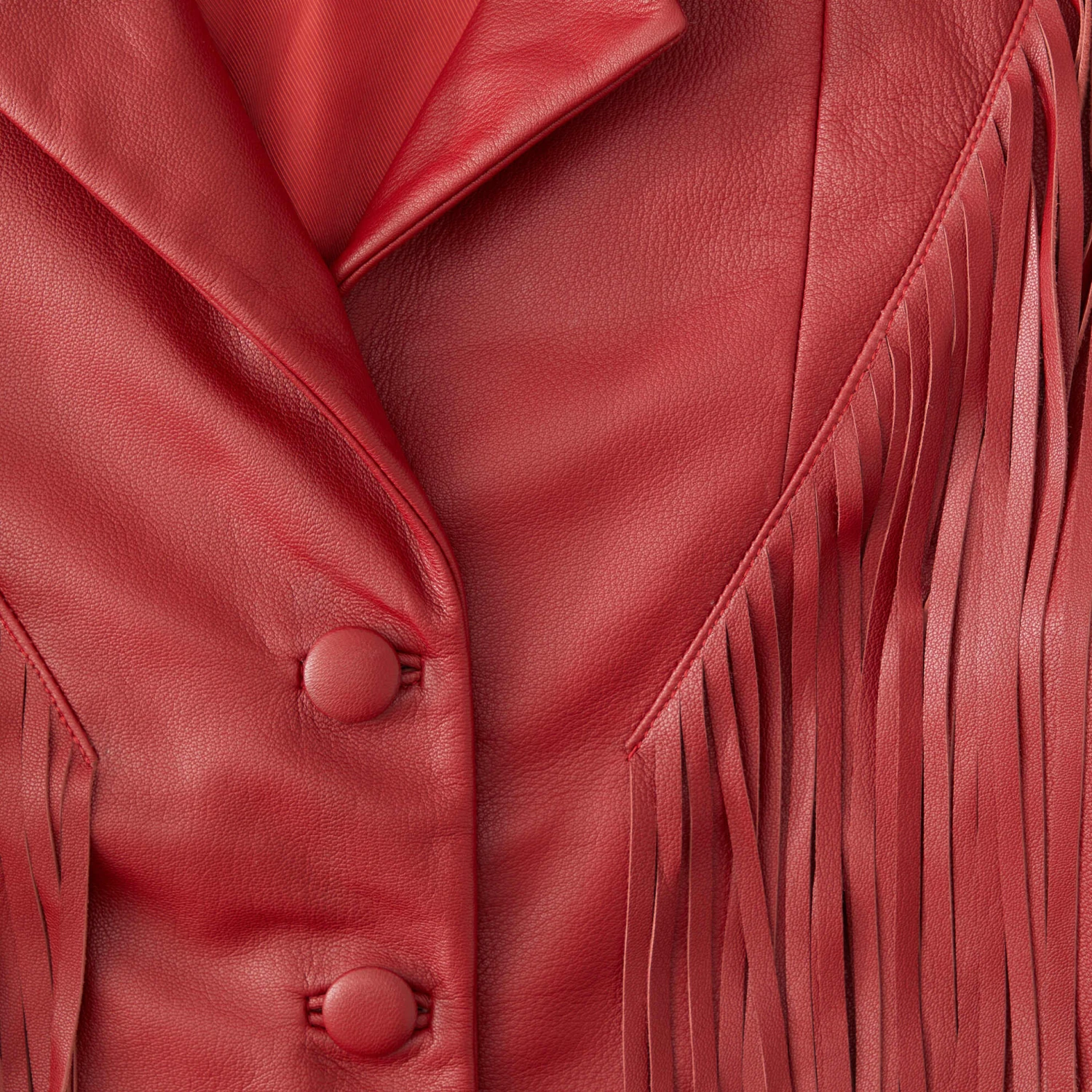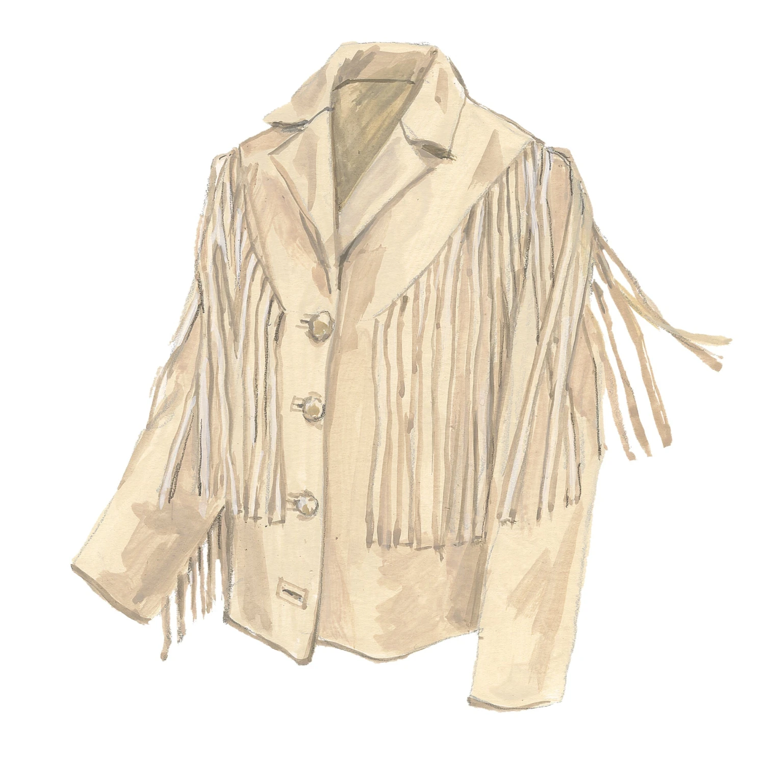 Absaroka Fringe Leather Jacket (No. J7501). Classic Western fringe jacket artfully and meticulously constructed from 100% goat suede. Lined in Korean twill. Suede-covered buttons. Fringe along front and back yoke and sleeve seams. Notched collar. Back and front yokes come to a point. Slightly cropped. Imported.