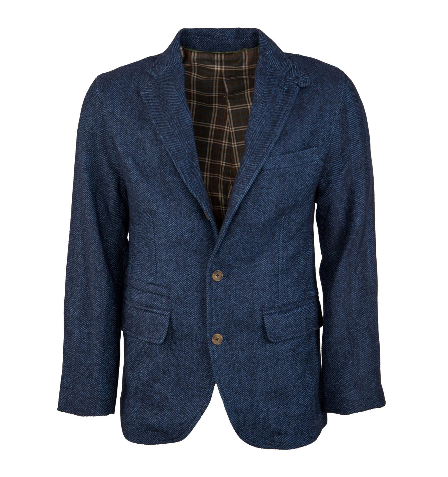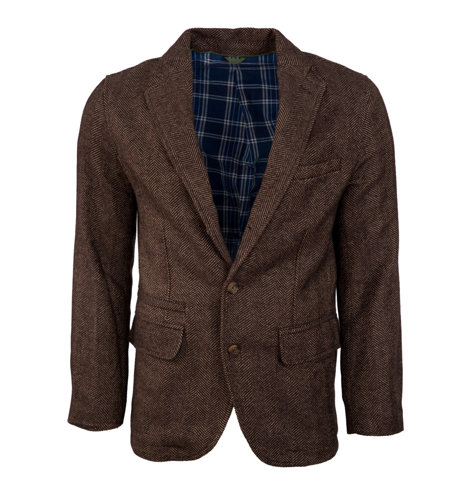 Back East Herringbone Blazer (No. J8643). Exceptionally soft texture and hand feel that rivals cashmere. Old school details include elbow patches and a removable throat latch closure tab. Classic “three-roll-two” button front. Center back vent. Interior loop for eyeglasses. Fully lined in yarn-dyed cotton plaid. Classic fit. Poly/ rayon/wool. Surprisingly, it’s even machine washable. Imported.