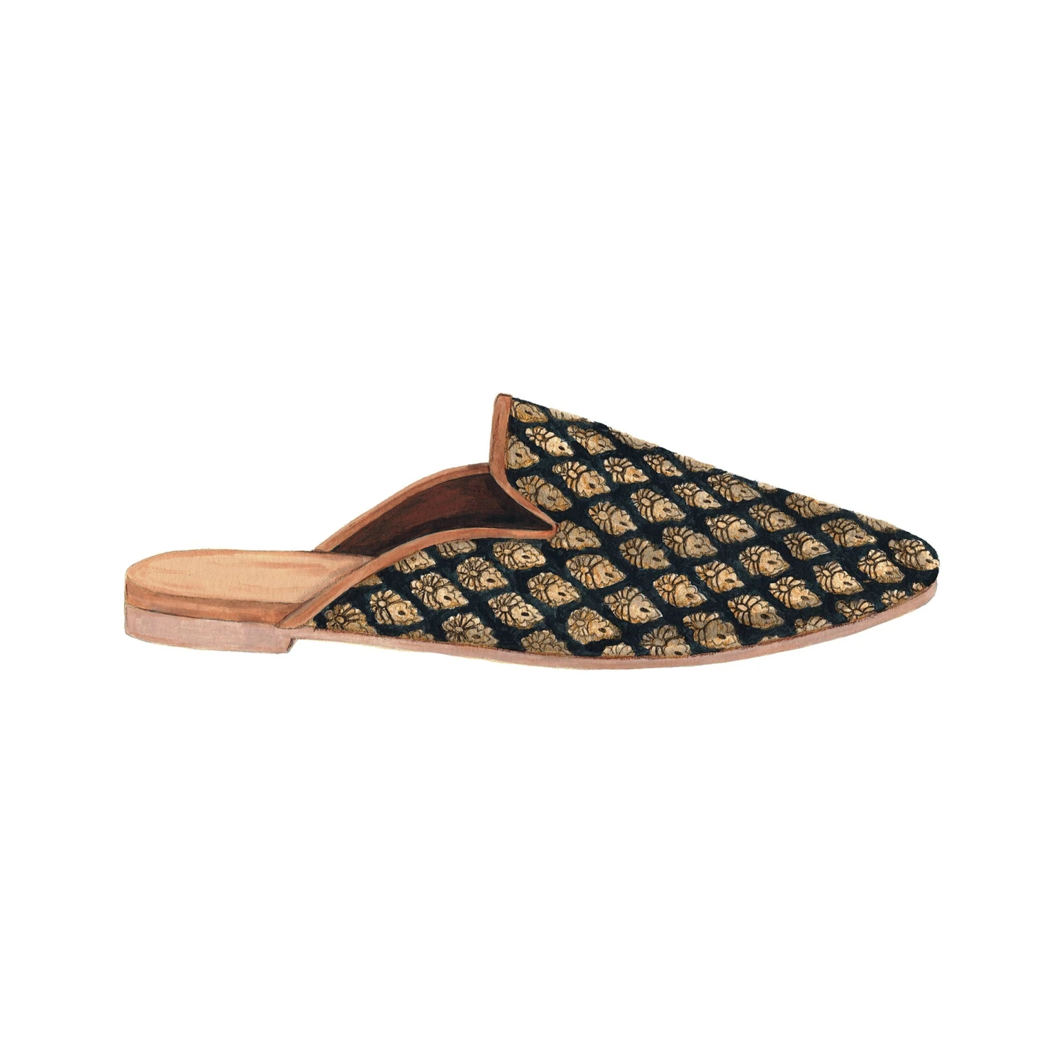 Banasari Jacquard Mule (No. J8259). Our luxurious slide mule is beautifully made from handloomed Banasari silk, a fine quality silk variant originating from Varanasi, India. Wonderfully comfortable microfiber interior and natural crepe sole. Made with all vegan material. Runs small, so we suggest sizing up. Imported.