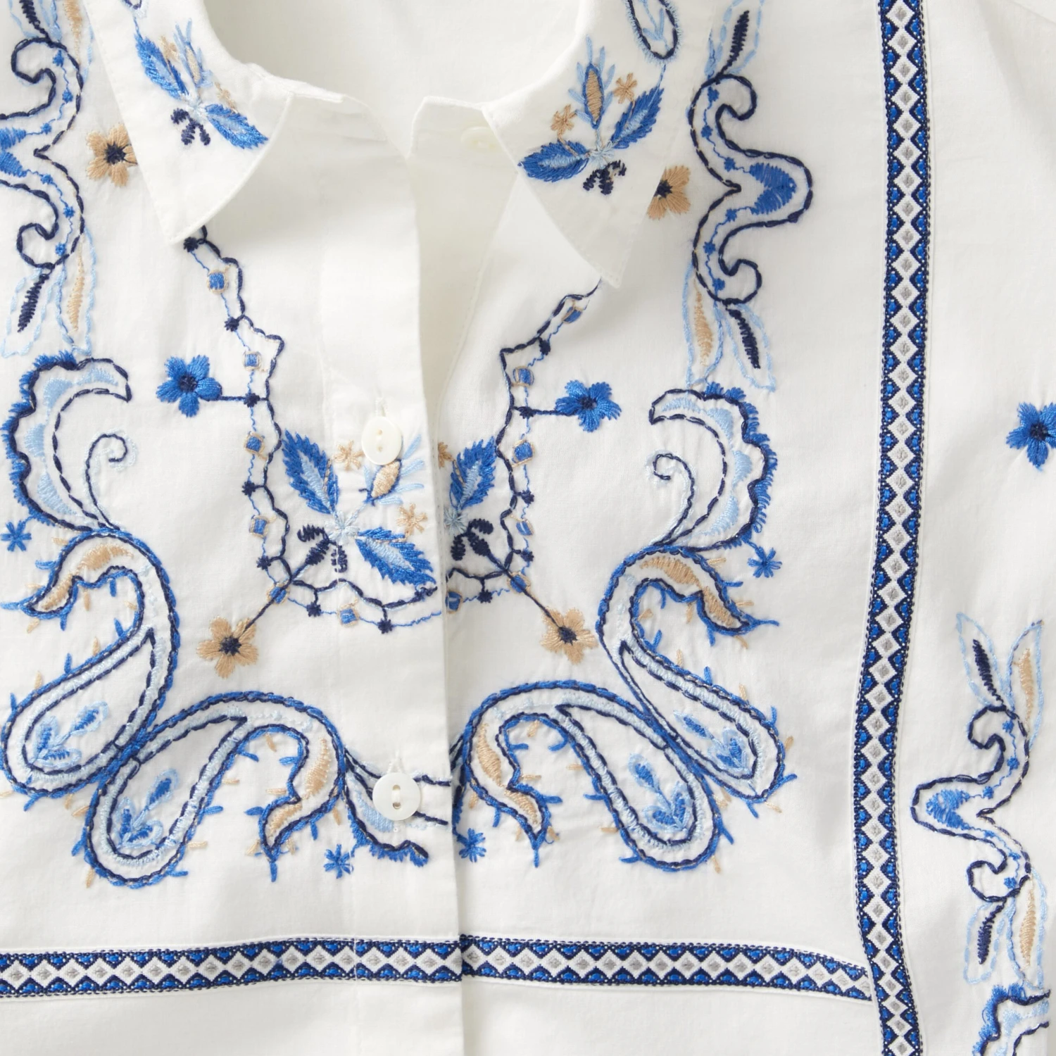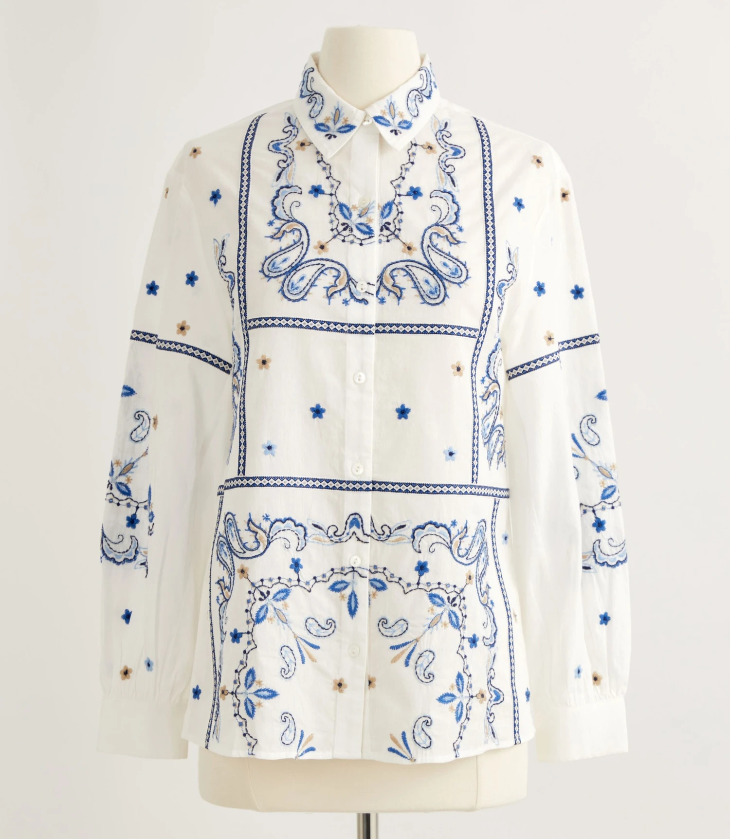 Bandana Embroidered Blouse (No. J8271). Wonderful bandana style embroidery is stitched artfully across the front bodice and along the sleeves of this cool cotton long sleeve blouse. A new take on things that transforms a breezy white blouse into a real head-turner. Shell buttons at center front and one at each shirred cuff. Side slits. Imported.