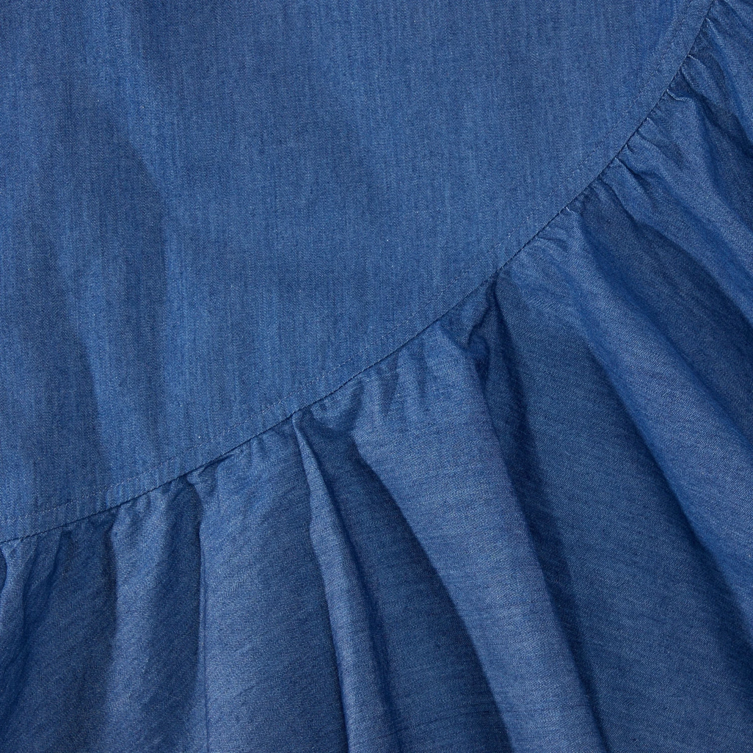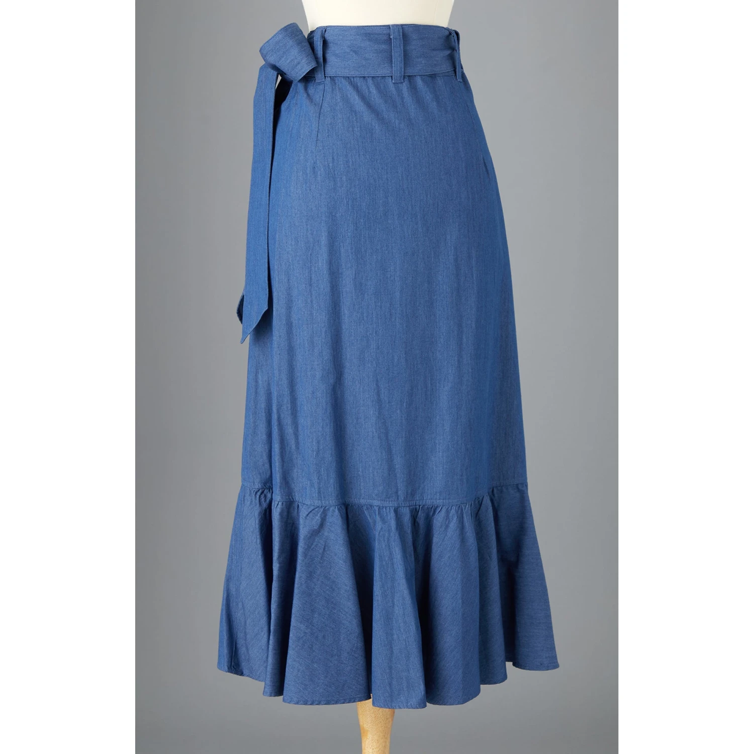 Denim Wrap Skirt (No. J8125). Seriously flirtatious denim wrap skirt that collaborates beautifully with shoulder-baring tank tops and Sunday afternoons on winding roads through Rocky Mountain passes. 100% Cotton lightweight denim. Wide bias ruffle at hem, wrap closure, tie at wearerβs left side, midi length. Imported.