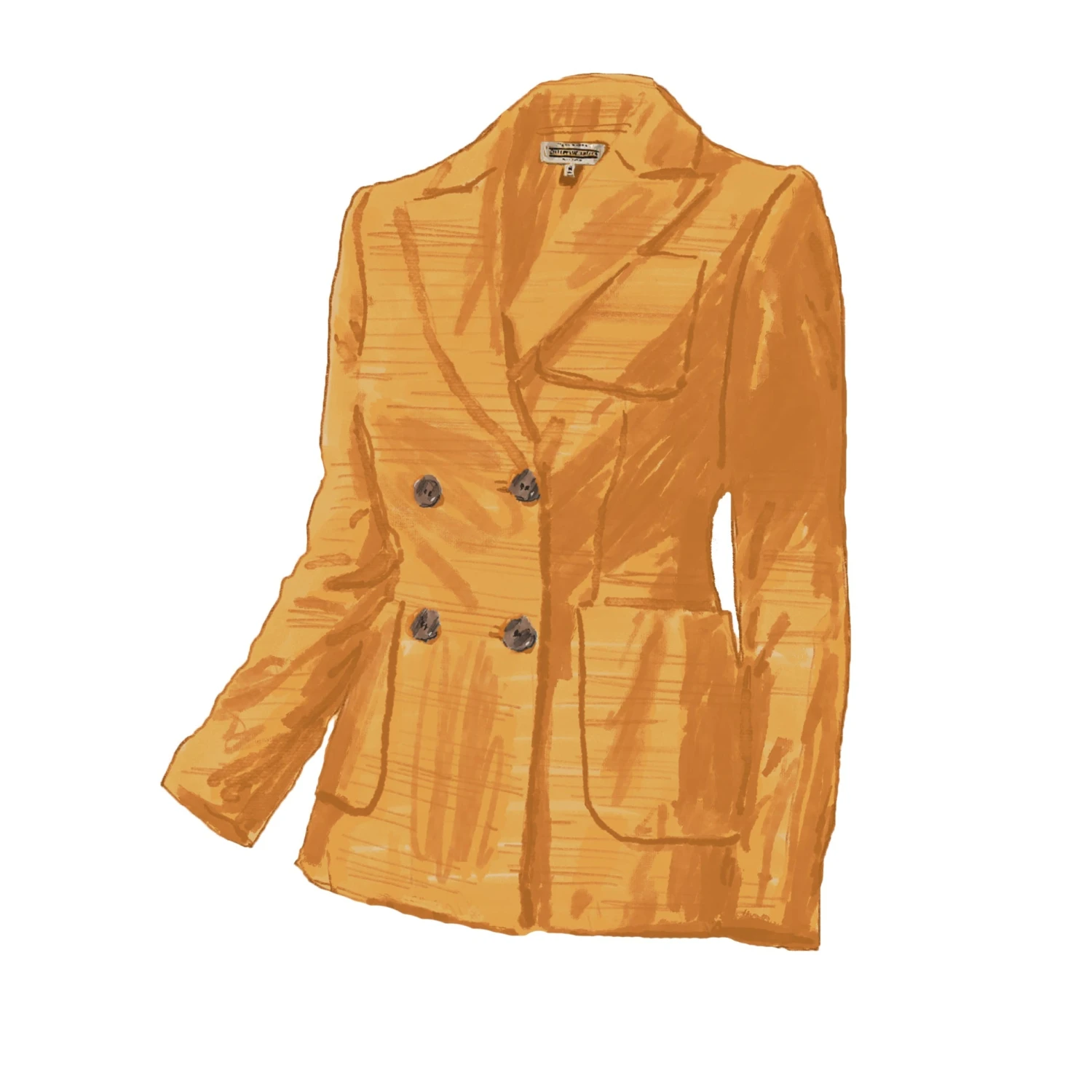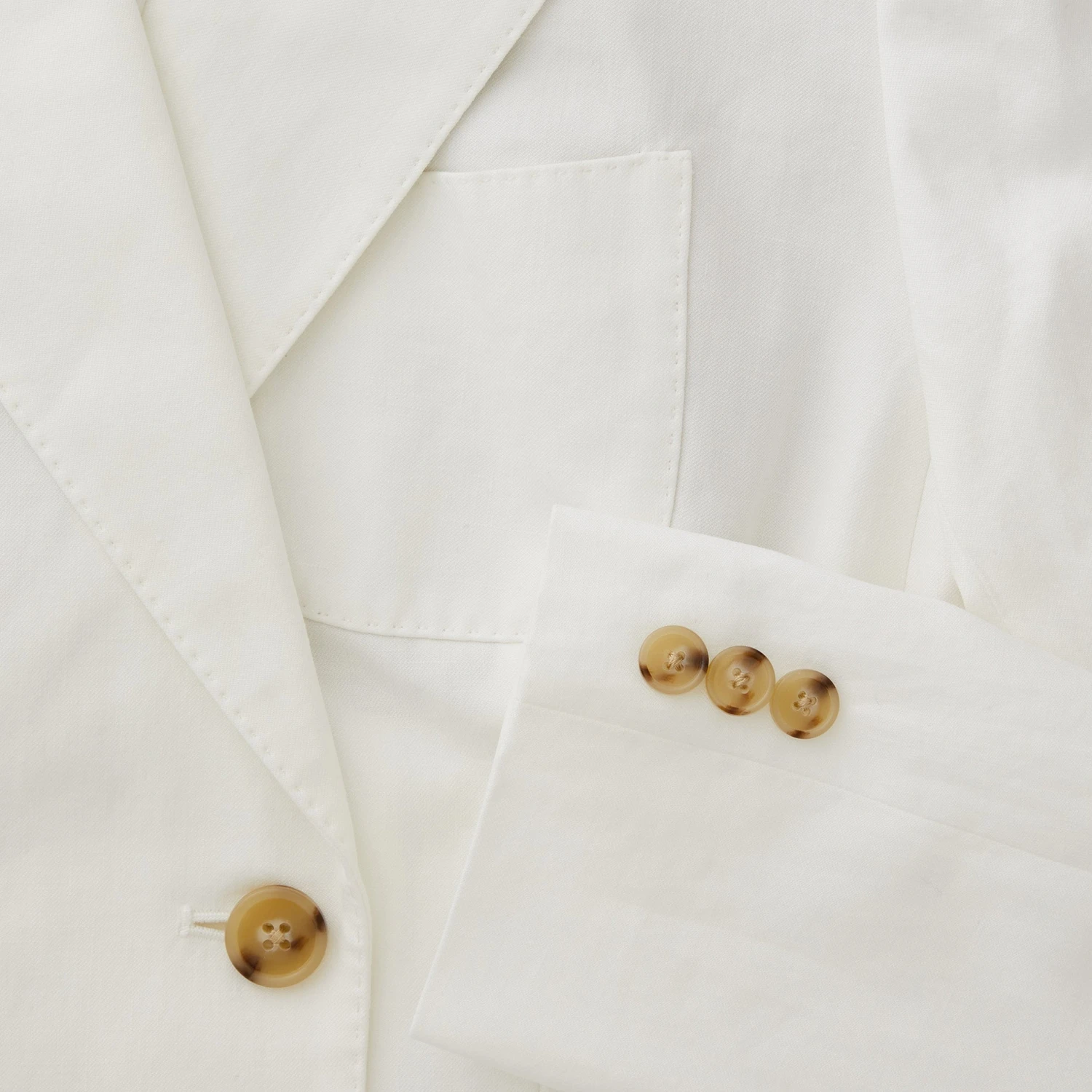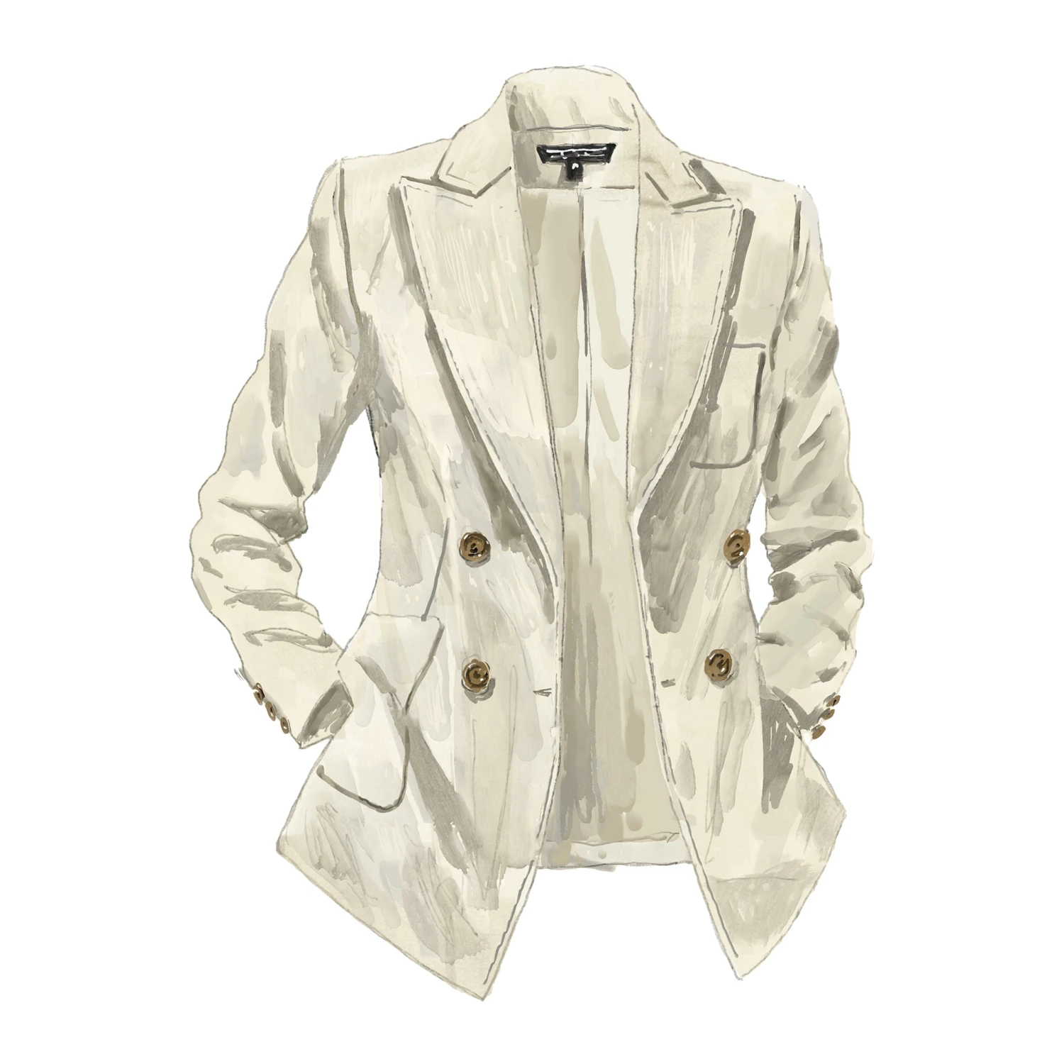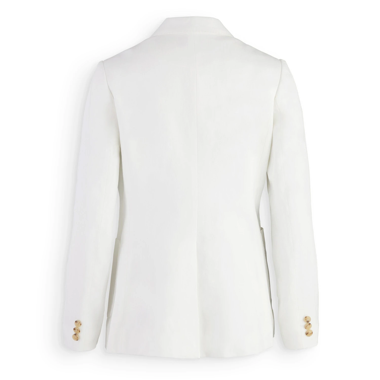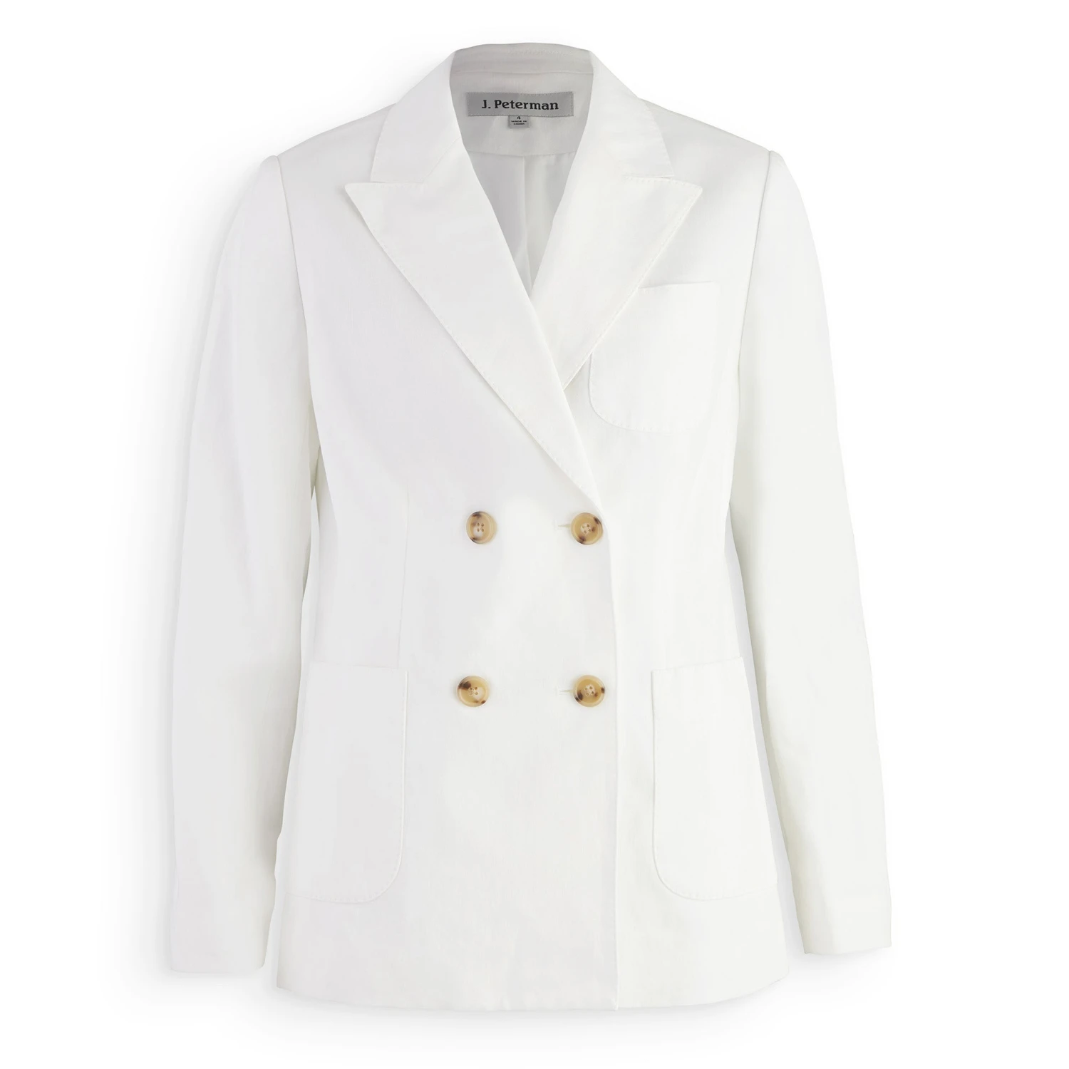 Double-Breasted Linen Blazer (No. J6439) with wide peak lapels in a seasonally-perfect linen cotton blend. Slim-fit suiting lengthens and slims. Single back vent. Patch pocket at left breast and two front patch pockets at waist. Four faux horn urea buttons at center front, three at each cuff. Lightweight poly viscose lining. Imported.