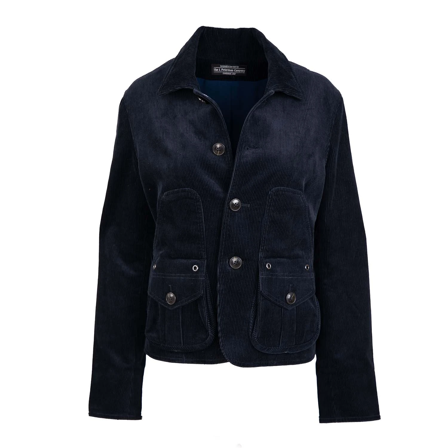 English Hunting Jacket (No. J8432) made from premium 9-wale cotton corduroy. Smartly fitted, nipped in at the waist. Dyed-to-match buttons and gunmetal eyelets. Two box-pleat front pockets provide generous storage and style points for days. Poly lining. Imported.