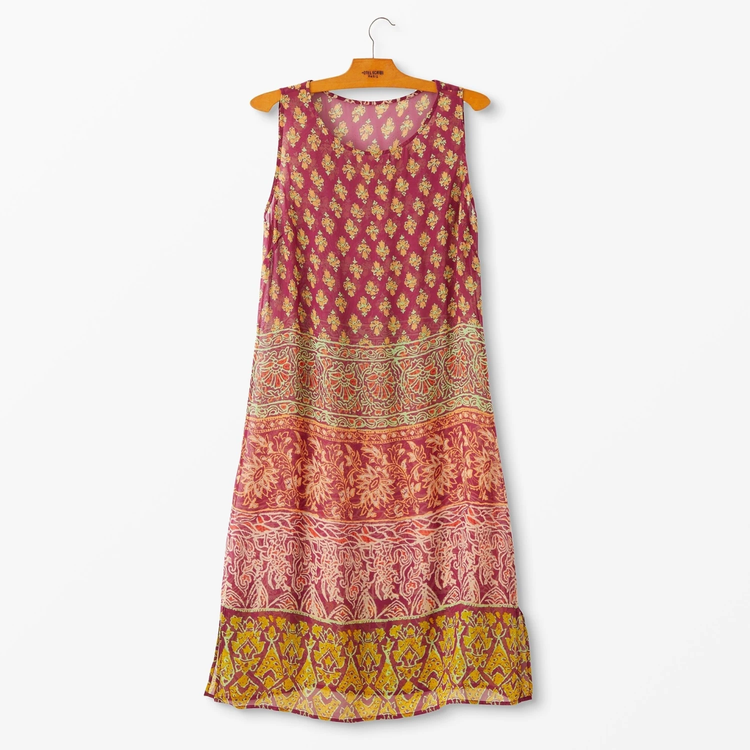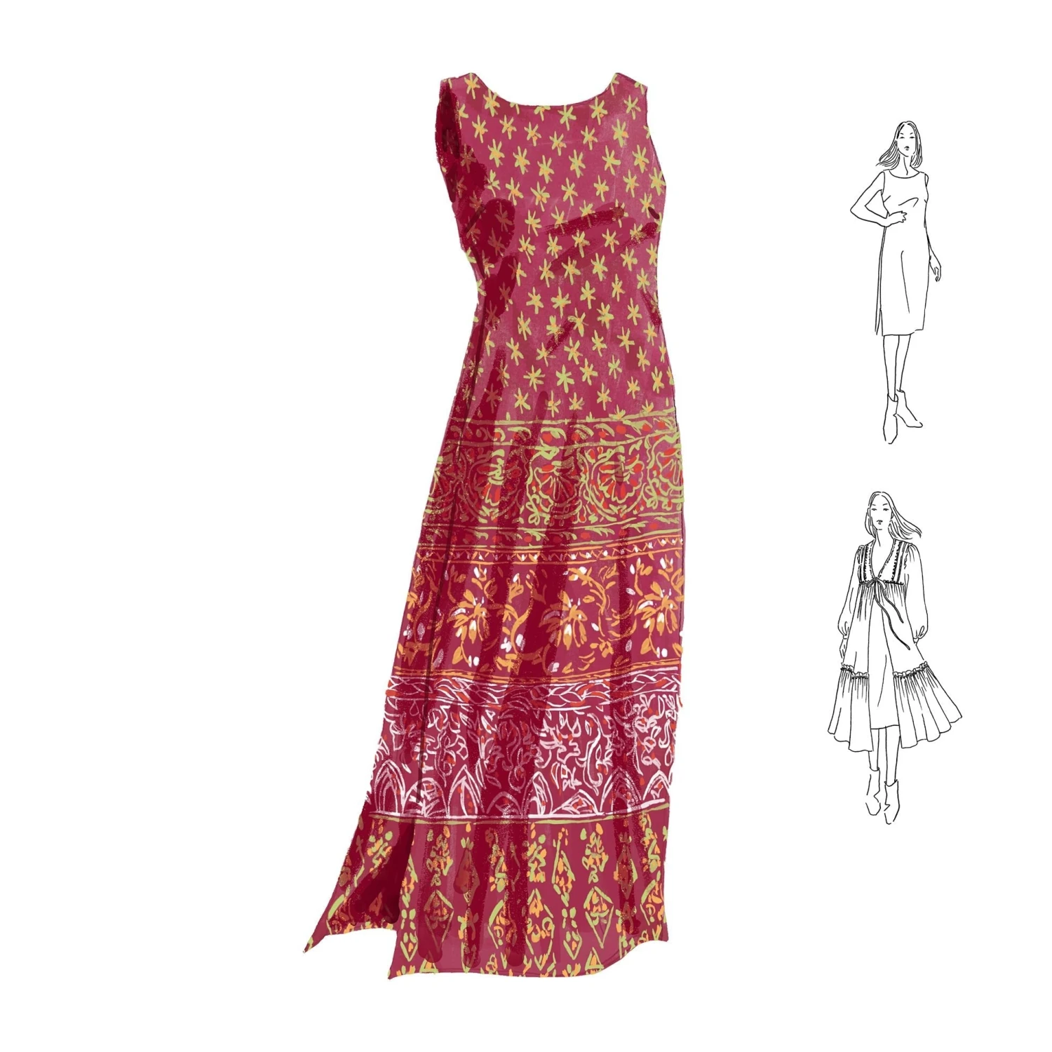 Follow the Band Dress and Cover-up Set (No. J8269). A stunning combination of beautiful patterns and colors. The top layer is a 100% viscose, long-sleeve cover-up with a self-fabric tie to create a flattering empire waist. The foundation layer is a body-skimming shift dress in the same vibrant fabric. Imported.