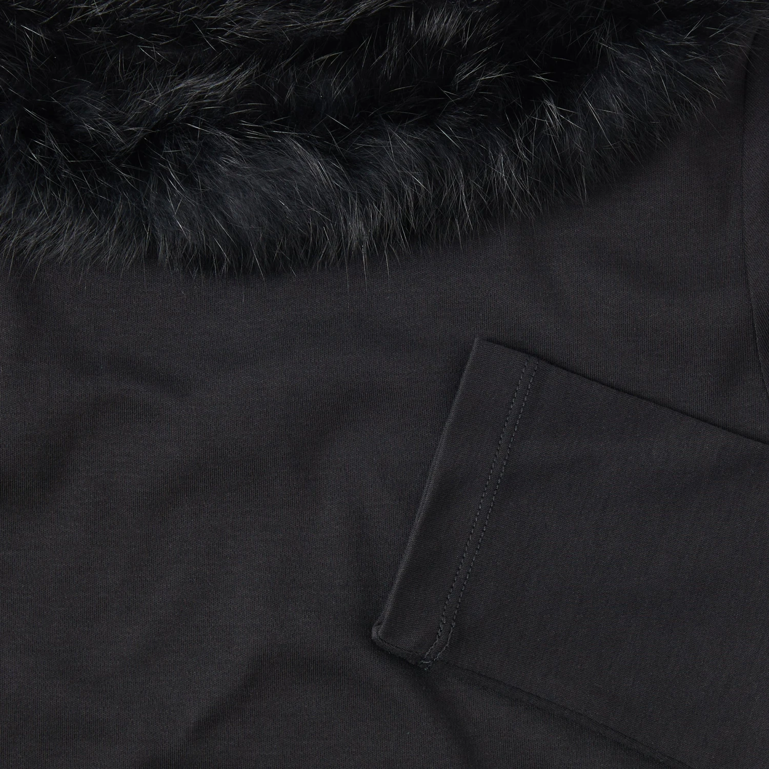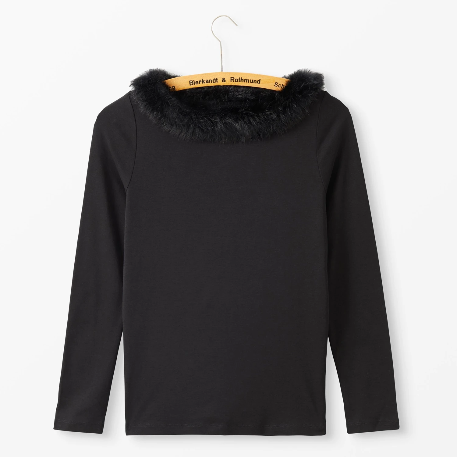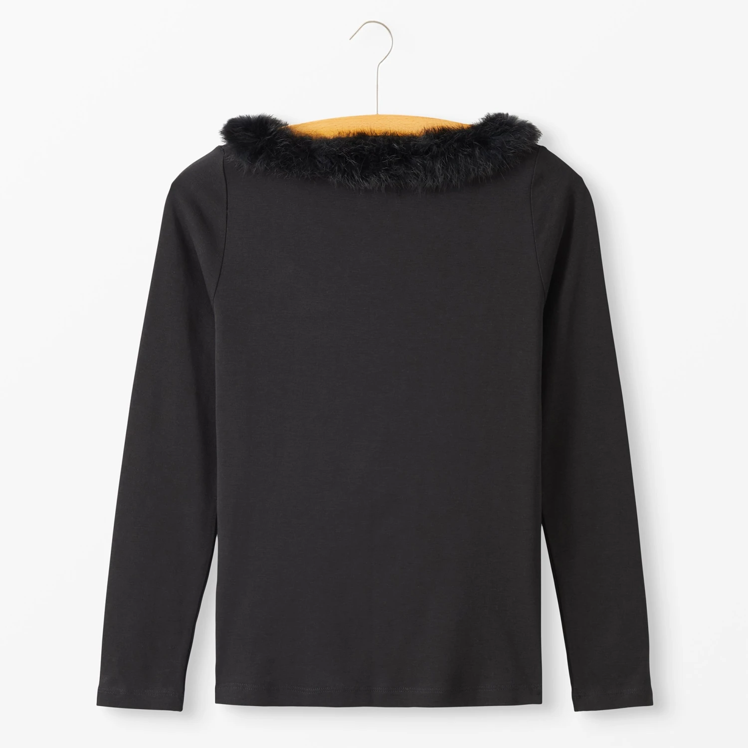 Fur Collar Knit Top (No. J7791). Long-sleeve 100% interlock cotton top with luxurious, cozy rabbit fur trim along neckline. Slim fit to hip. Memorable. Imported.