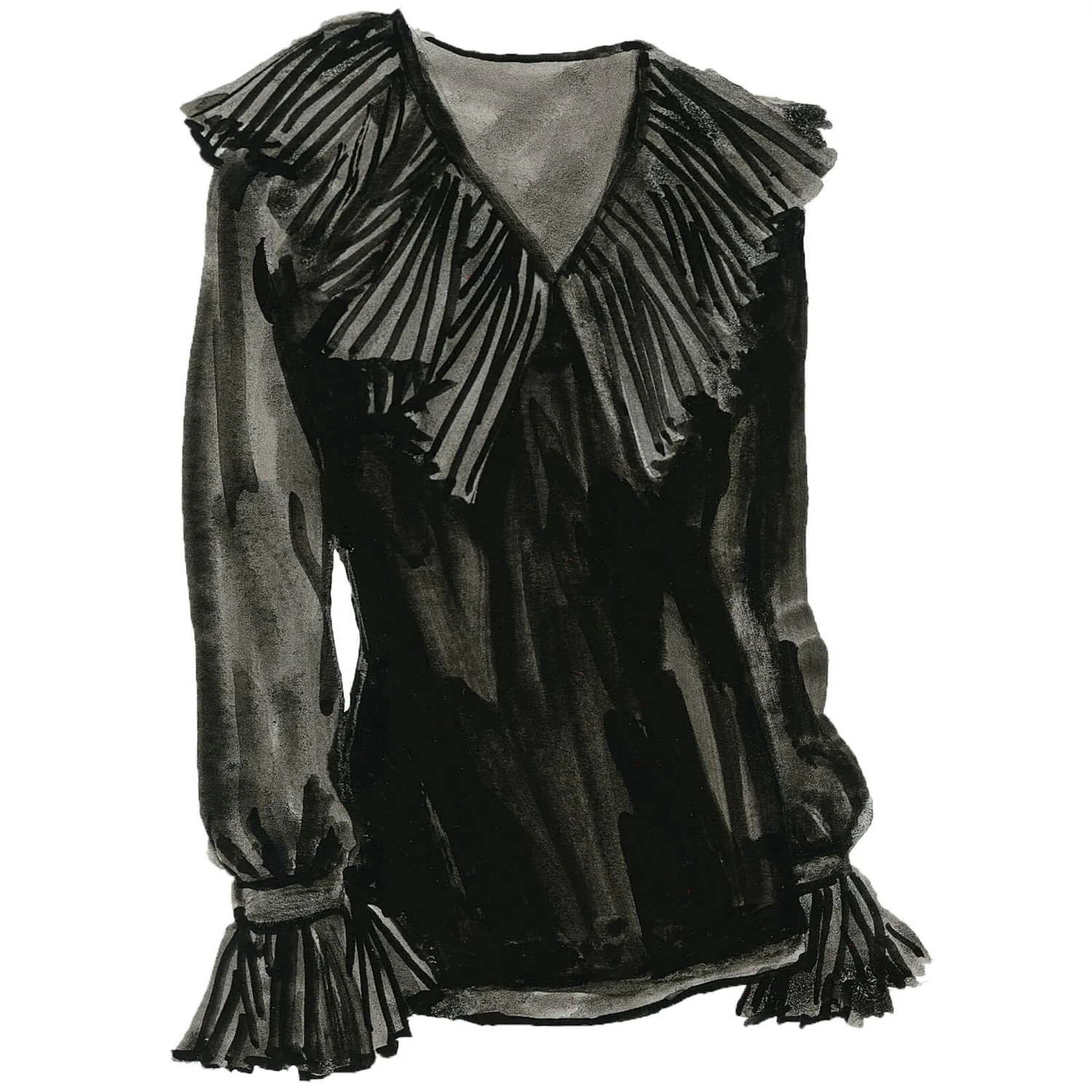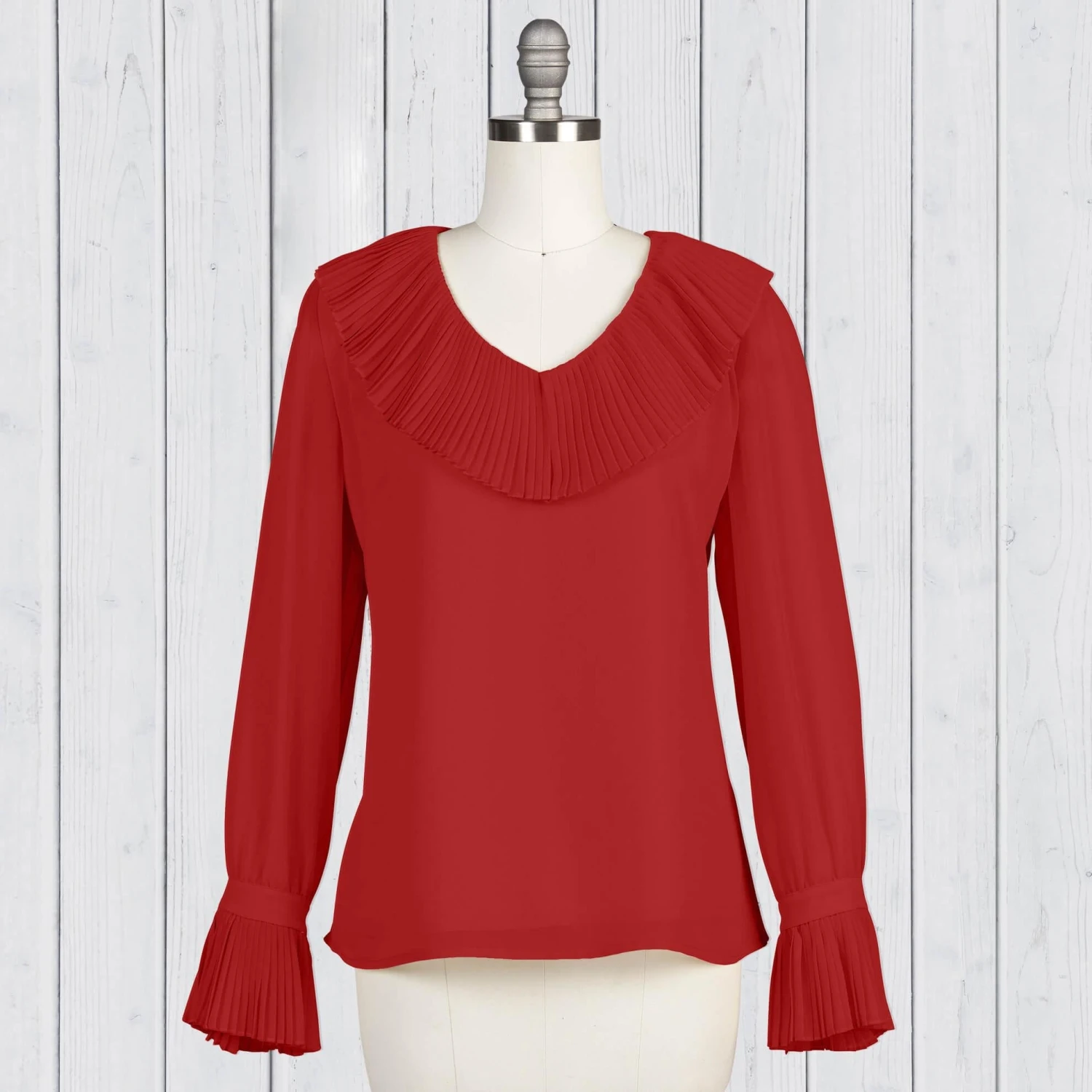 Glamorous V-Ruffle Blouse (No. 6199). Sultry poly georgette blouse with pearlized buttons. 1940s-era V-shaped ruffles at the collar with pleated (and adjustable) cuffs that look fantastic when you gesture emphatically. Figure-flattering bust darts. Lined through the body, unlined in the sleeves. Imported.