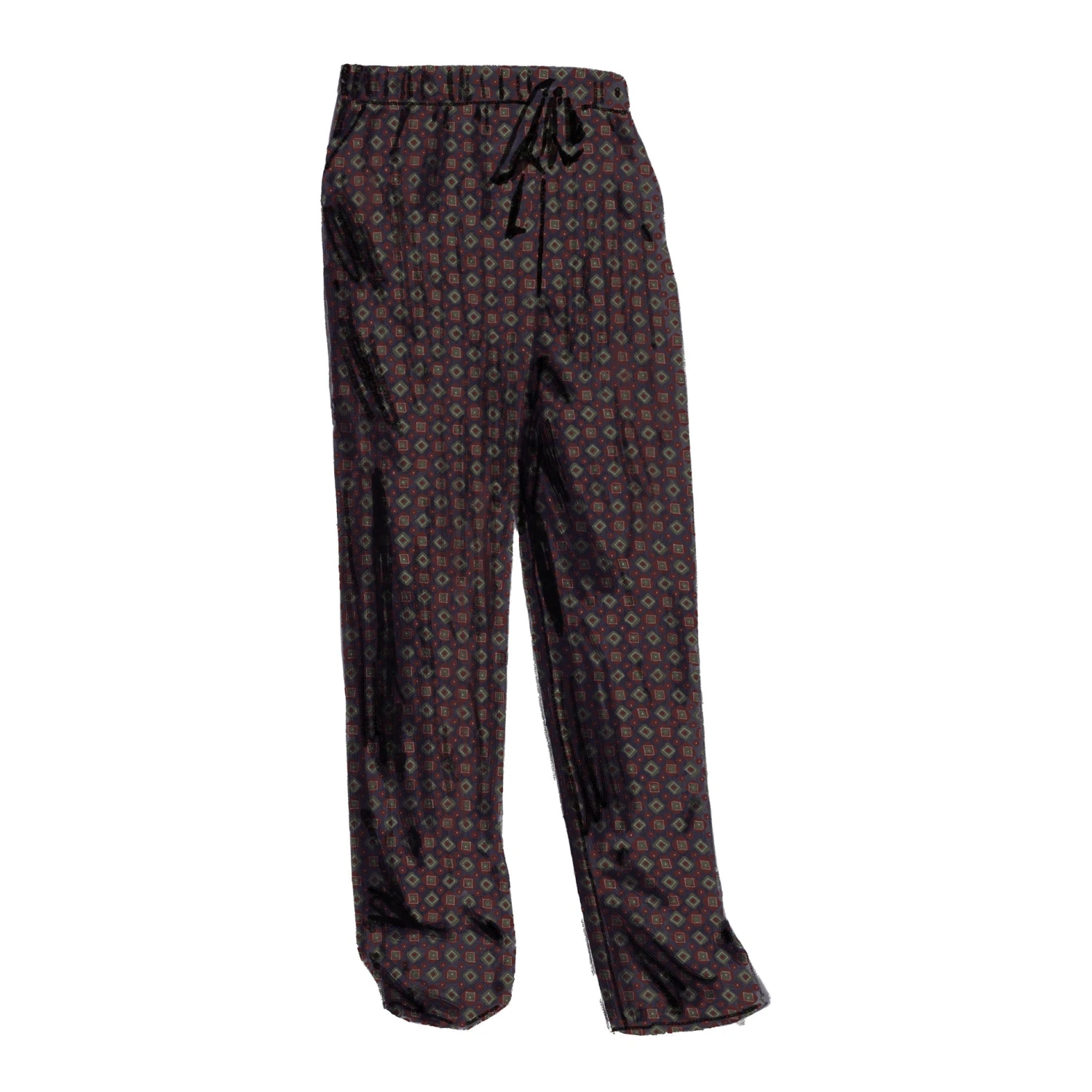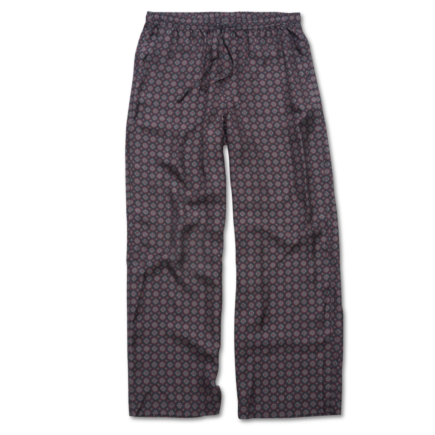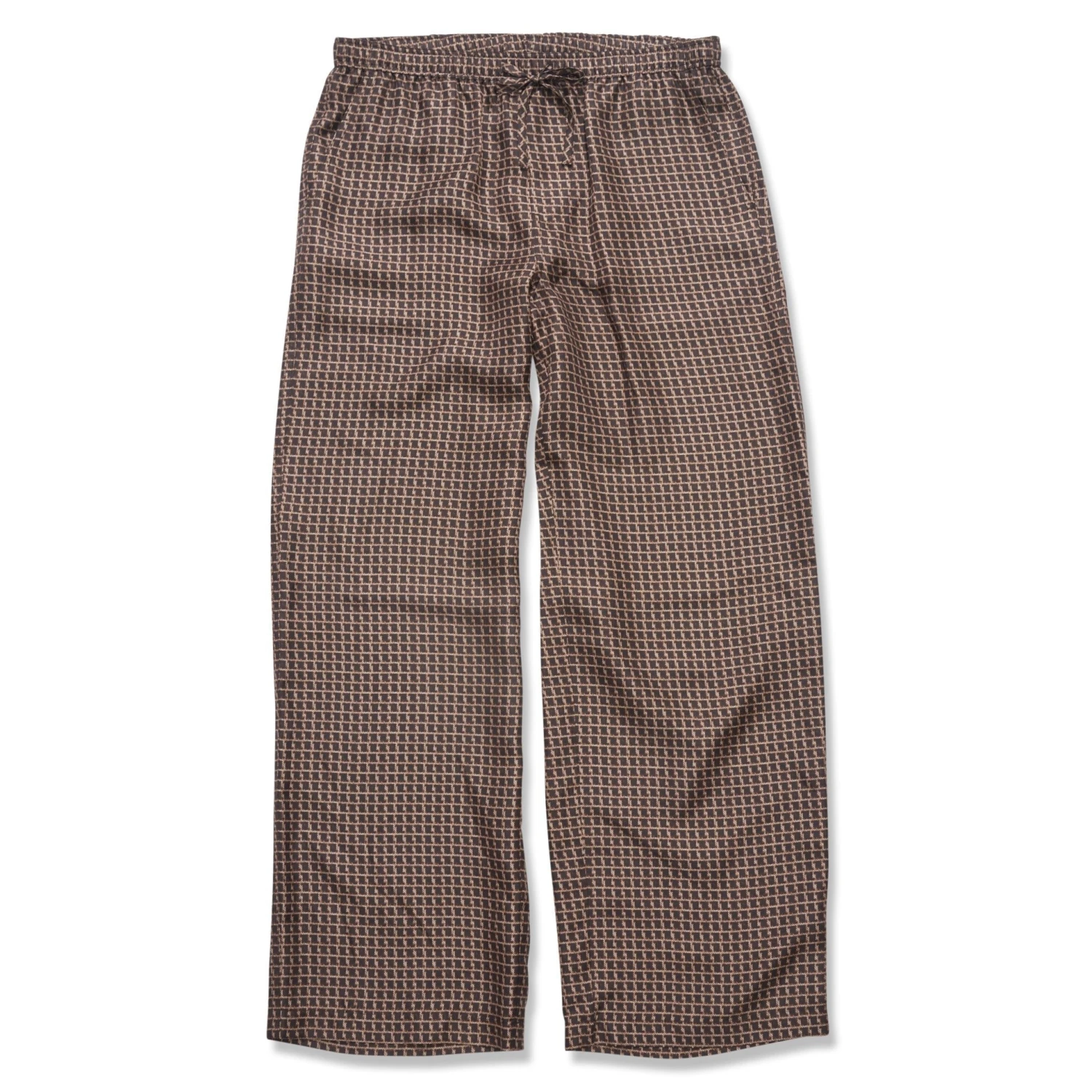 Great Room PJ Pant (No. 7132). Relaxed drawstring pajama pant. Brown print is reminiscent of early 20th century art-deco-style floor tiling. Navy print is a classic foulard. Pocket edge detailed with contrast piping. Imported.