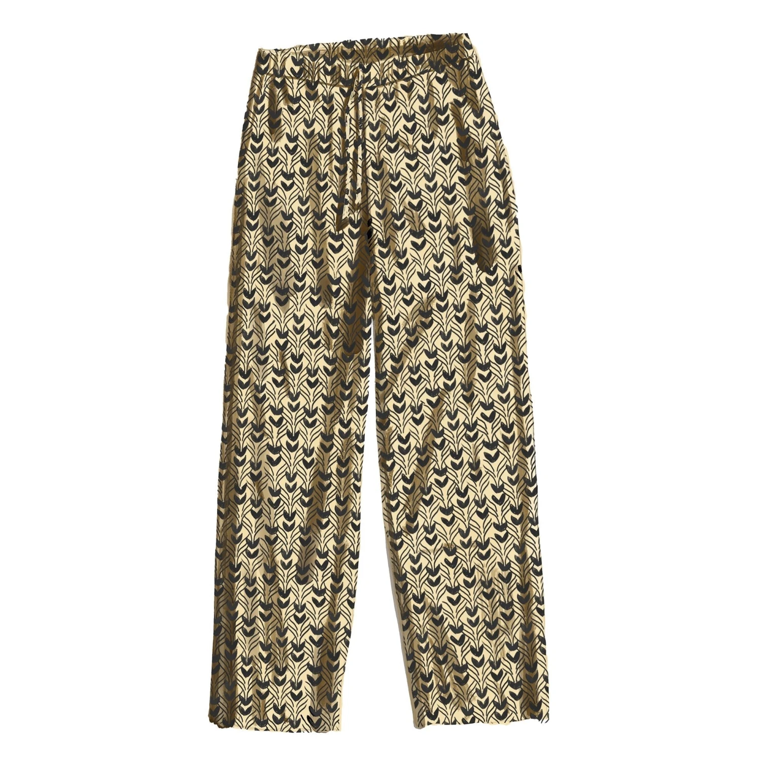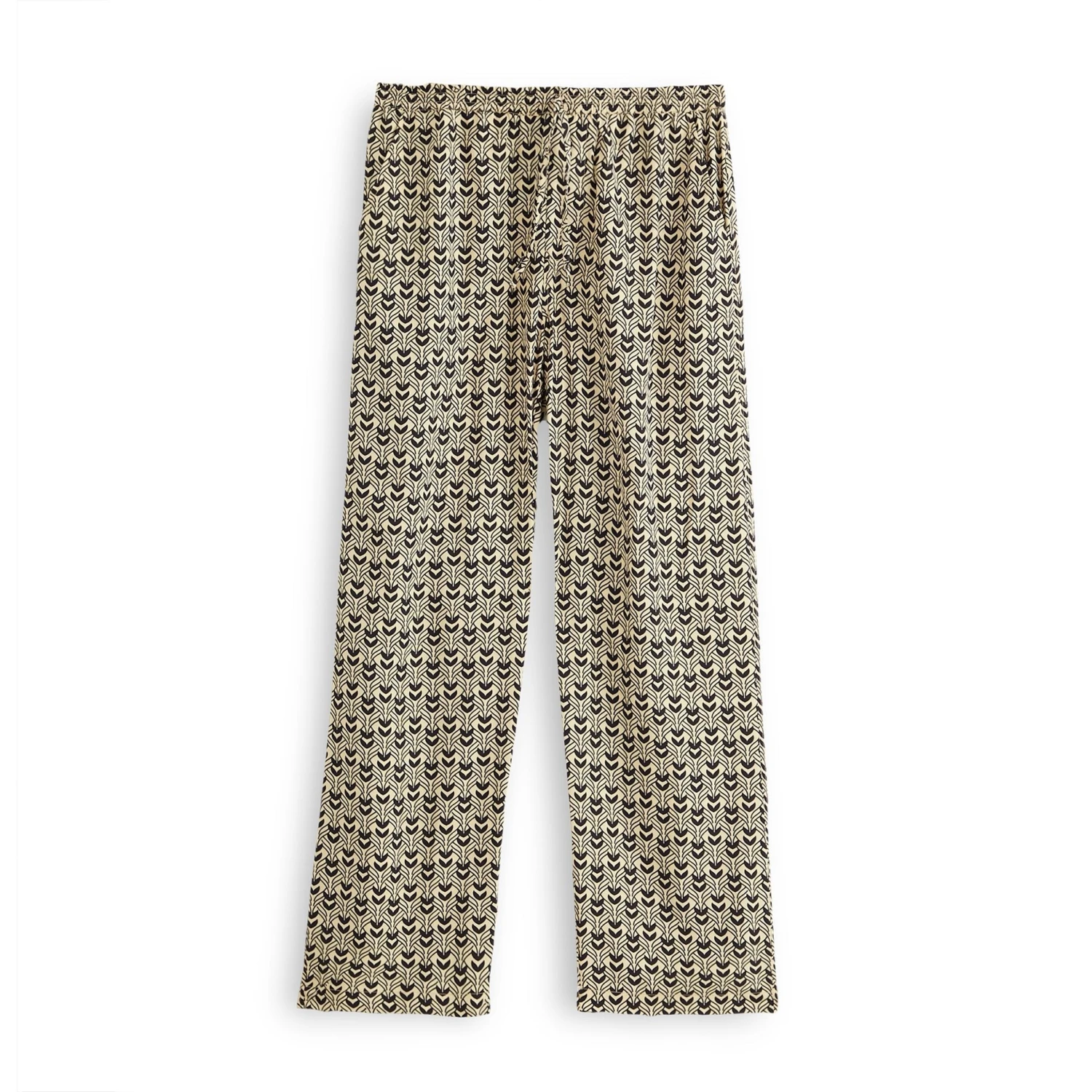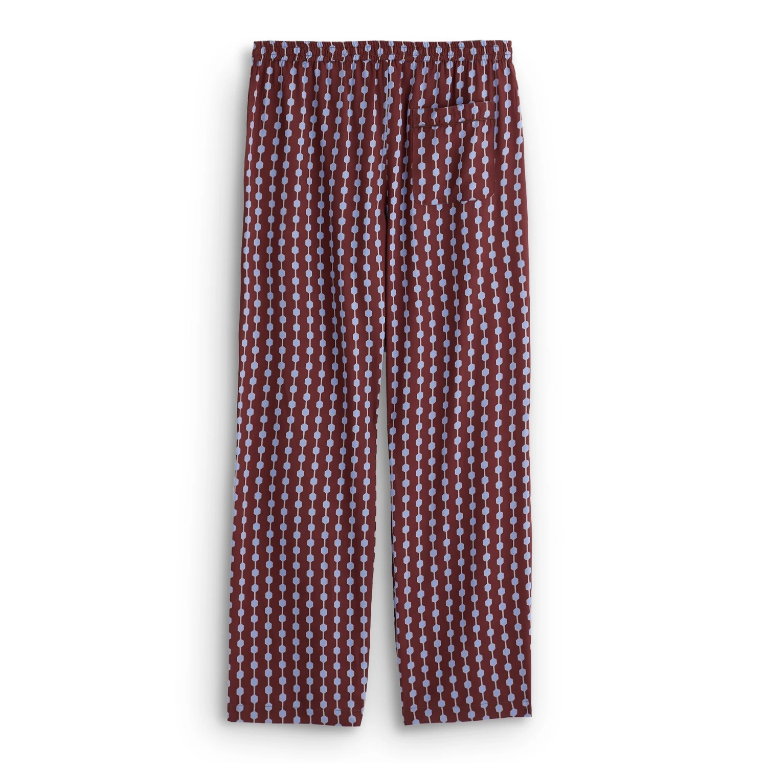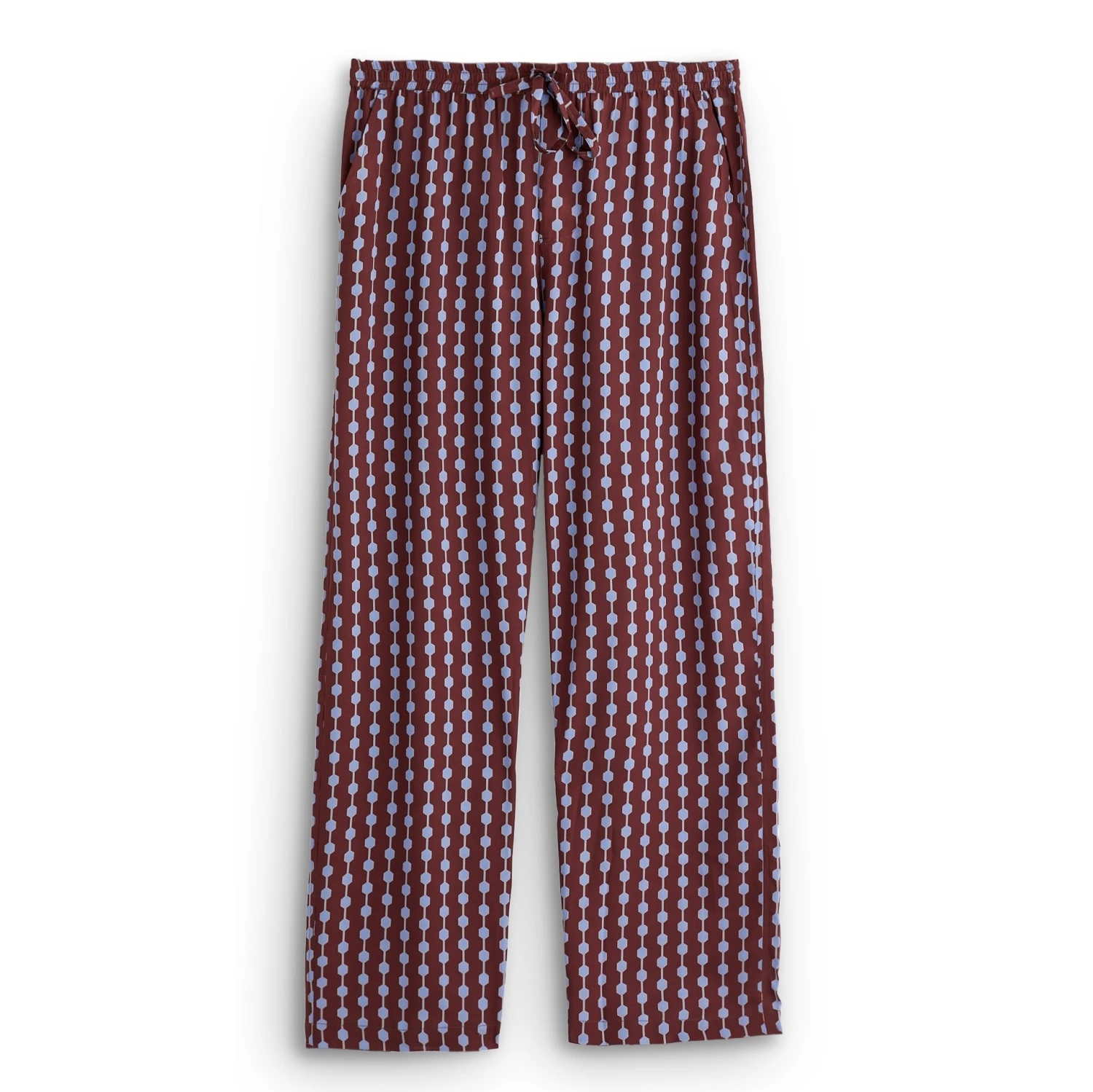 Great Room PJ Pant (No. 7132). Relaxed drawstring pajama pant. Brown print is reminiscent of early 20th century art-deco-style floor tiling. Navy print is a classic foulard. Pocket edge detailed with contrast piping. Imported.