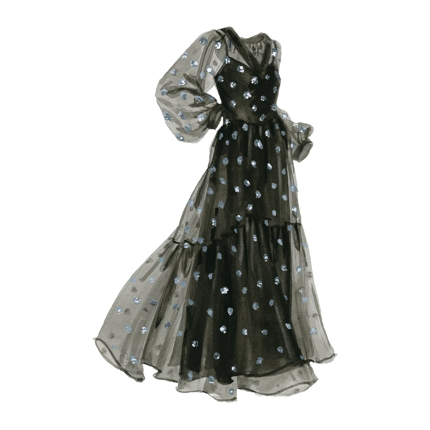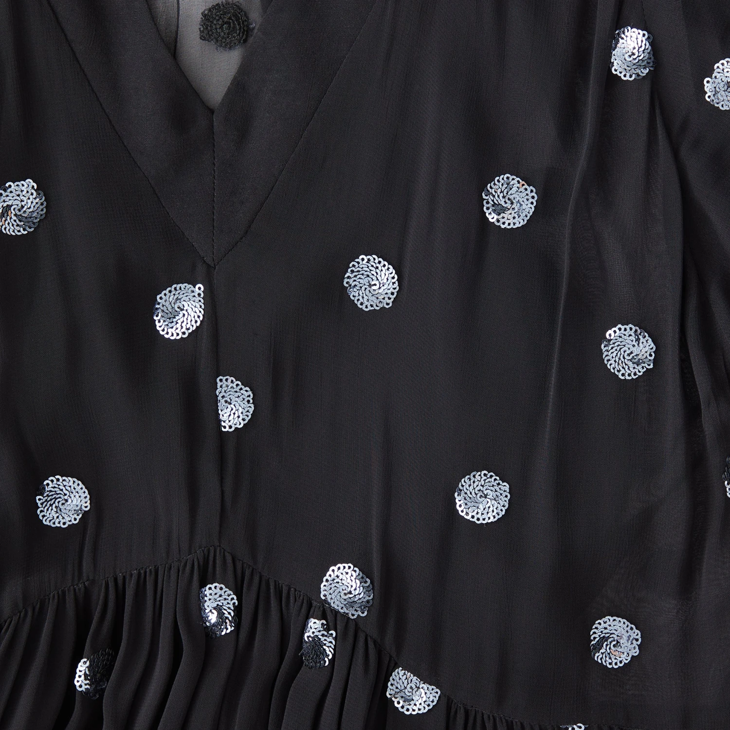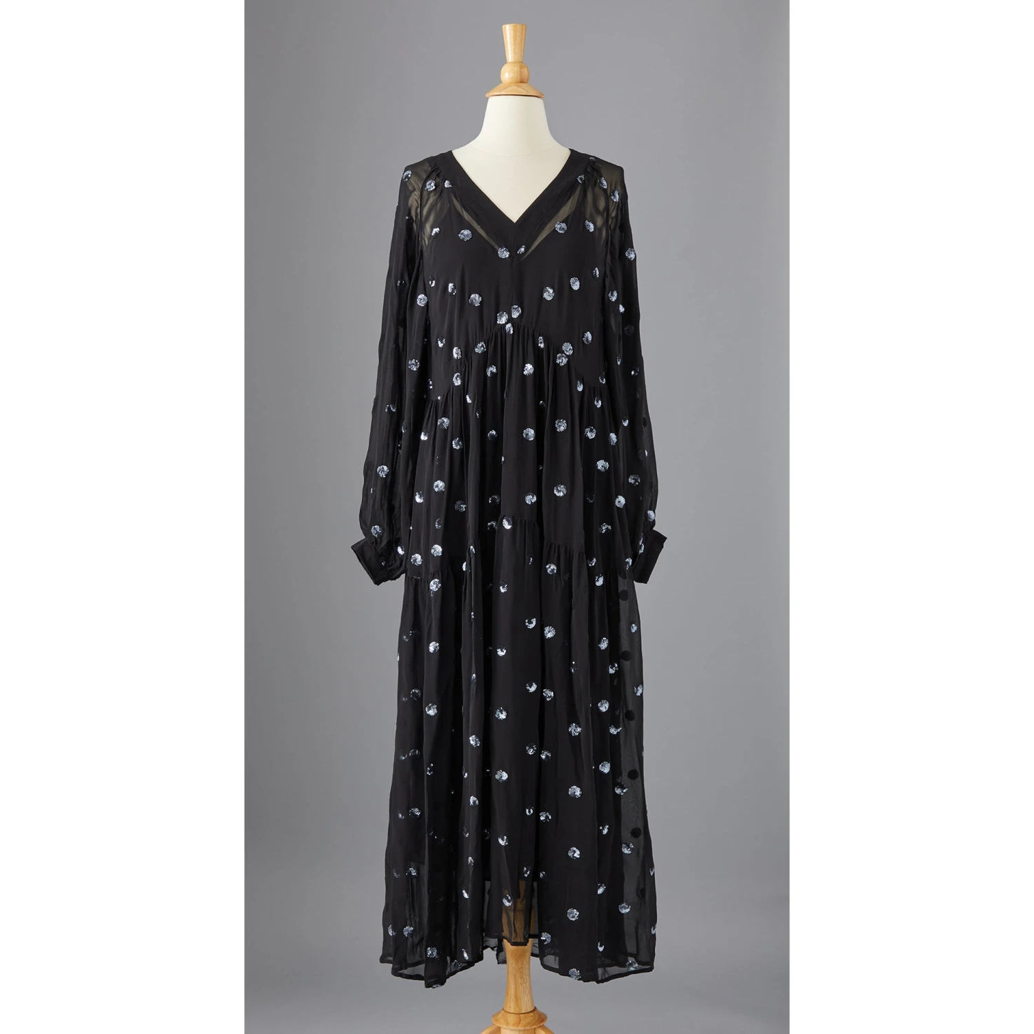 In the Spotlight Evening Dress (No. J8033). The beautifully sheer overlay of this evening dress is scattered with sequins, and the dropped empire waist features wonderful shirring. The tiered skirt lifts and flows on a whim. Additional tier with shirring at the hip line. 100% viscose. V-neckline. Even more shirring at sleeve cuffs. One chalk button at each cuff. Full slip with slip adjusters with two small snaps at each shoulder. Imported.