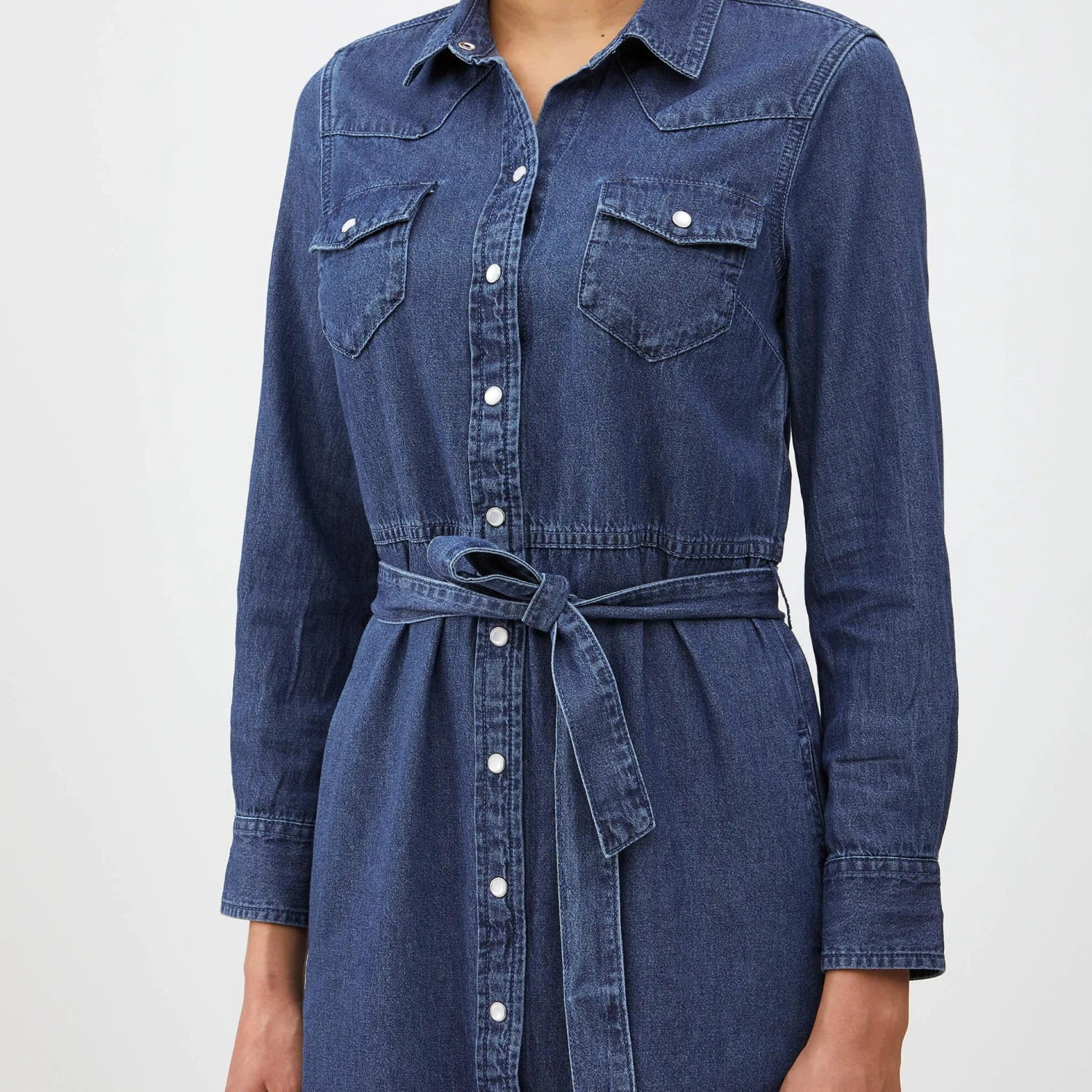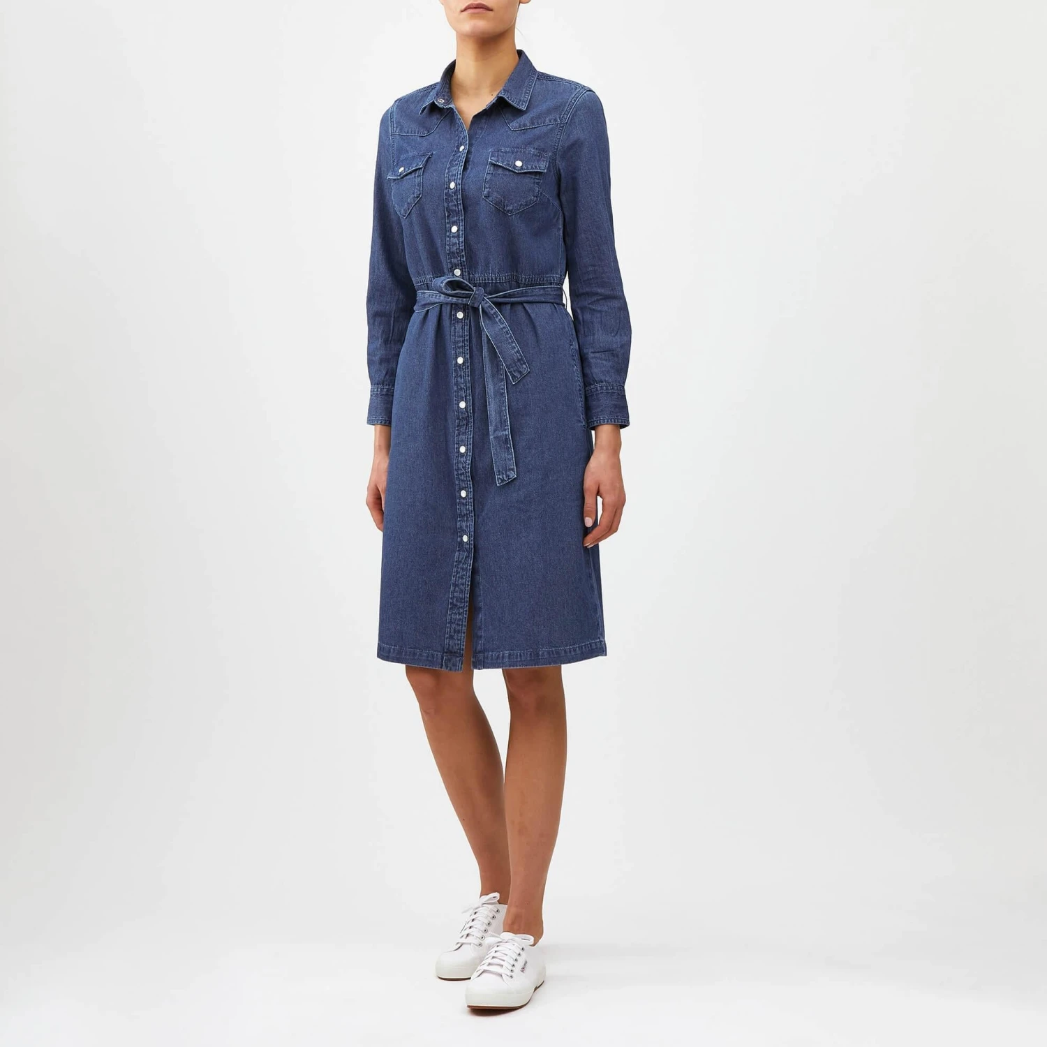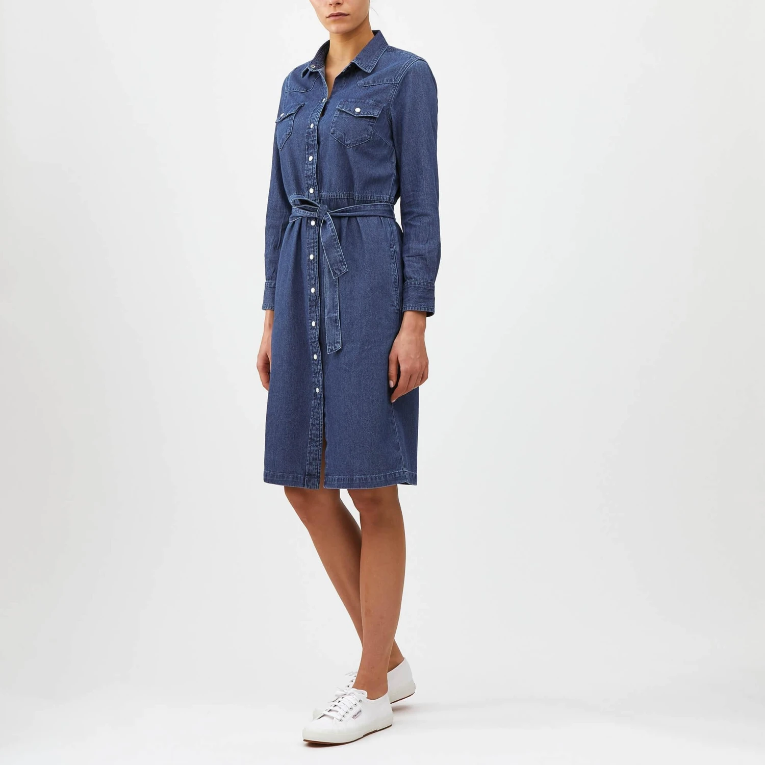 Hedonistic Shirtdress. 7.6 oz cotton with some added stretch. Garment-dyed. 13 buttons down the front allow for varying degrees of innocence. self-fabric belt, chest pockets, buttoned cuffs, calf length. In Khaki, with band collar (No. 6485) and Indigo, with stand-up collar (No. 6484). Imported.