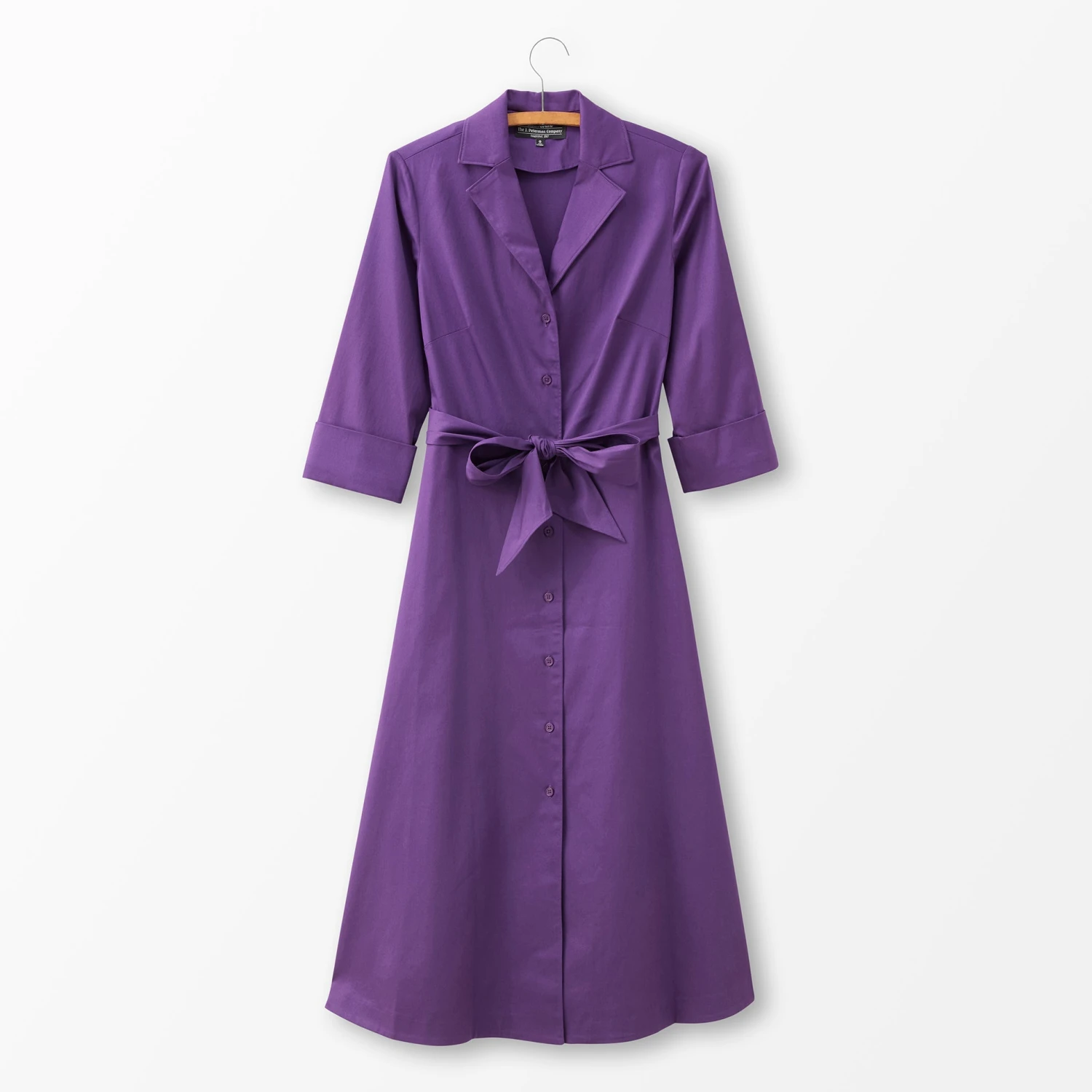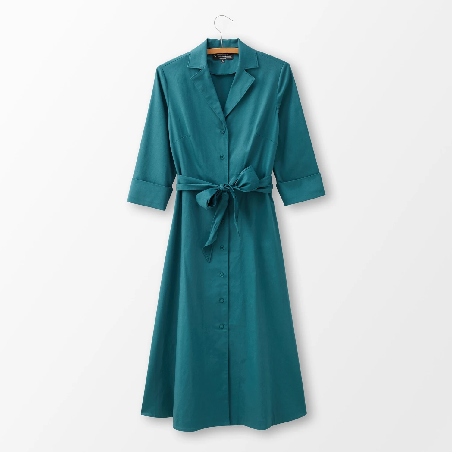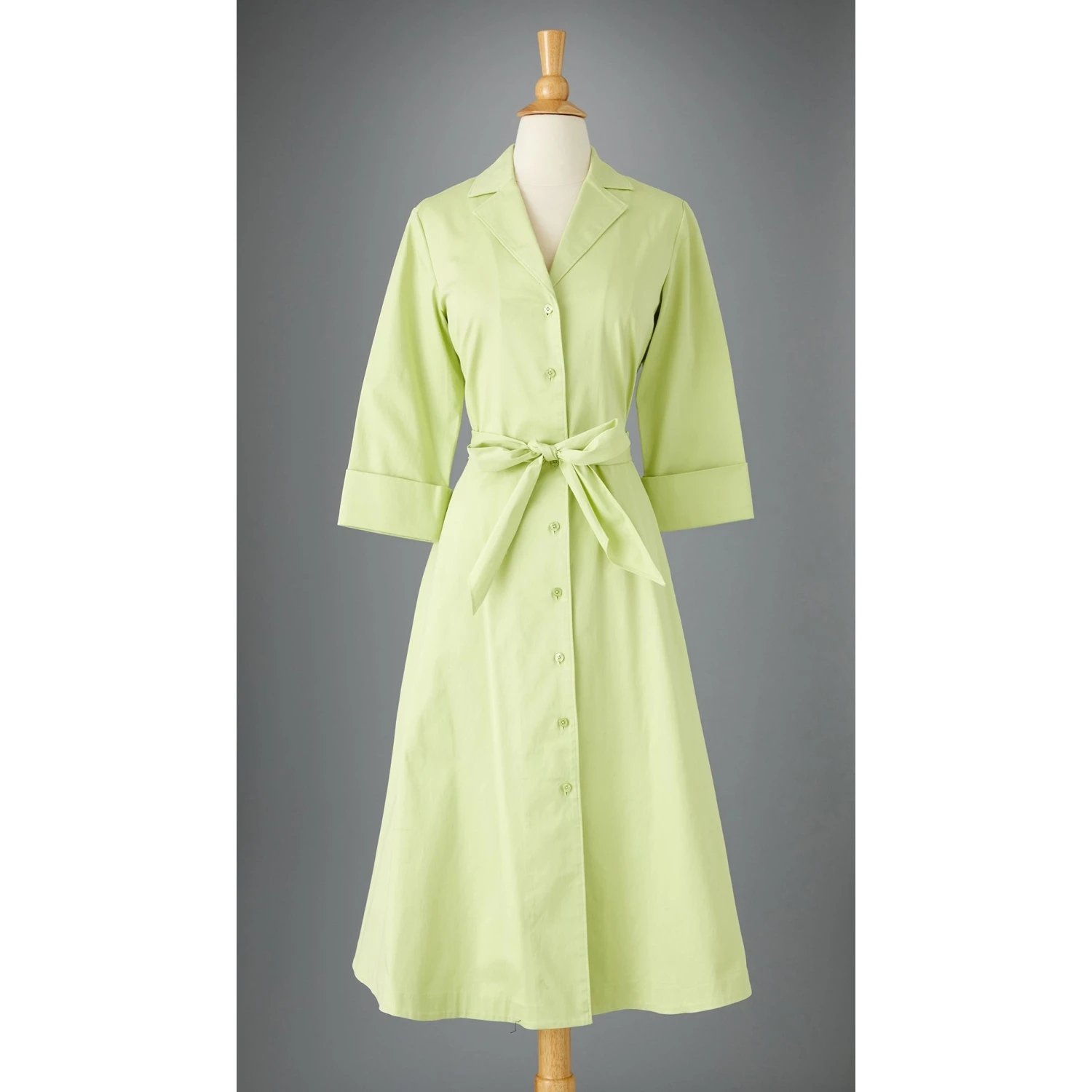 Long-Sleeve 1947 Dress (No. J6778). Deliverance from the boxy, skimpy cut of WWII utility fashions. Splendid cotton blend with the same swinging sweep and sash ties as the short-sleeved version. Mid-calf length. Same V-neck bodice, darts at bust and waist. Same notched collar to stand up pertly if you wish.