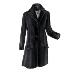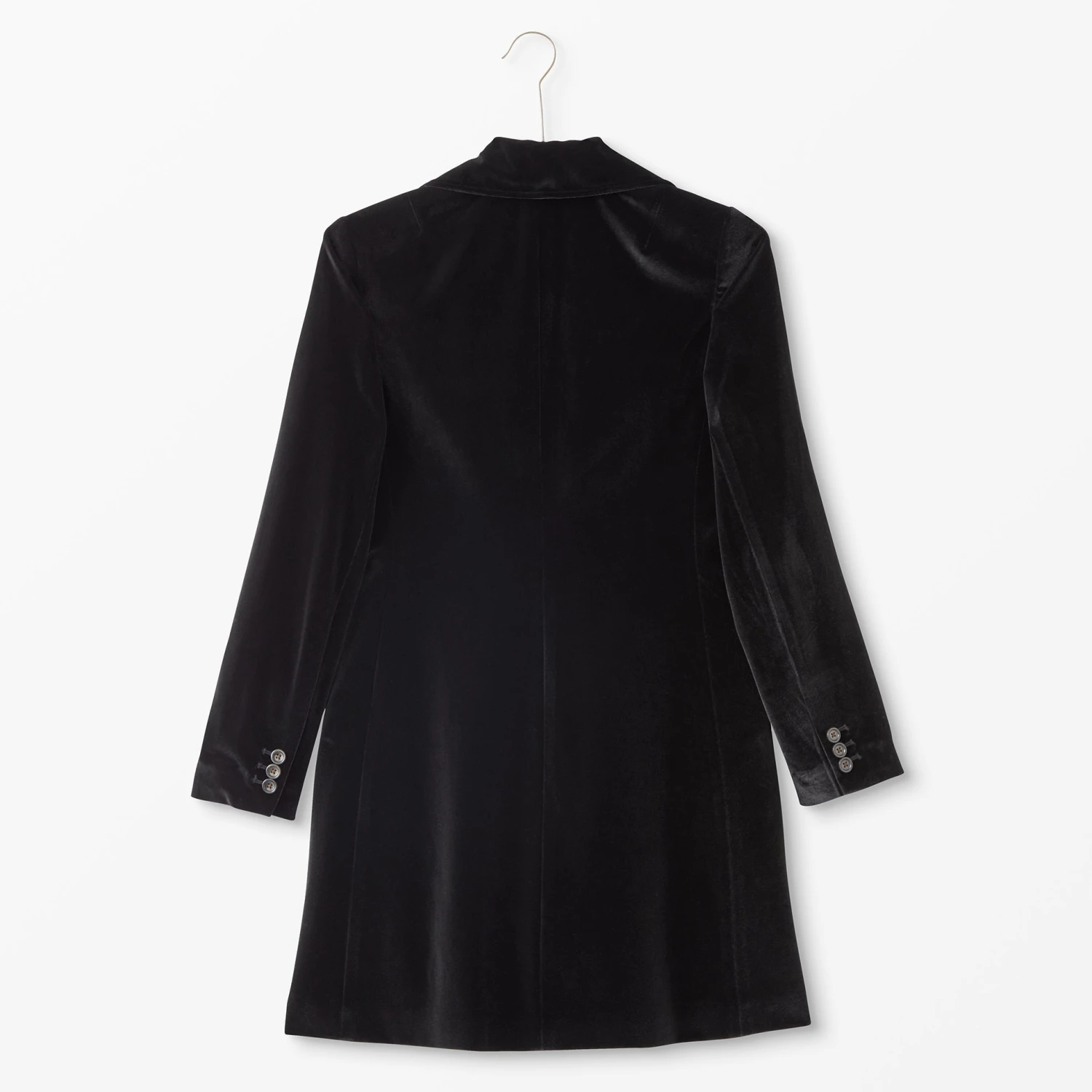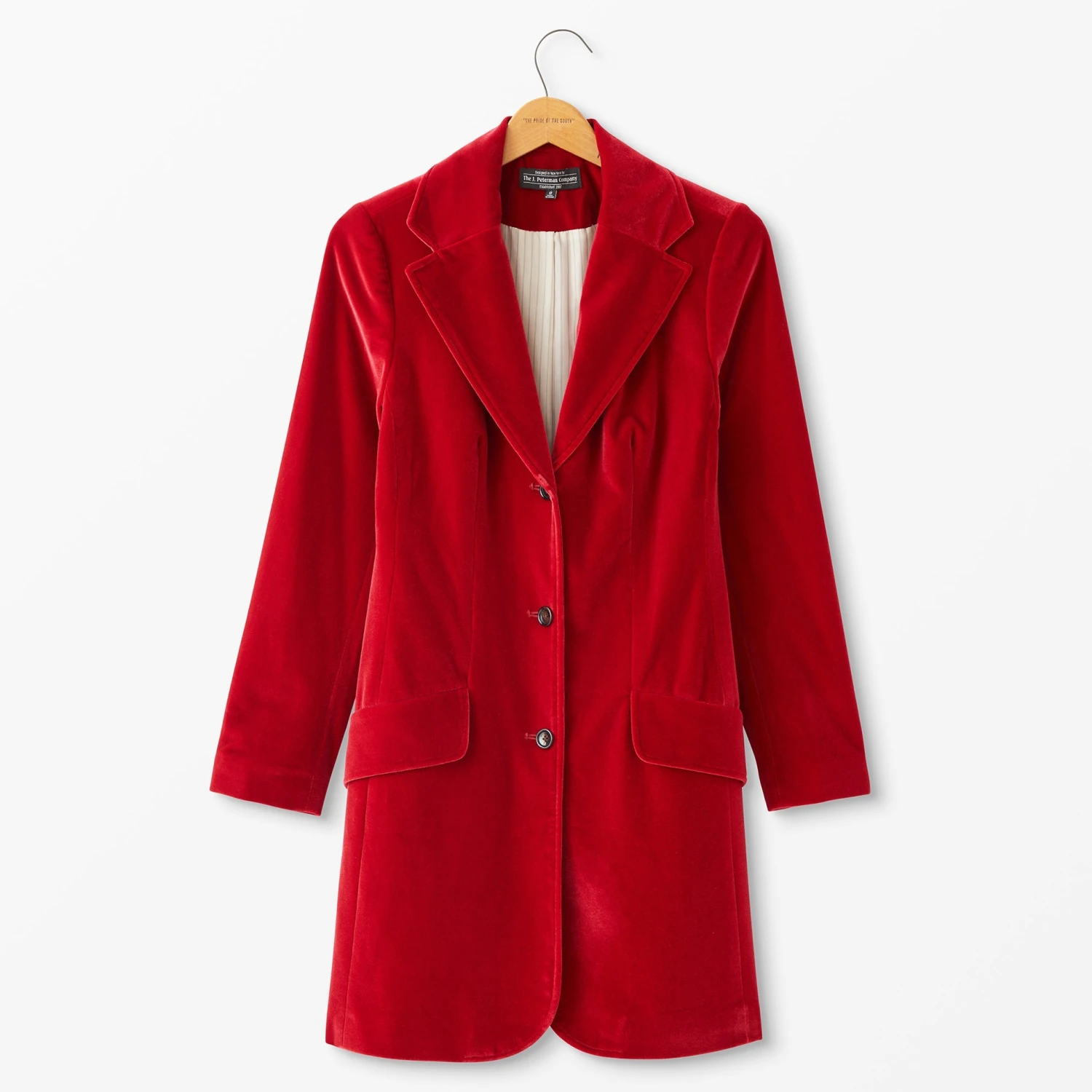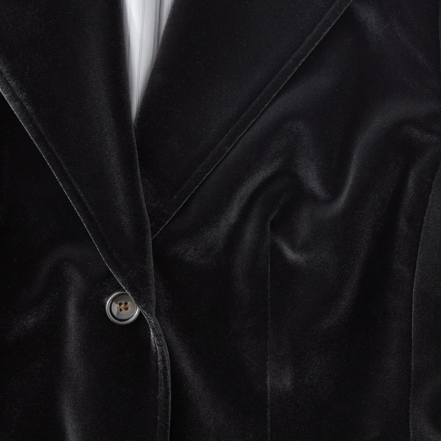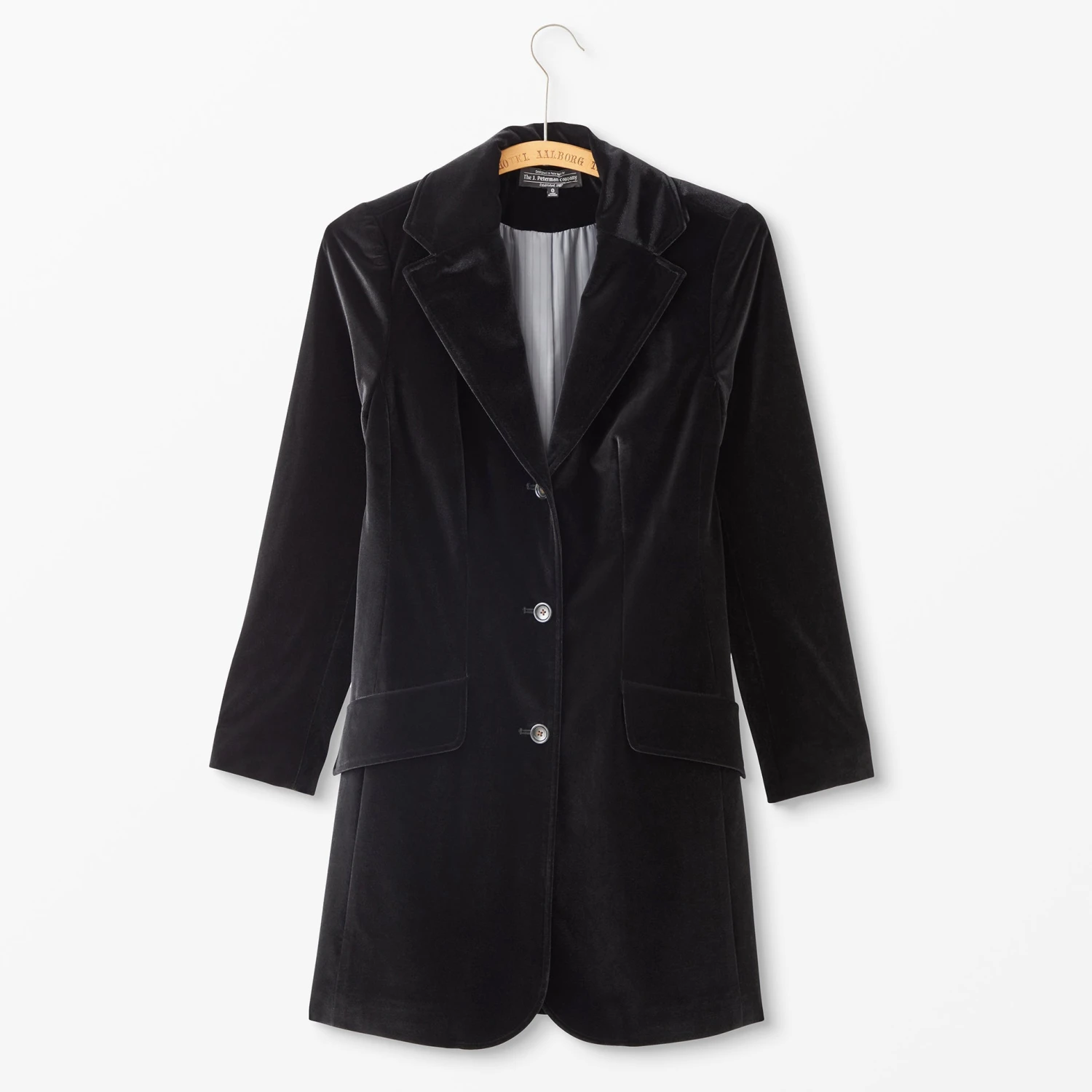 Long Velvet Blazer (No. 7425). Sensationally soft velvet blazer. Despite its tailored look (observe slightly nipped-in waist), it’s exceedingly comfortable. Not to mention slimming. Has a notched collar. Four-button closure. Buttons at cuffs. Flap pockets on front. Double vents at back. Who is that woman in the long velvet blazer? Imported.
