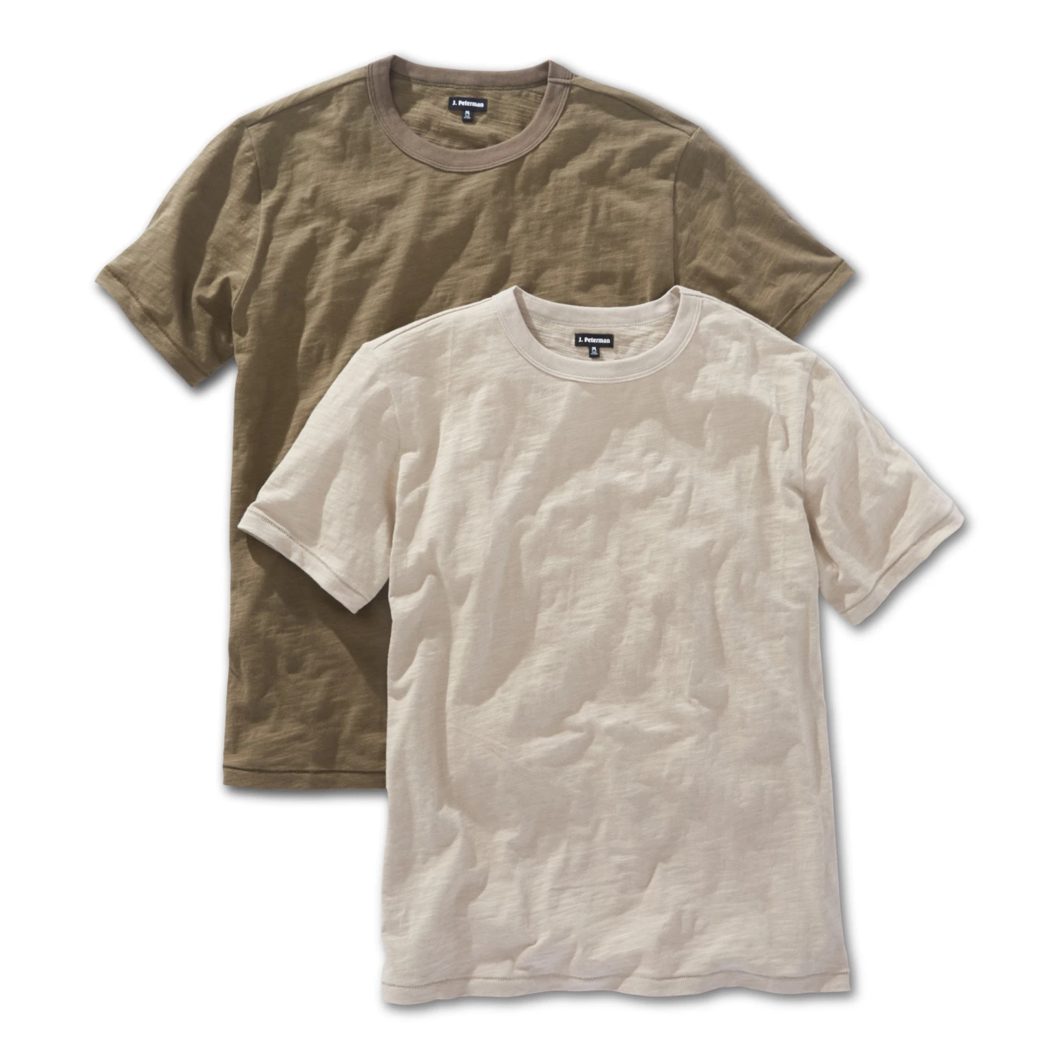 Military Tee 2-Pack (No. J6961). Vintage undershirt design in exceptionally comfortable cotton club jersey. Classic overlock stitching throughout. Bound collar with triple needle stitching. Comes a pack of two. Implies a solid understanding of long-range targets, financial or tactical. For the man who appreciates a good regimental set of t-shirts. Pack of two includes Olive and Chino. Imported.