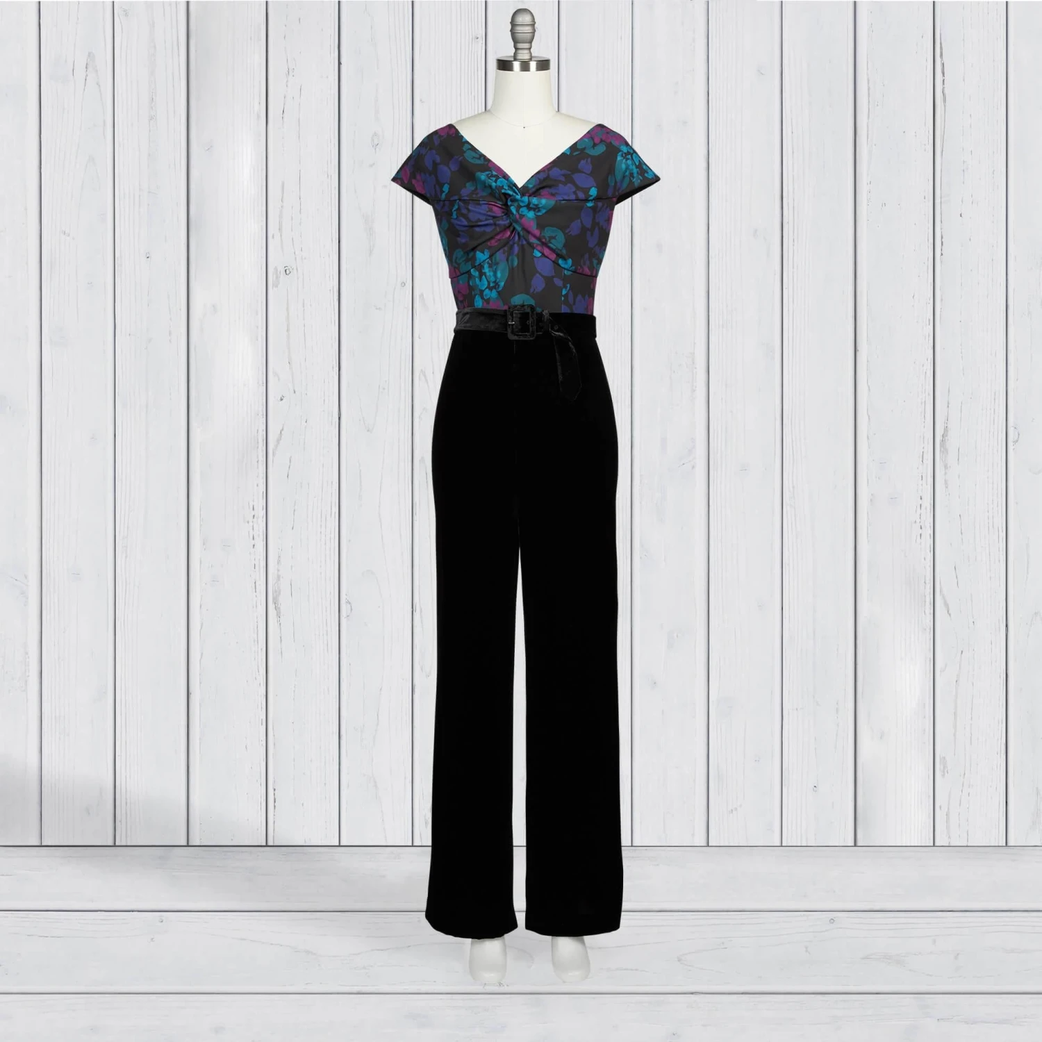 Monte Carlo Jumpsuit (No. 6185). Twist-front floral bodice in a shape-flattering polyester and spandex blend. The bottom and belt are a deliciously luxe silk velvet blend. Imported.