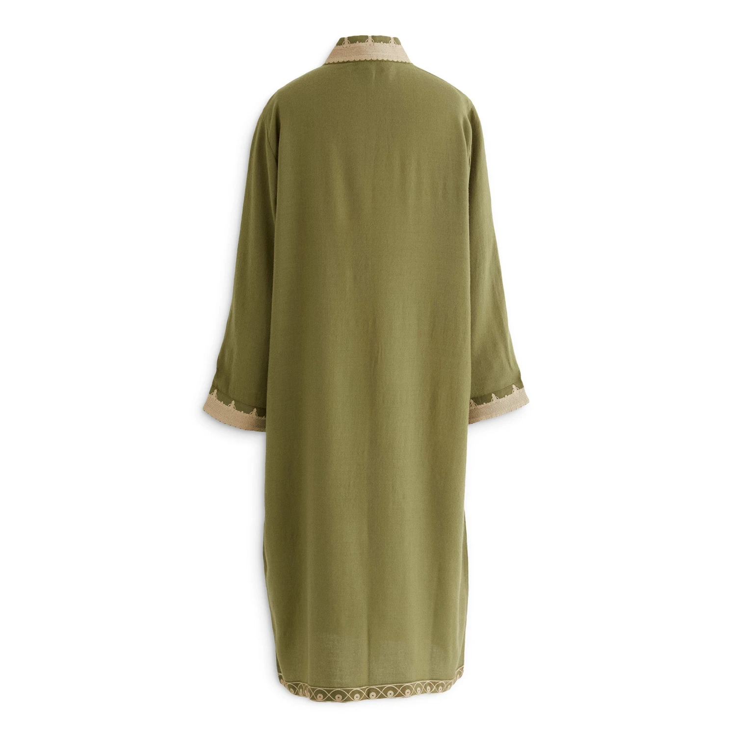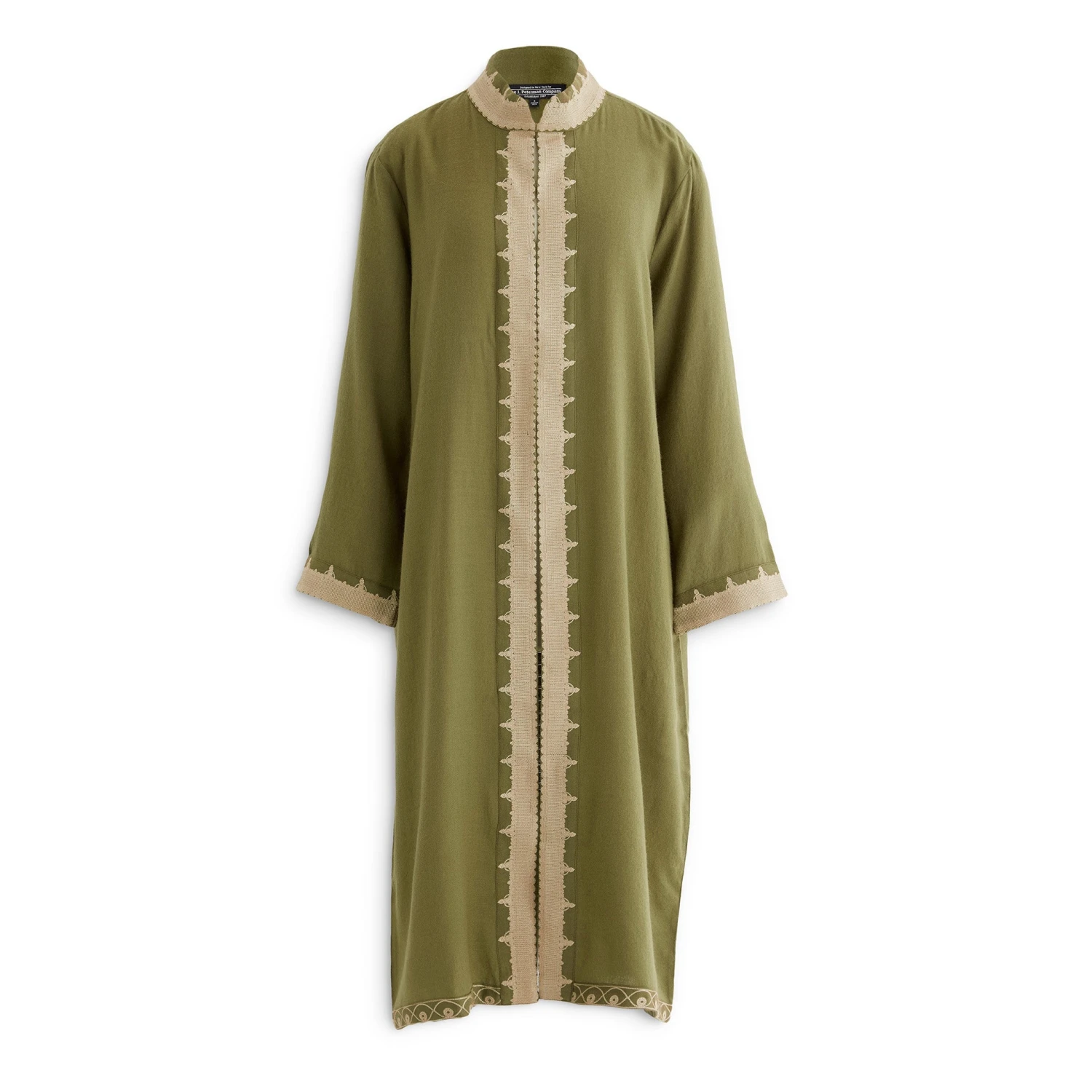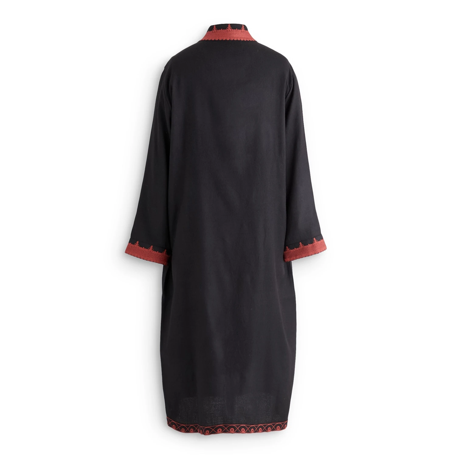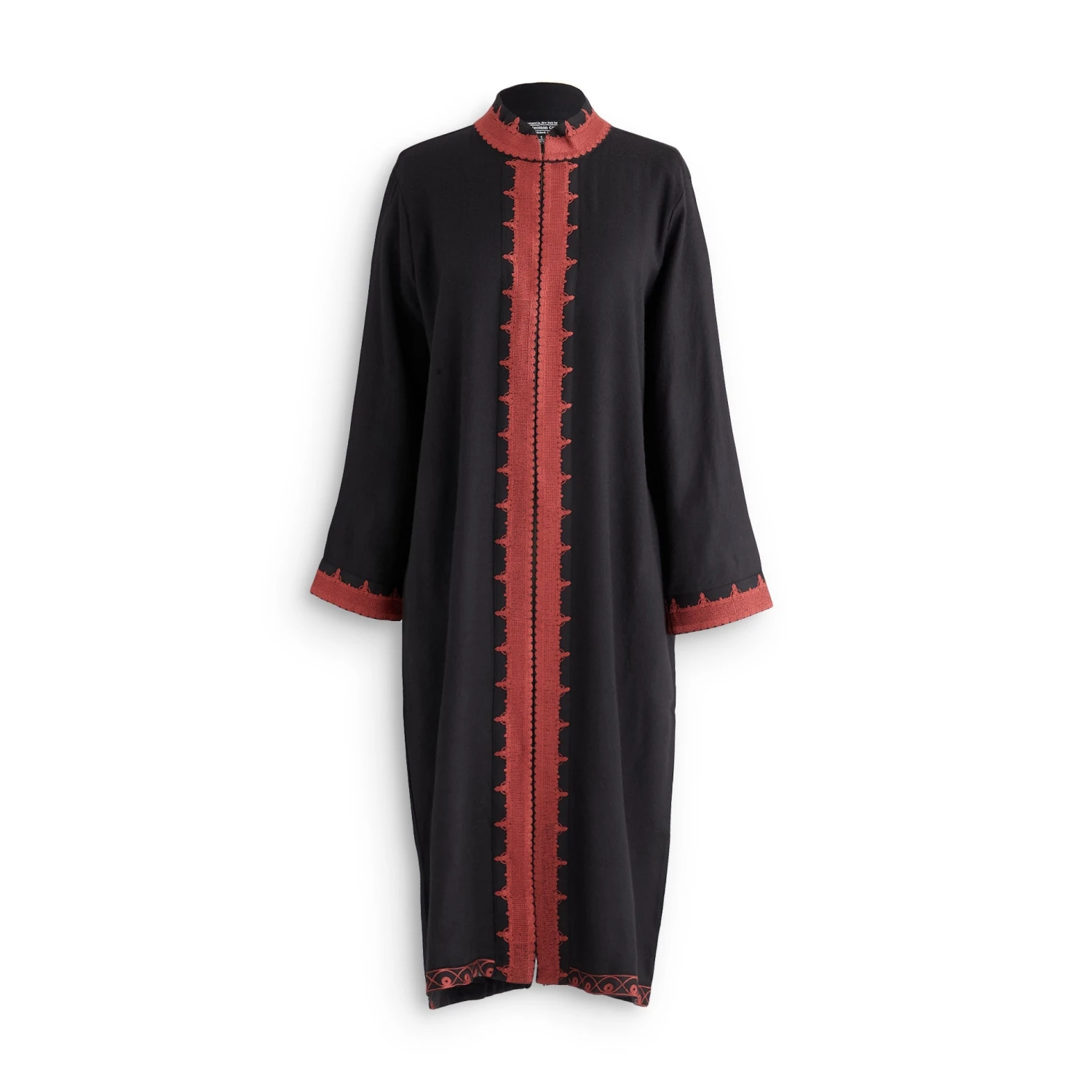Moroccan Coat (No. J7434). An open-front top layer as simple as it is rich in details. The drama of a neck-to-ankle coat, its effect amplified by contrasting embroidery at neck, cuffs, and center front. 100% cotton. Unlined. Imported.