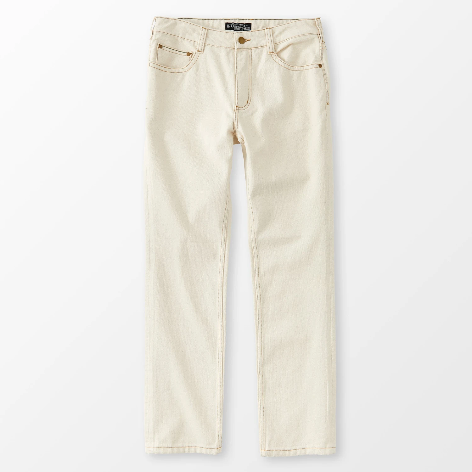 days. This is straight up denim—unbleached undyed, that is, and with stray flecks of brown that only add to the natural flavor. Off-white five pocket styles like this one have become a staple for some of the world’s finest dressers.