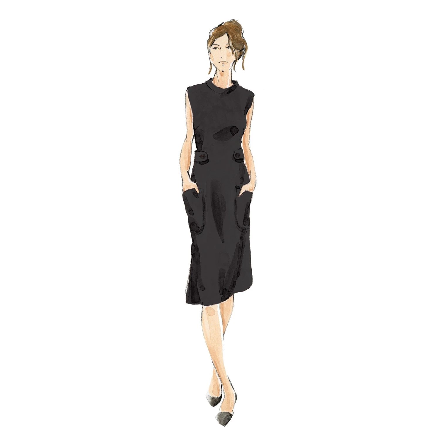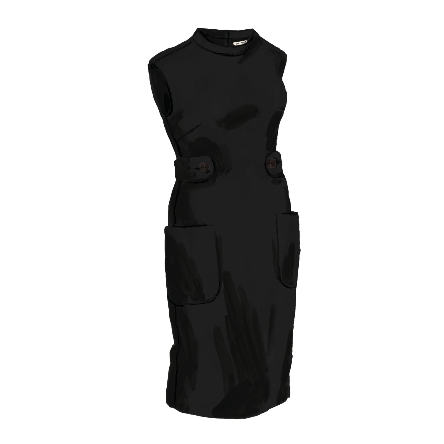 Waist belt with fax ivory buttons. Two patch pockets. Center back zipper with hook and eye at neckline. Poly lining. Waist belt gently cinches this chic shift dress. Très chic. Imported.