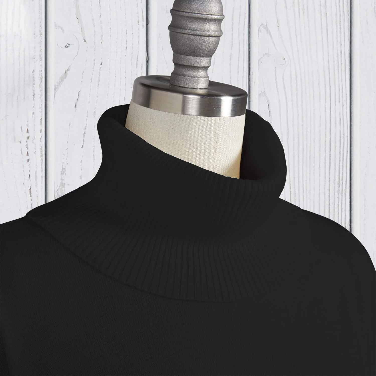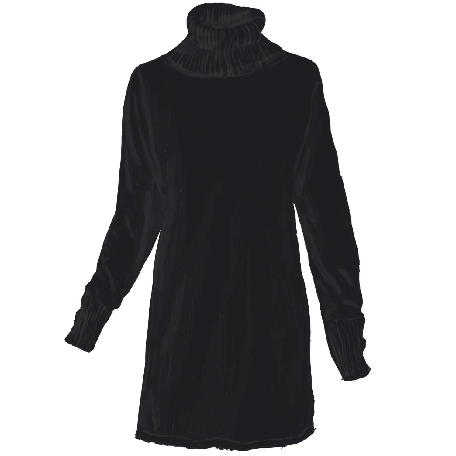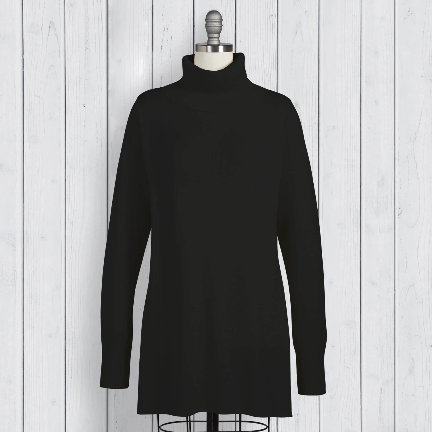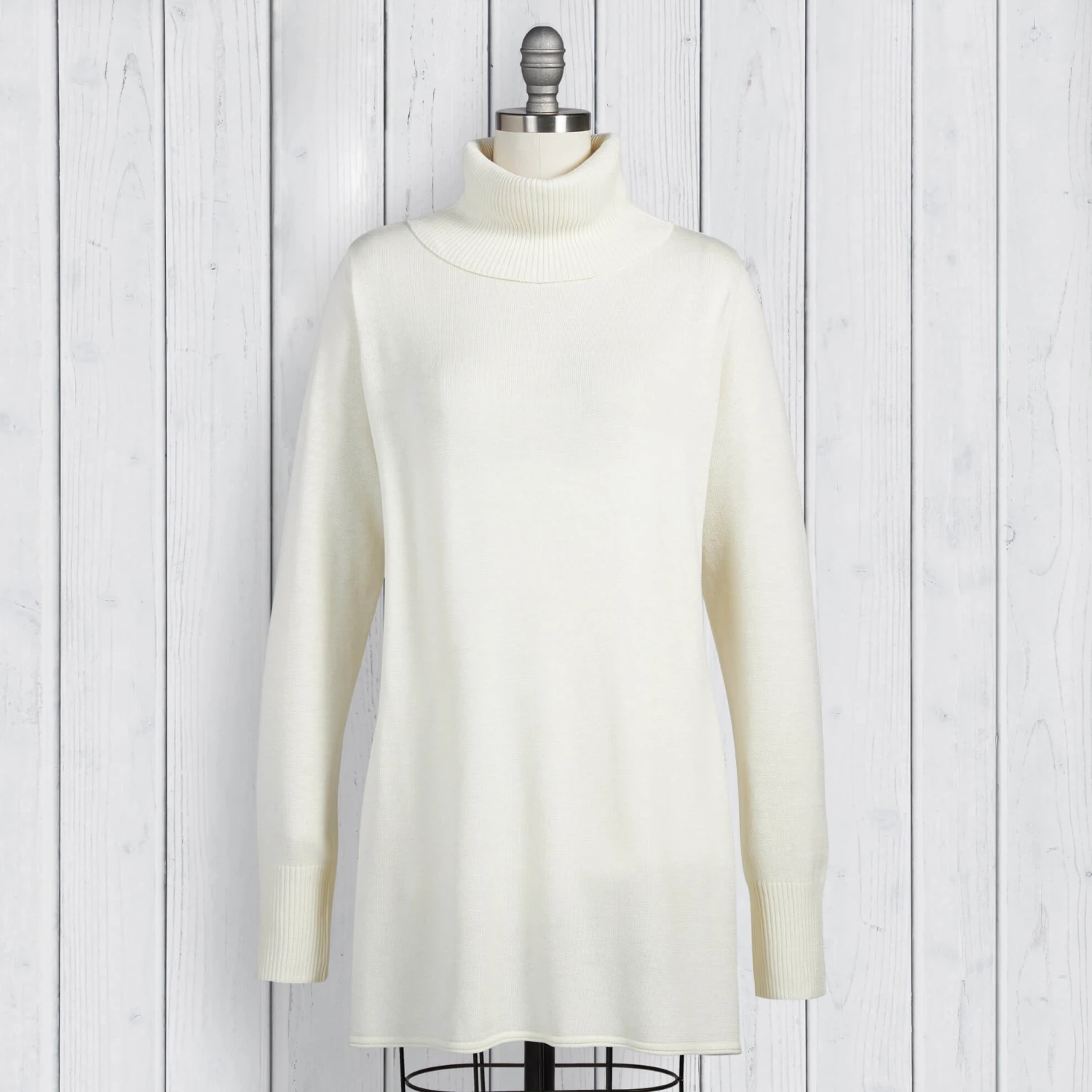 Oversized English Turtleneck (No. 5801). Lightweight sweater knit blend with a hint of cashmere. Hugs you softly. Some aspects that make you look longer: the tunic length, the long, ribbed sleeve cuffs, the oversized turtleneck. Fully fashioned sweater construction. Goes on easily; wanting to take it off is less so. Imported.