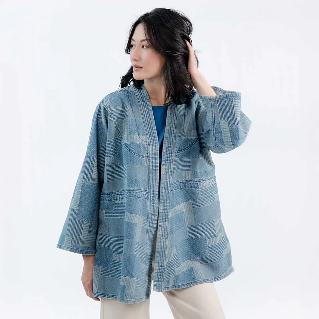 Patchwork Kimono Jacket (No. J8726) made from 100% cotton patchwork jacquard. Interesting yoke detail. Alluring side slits. We designed this kimono jacket with you in mind. Imported.