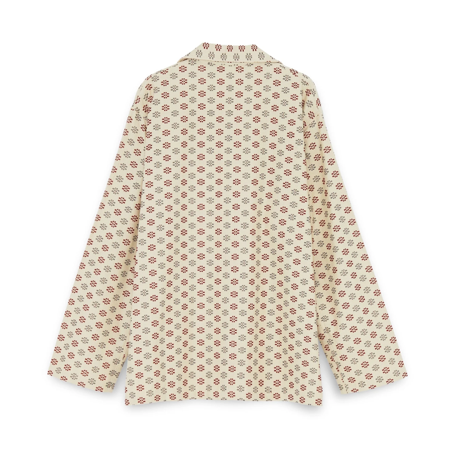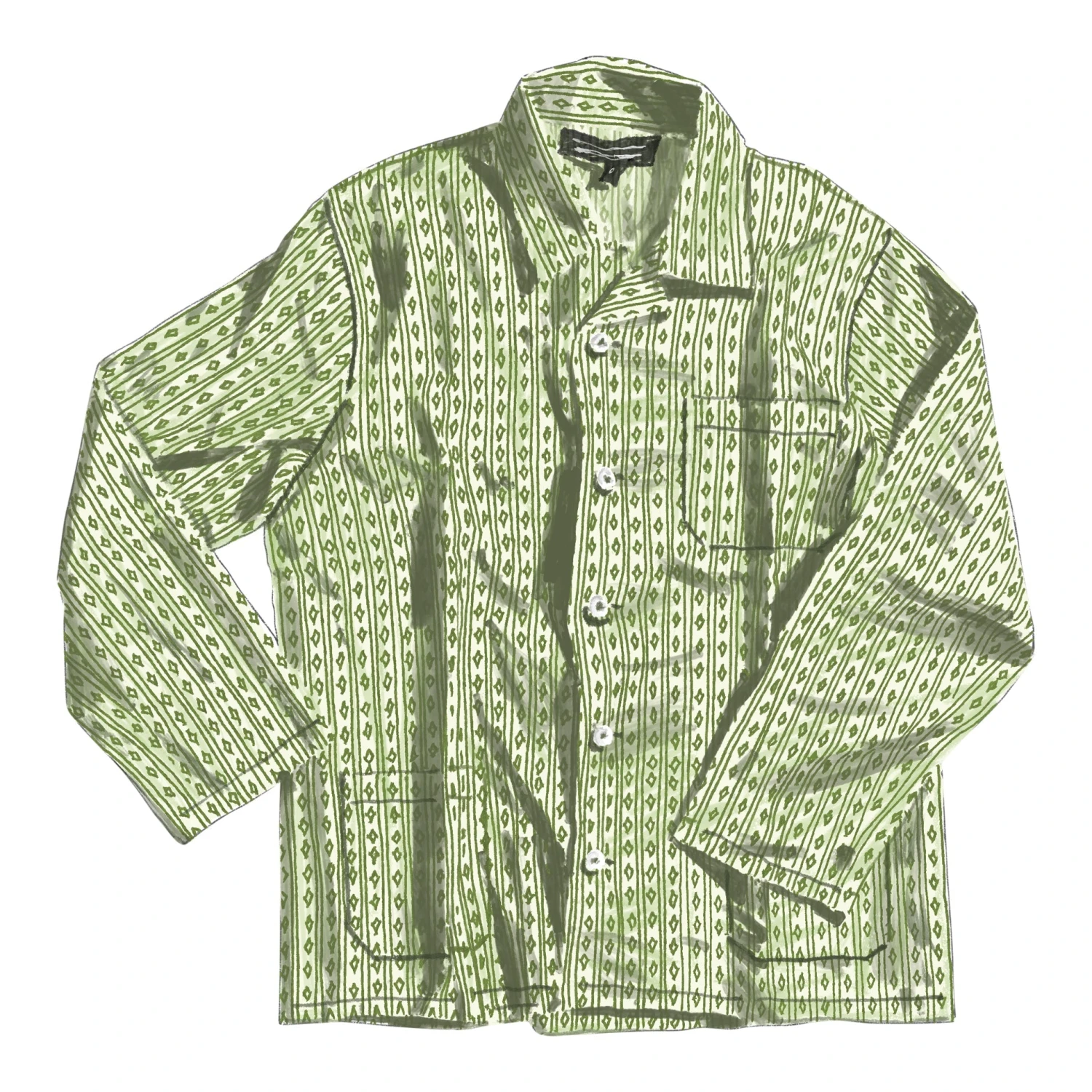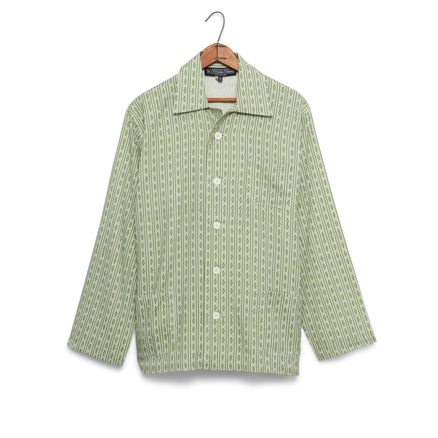 Printed PJ Jacket (No. J7231). Modeled after mid-20th-century French pajamas, in 100% cotton with a modern geometric stripe. Classic PJ styling with a chest pocket and waist pockets. Flat hem. French placket. Camp collar. Made in India.