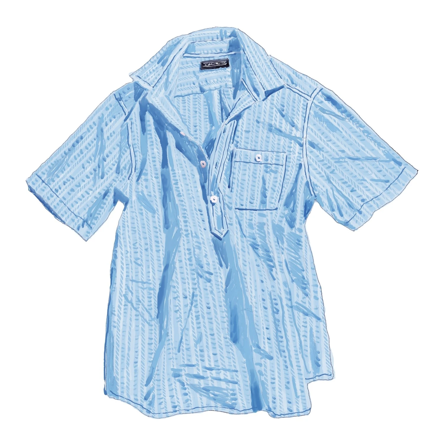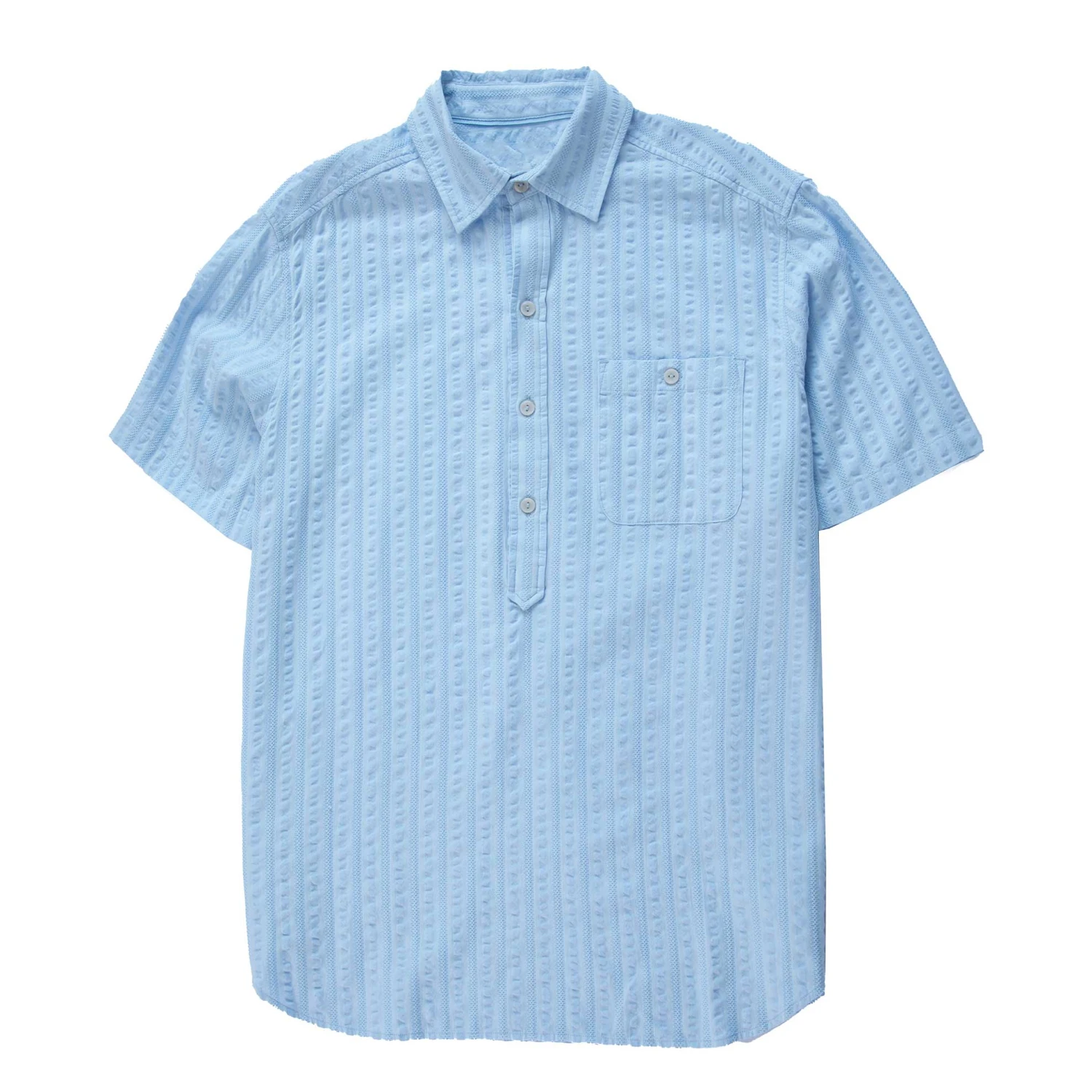 Refreshing Seersucker Popover Shirt (No. J8720). made from 100% cotton dobby seersucker, woven with a subtle lattice texture that lifts off the skin for effortless breathability. Garment-washed for immediate softness, with a half-placket, spread collar, and a single chest pocket. Rounded shirttail hem.