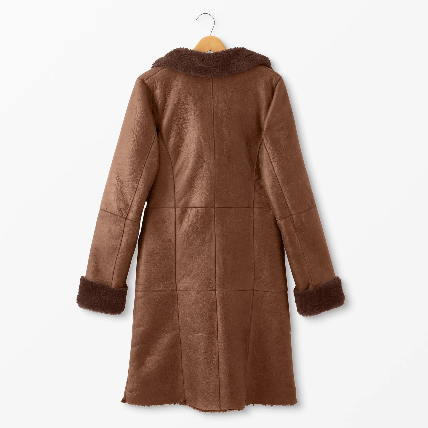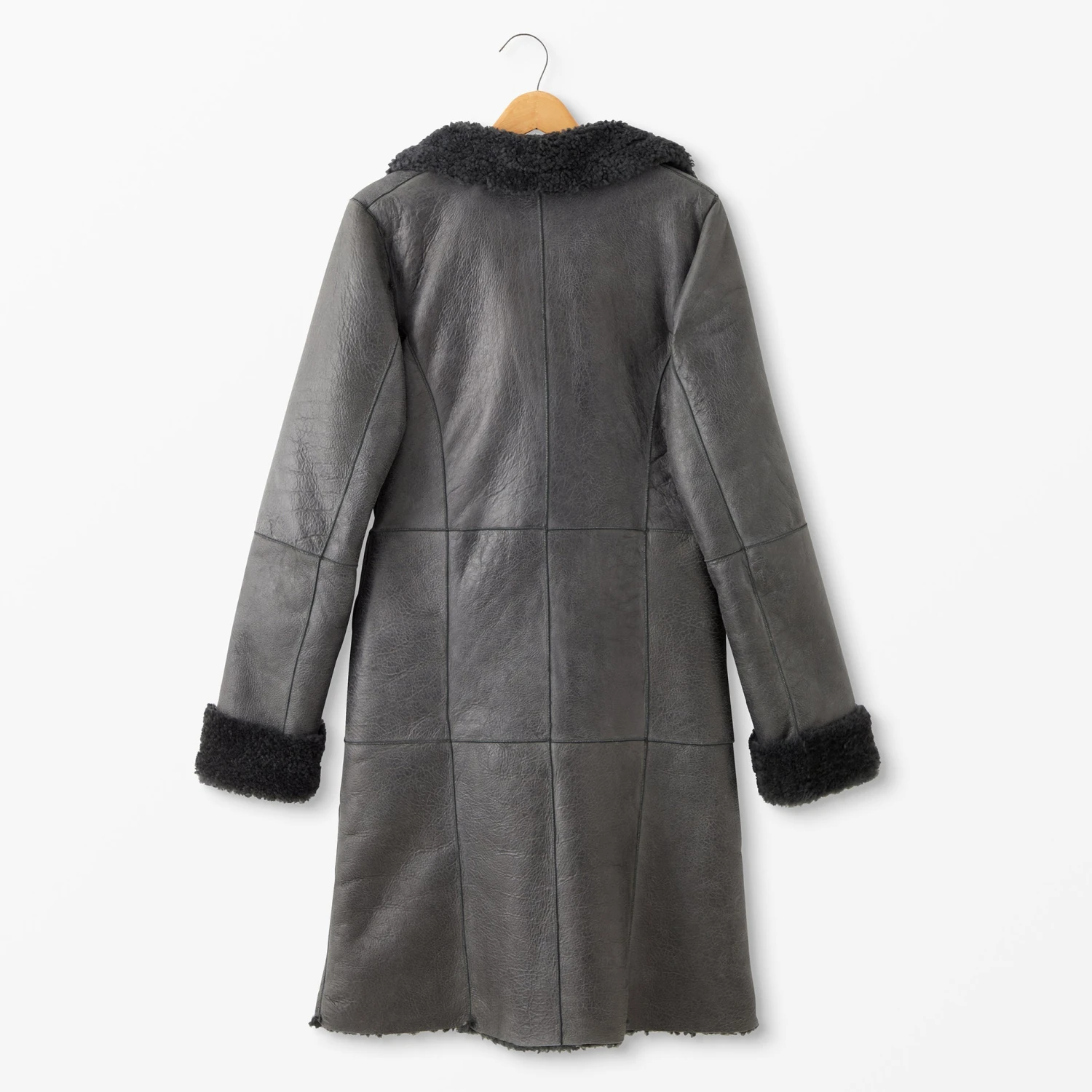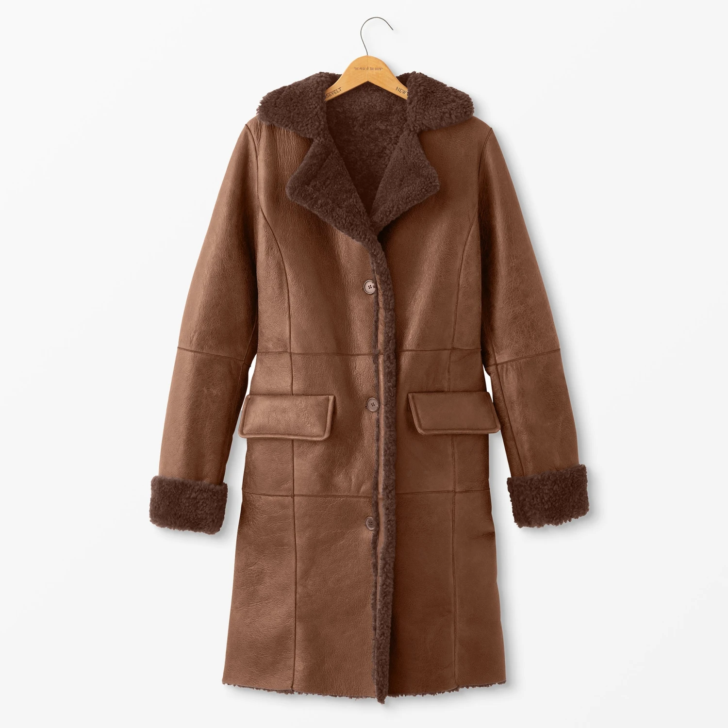 Roaring Fork Shearling Coat (No. J7388). Stitched from the most luxurious 100% leather shearling. Genuine horn buttons. Two generous flap pockets at front hip. Imported.