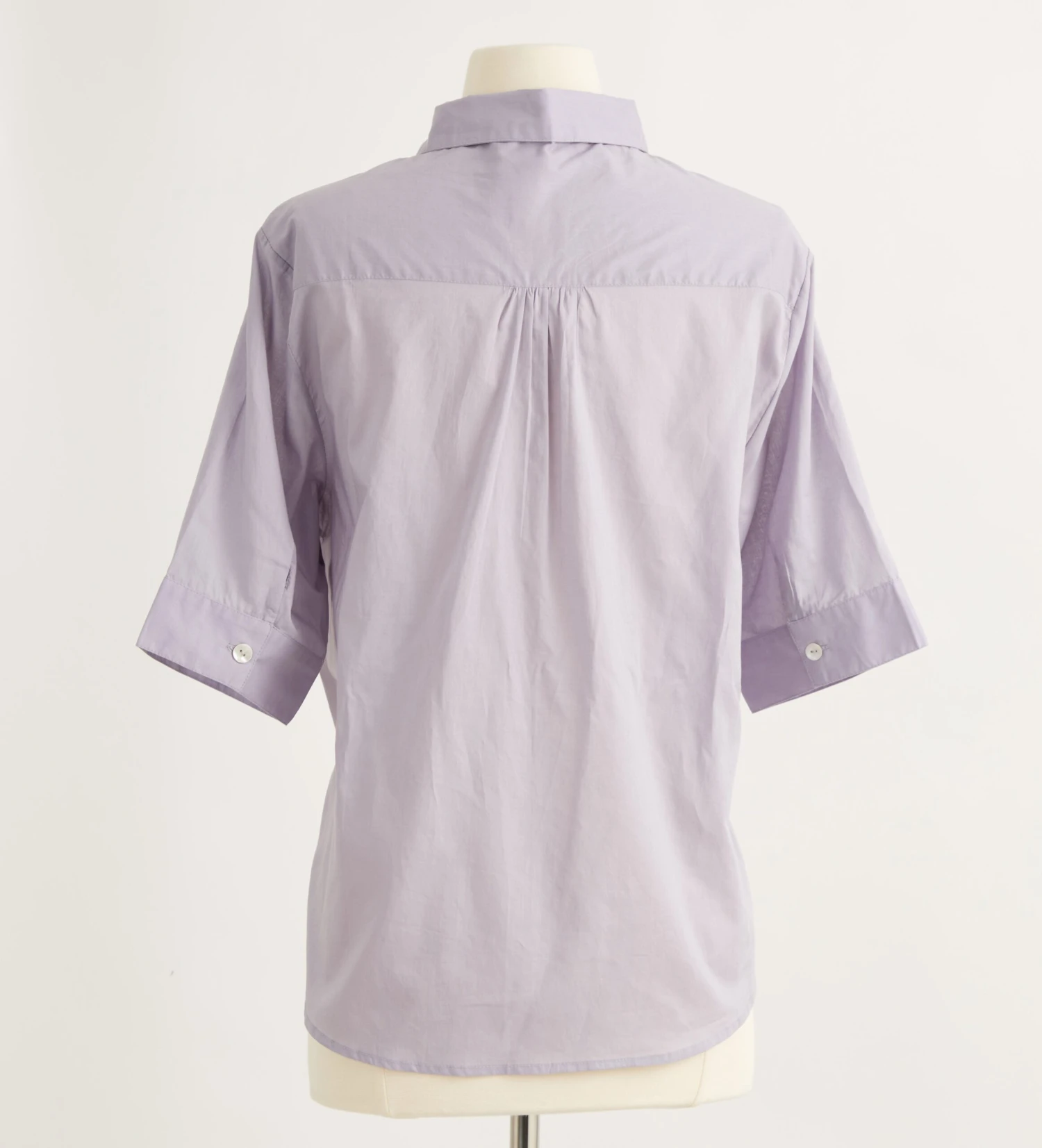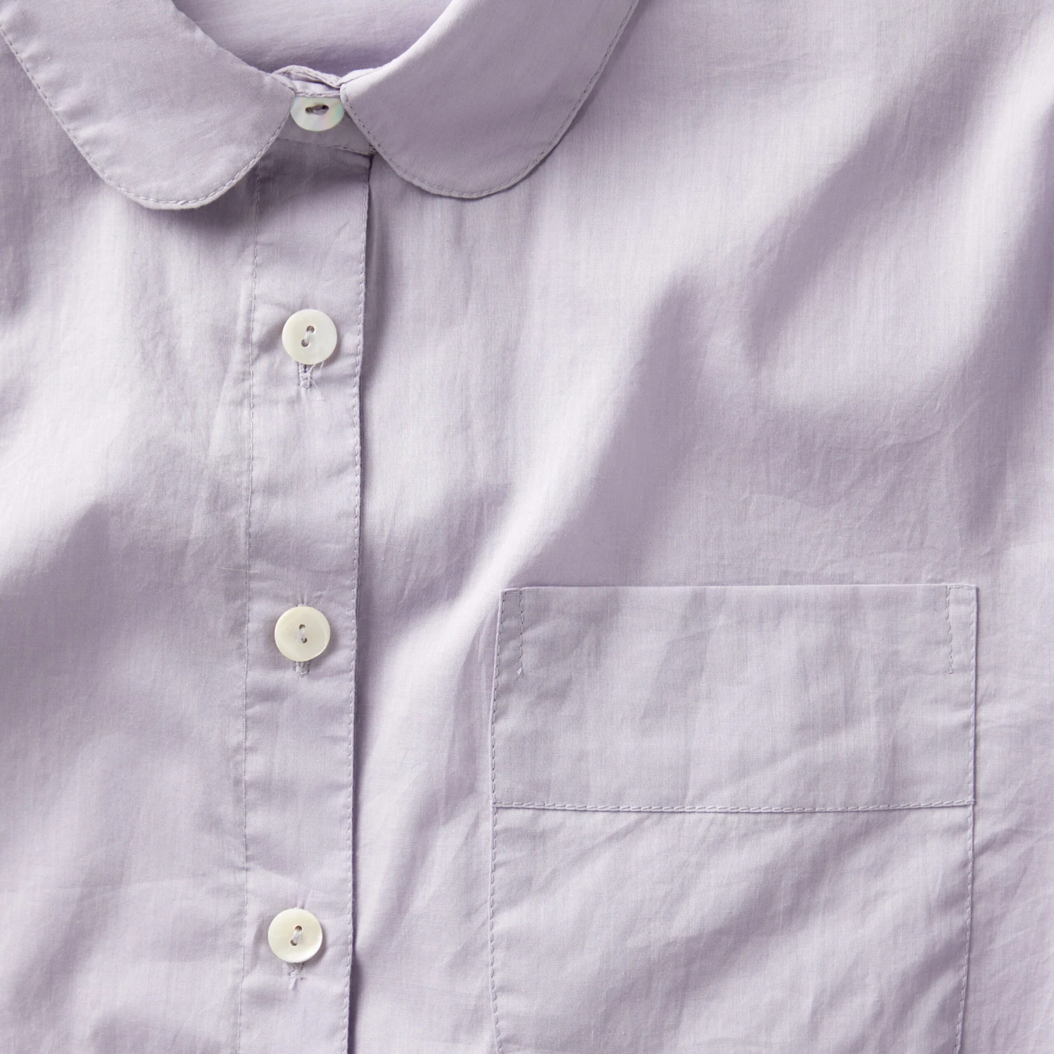 Roman Holiday Blouse (No. J8258). Wonderfully crisp 100% cotton blouse with memorable Peter Pan collar. Lovely worn up or down. Patch pocket at left chest. Back yoke with shirring at center. Eight shell buttons at center front, and one at each sleeve cuff. Imported.