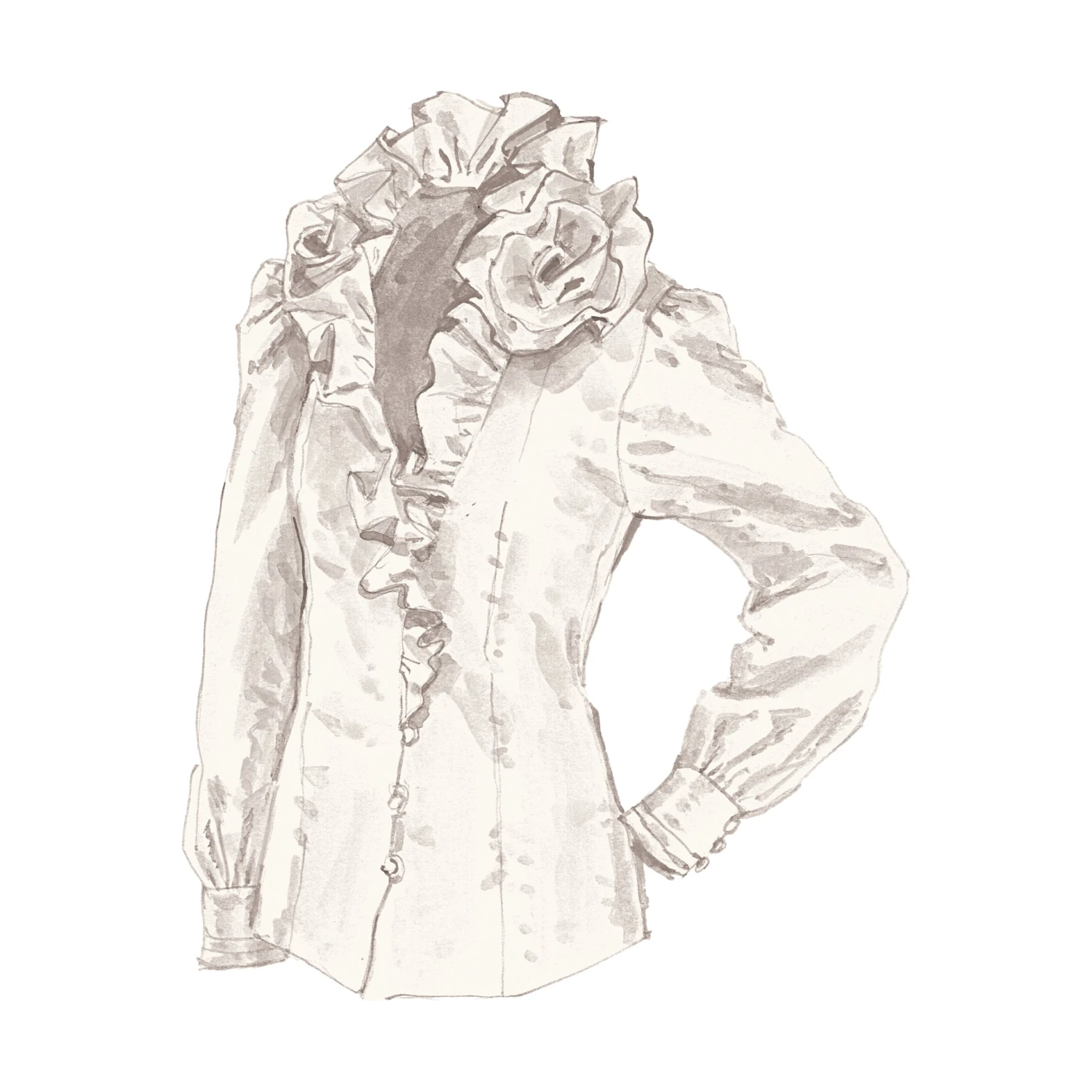 Ruffle Neck Blouse (No. J5519). For the whirl of the season, which you might create all by yourself. Taffeta construction. Self-fabric rosettes flowing into ruffles. Six covered buttons down the front. Straight hem.Â