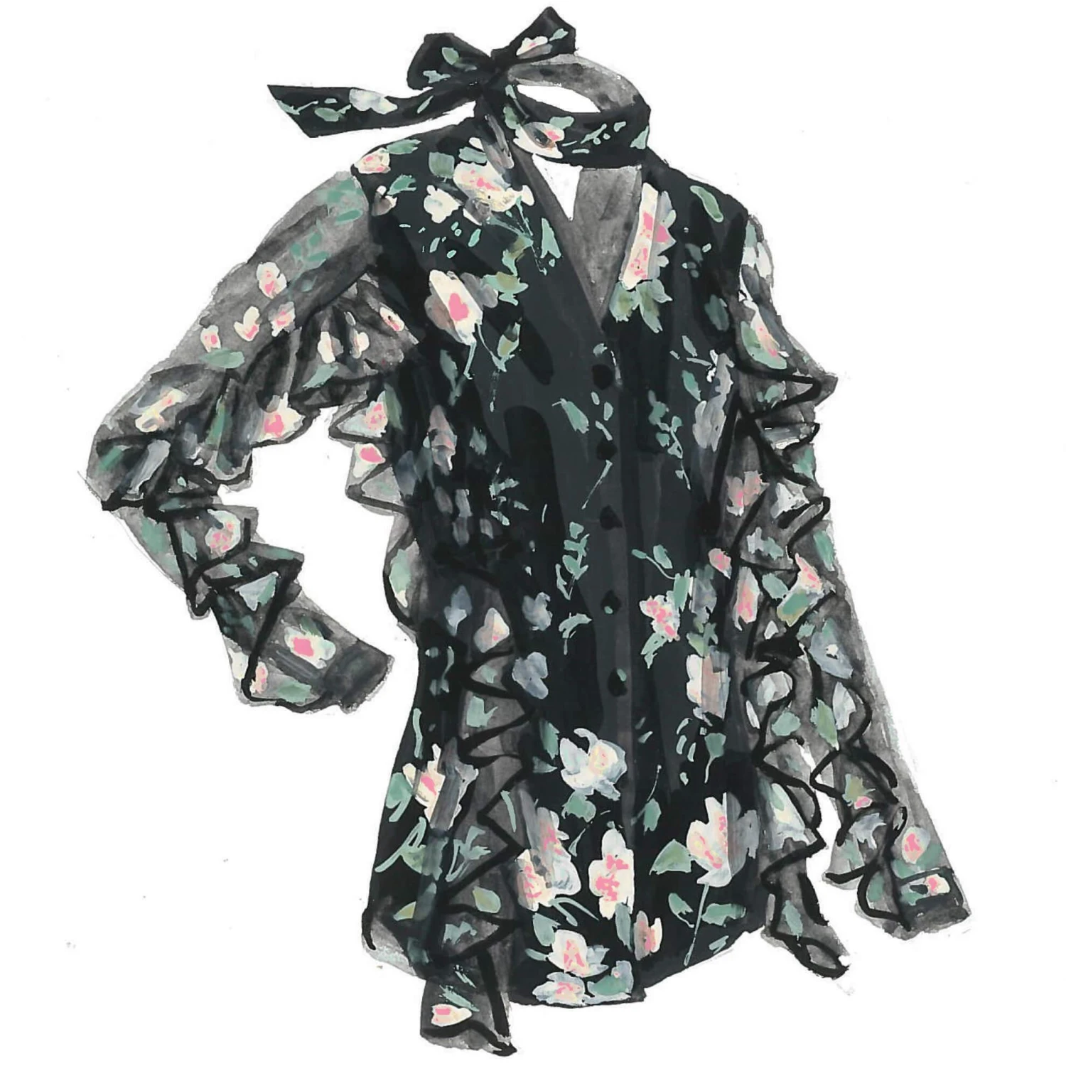 All for Show Ruffle Sleeve Blouse (No. 5830). Fitted long-sleeve blouse in poly georgette with self-fabric ruffles down sleeves and front bodice. Exuberant rose print (not loud, only confident). V-neckline in front with mock collar that wraps to the back to form a sash that ties and drapes and flutters down your back. Front princess seams, back-shaping darts. Six self-covered buttons down center front. Lined in black crepe de chine. Imported.