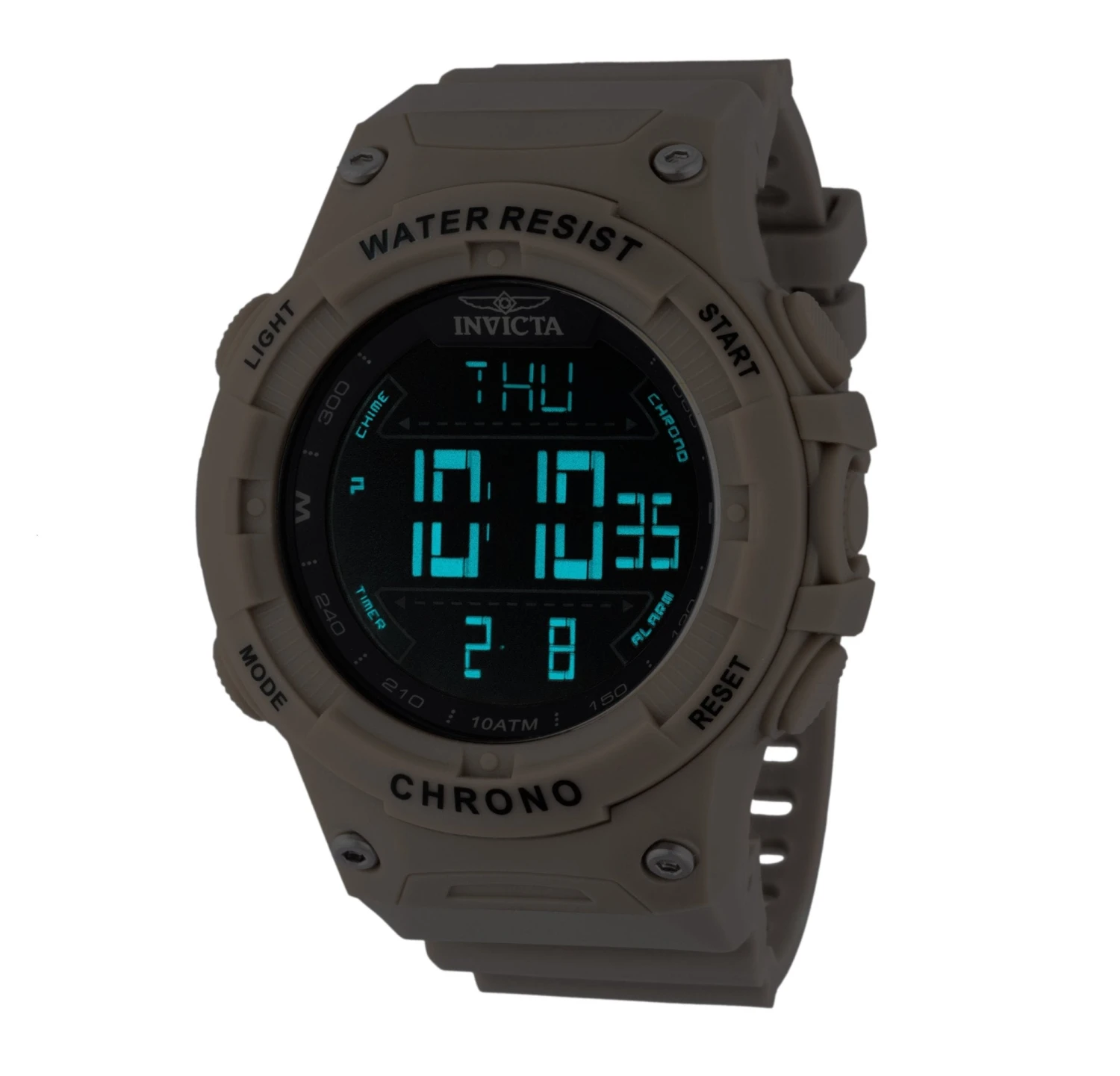 A gutsy watch engineered for spectacular feats, but you don’t have to challenge the land speed record to appreciate the easy-to-read 52mm size, mineral crystal face, or the impervious-to-everything polyurethane band. Electronic movement. Water resistant to 100 meters. Made by our friends at Invicta. Imported.