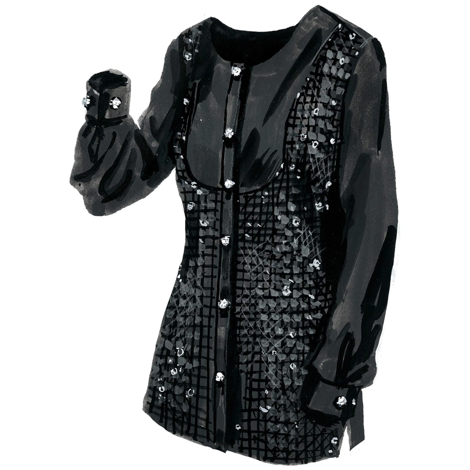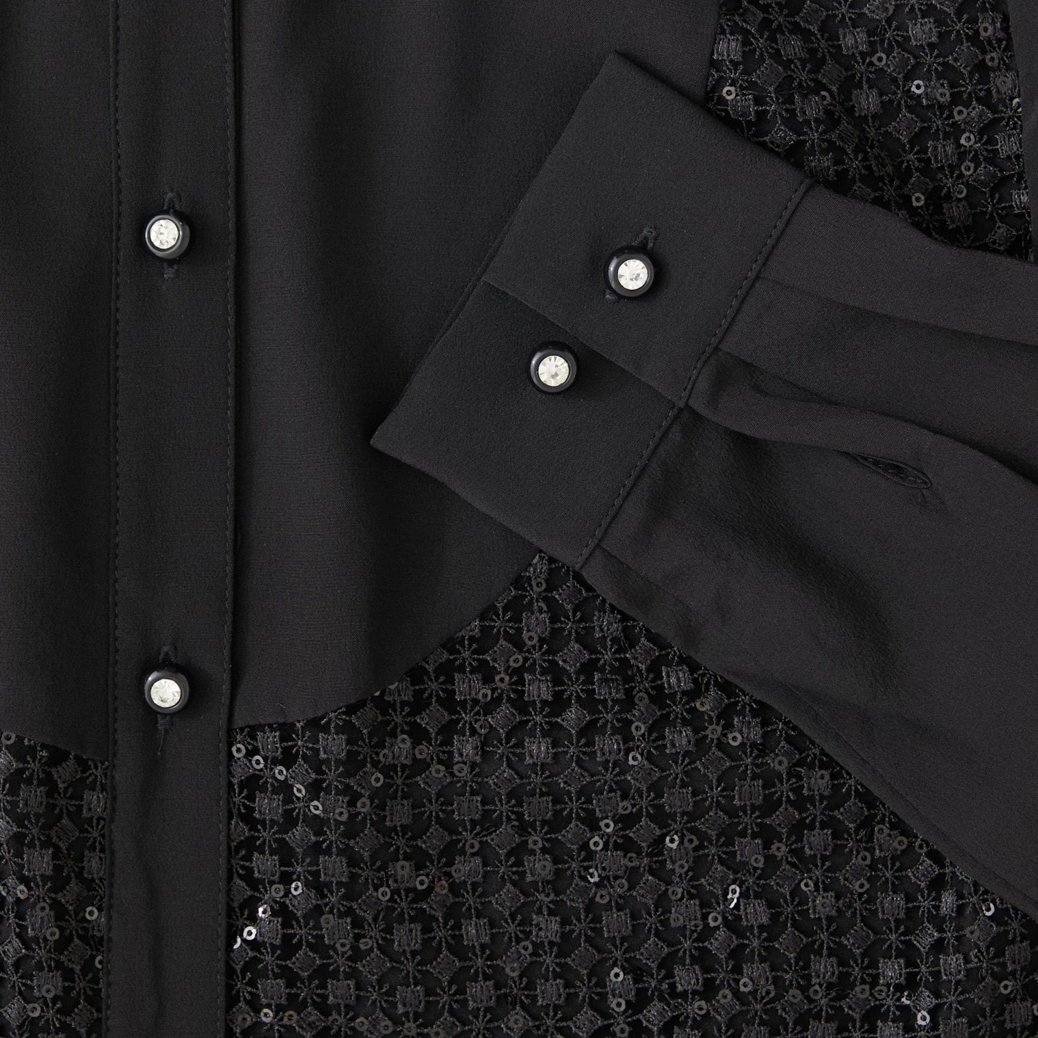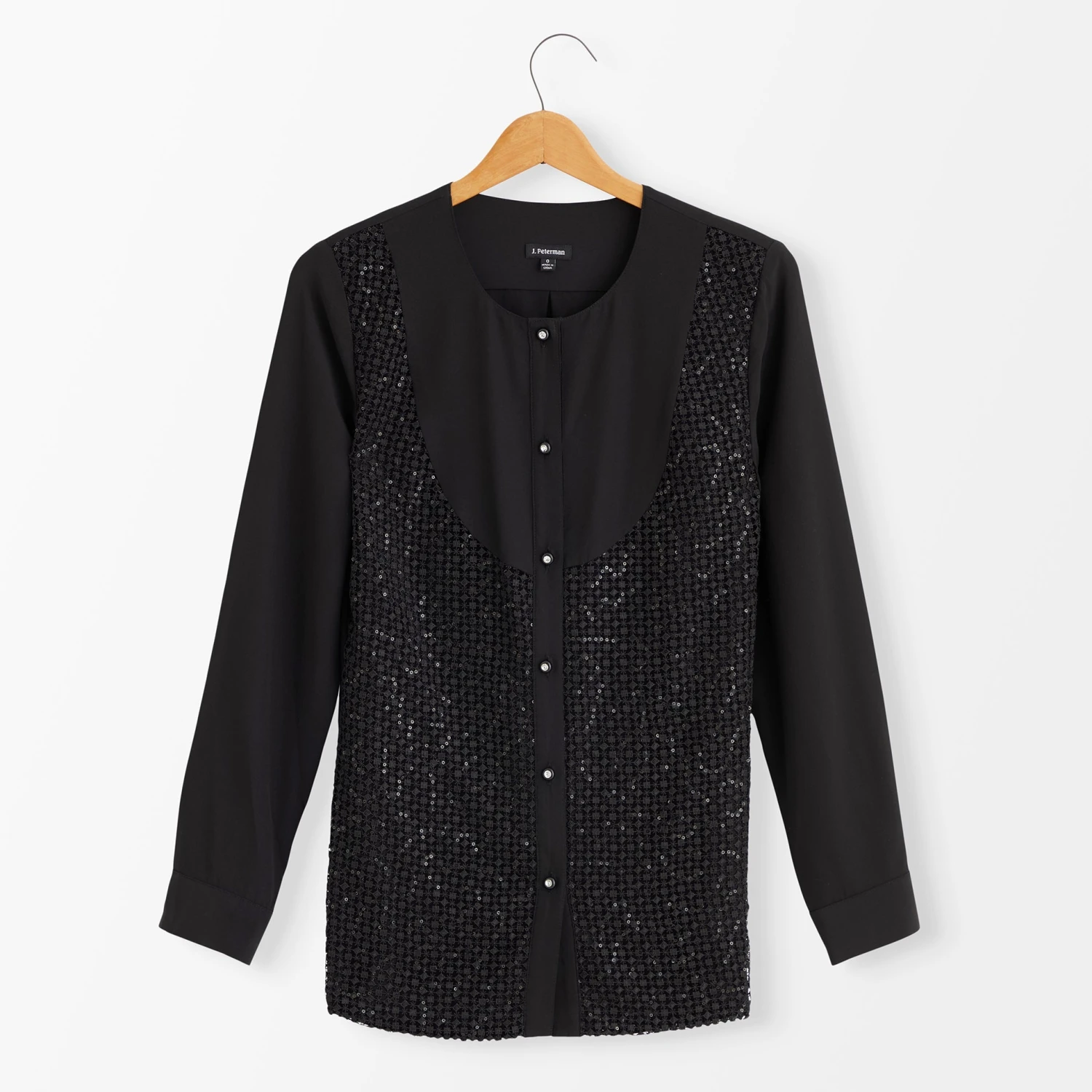 100% silk crepe de chine with a sparkling, dyed-to-match sequin overlay at front. Front bib detail in silk. Six black buttons with eye-catching clear crystals down center front and at adjustable sleeve cuffs. Back yoke with box pleat. Side vents. Front lined in silk. Imported.