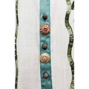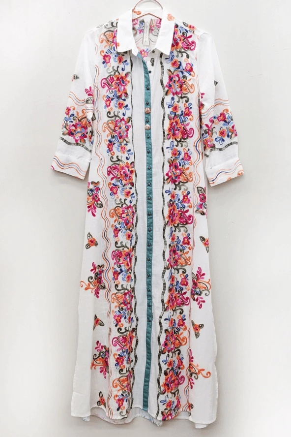 The Carnevale Duster (No. J8860). Embroidered button-up duster thatย transforms into a dress with several buttons done up nicely (the exact numberย is entirely up to you and your whims). Comfortable, midi length cotton shell embellished with rather glorious embroidery. Velvet center front placket and velvet panel at center back. Side slits add interest to the proceedings. Two side pockets. Velvet panels made from a poly/spandex blend. Perfect for the festivities with a mask of your choice. Imported.ย