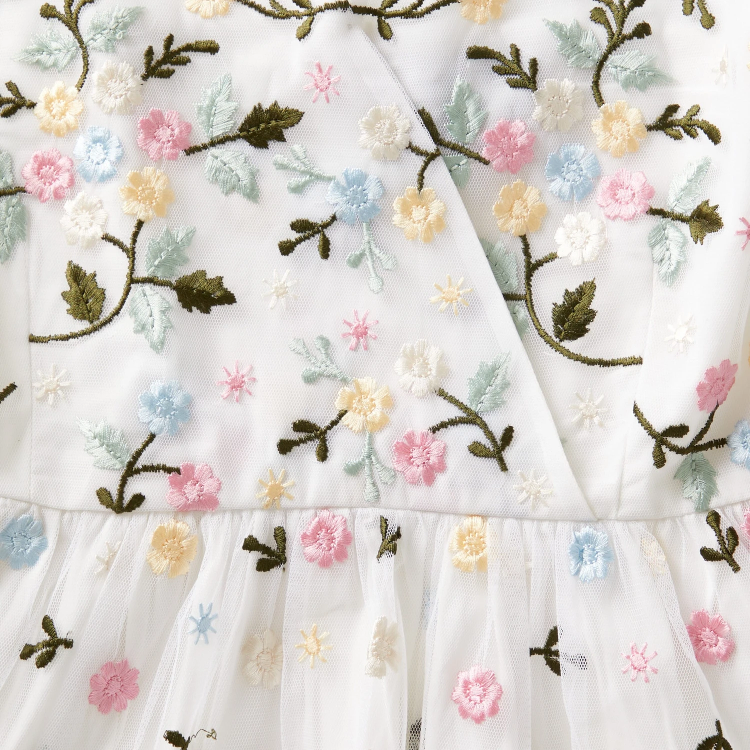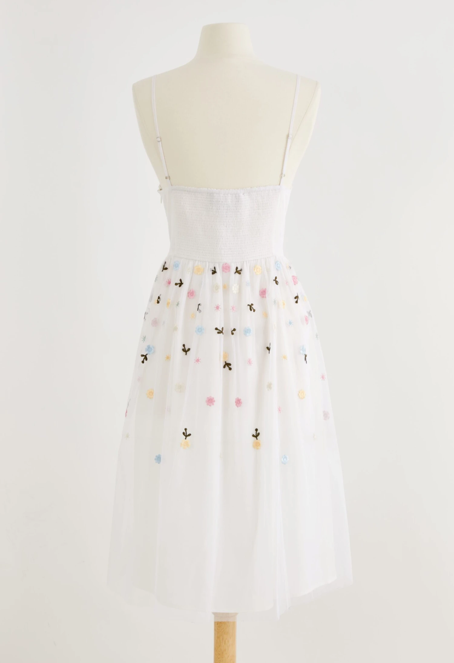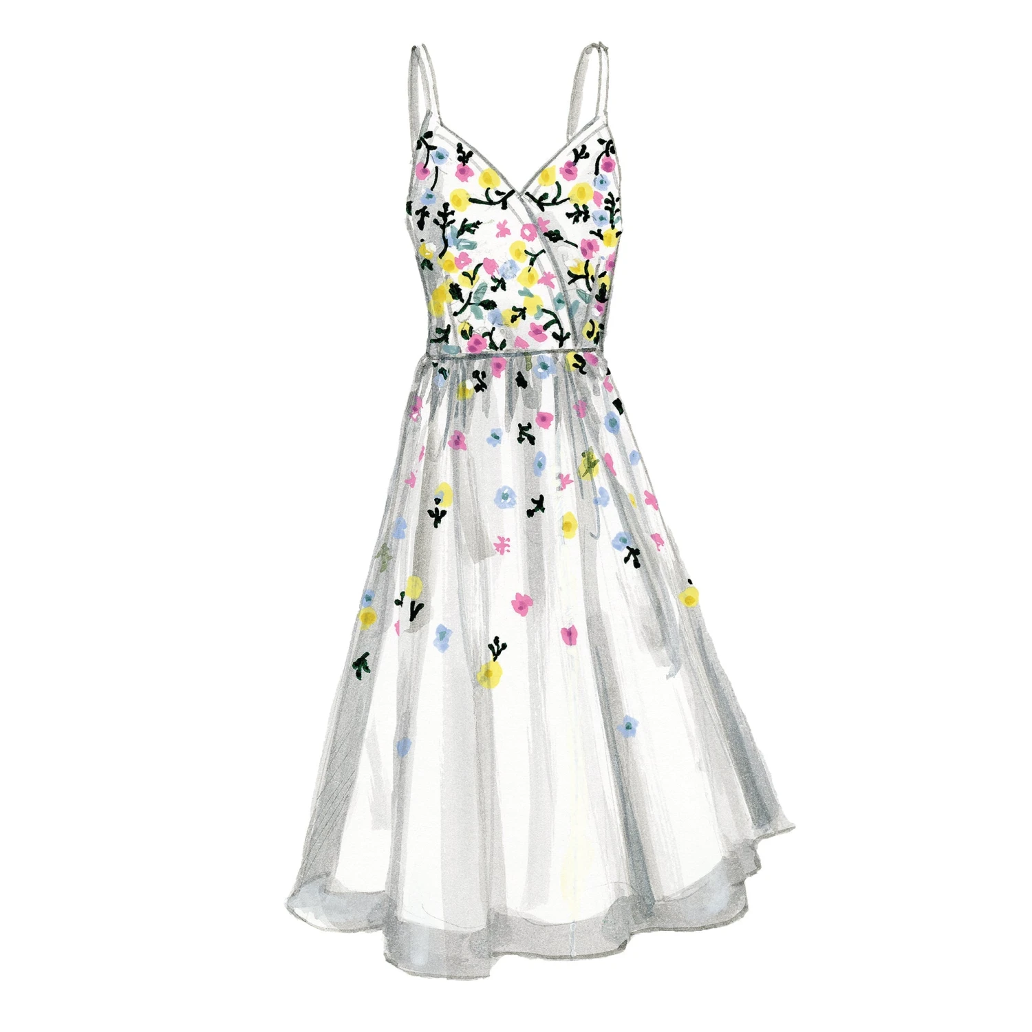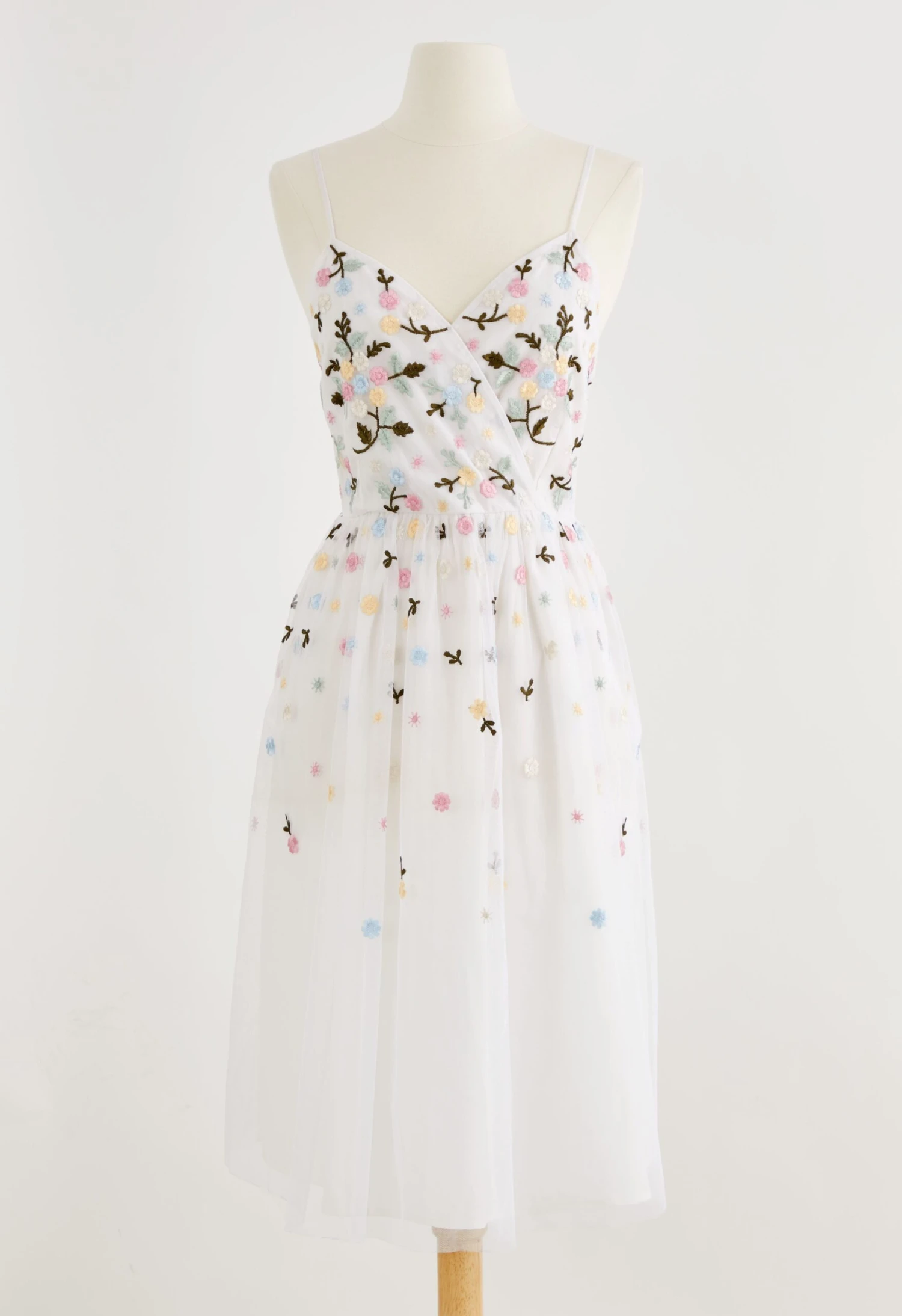 The Cocktails at Seven Dress (No. J8127). Tell a beautiful tale in tulle with a romantic scattering of embroidered roses on the bodice and skirt of this thoroughly alluring dress. Universally-flattering sweetheart neckline and crossover wrap front, with boning at side seams and shirring at waist. Smocking at center back. Nylon tulle shell. Poly lining. Invisible zipper at wearer’s left and back zipper with hook and eye closure at top. Imported.