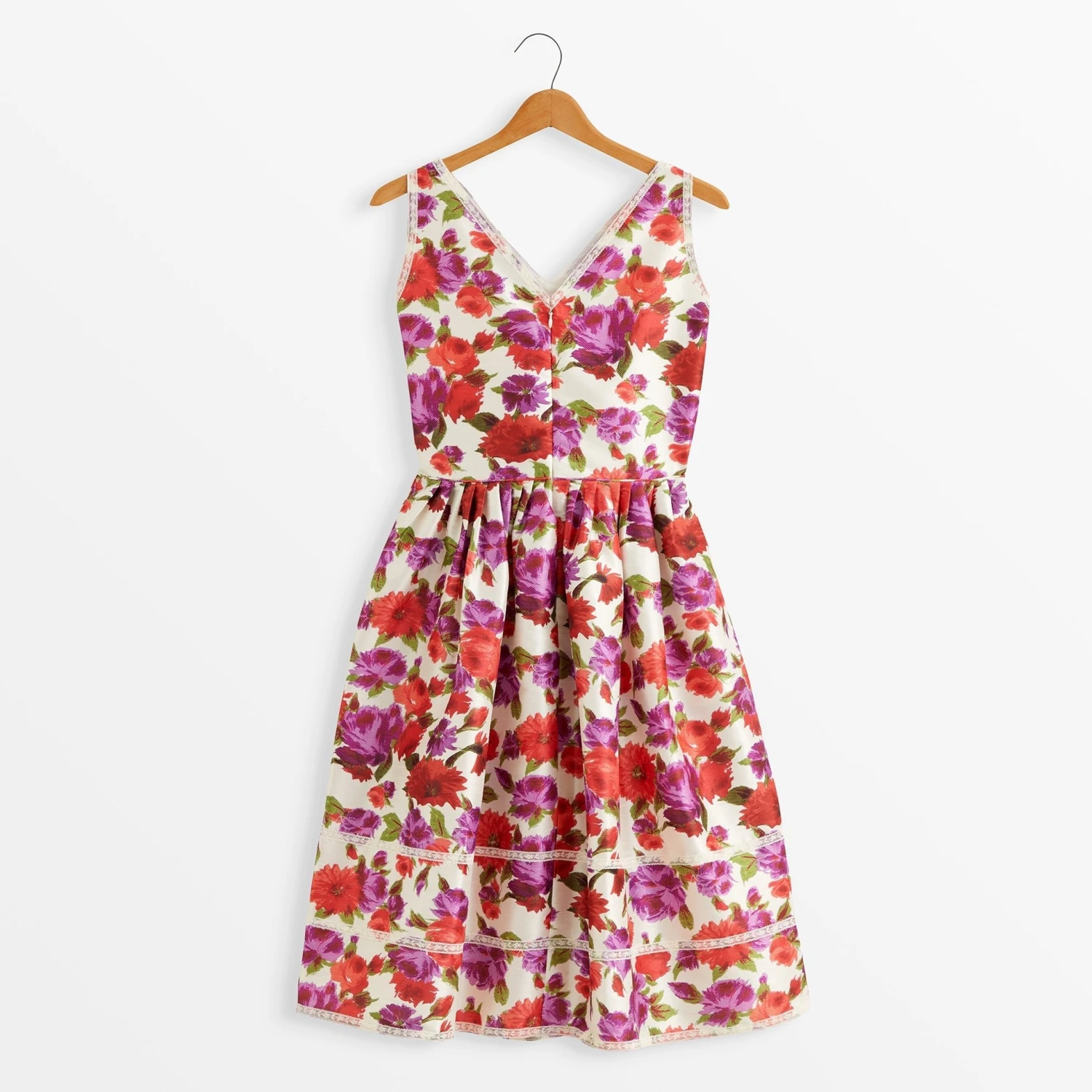 Derby Dress (No. 7257). Glamour-minded, spring-hearted dress, in luxurious cotton voile, gathered at waist with a romantic flared skirt. Features delicate lace trim along neckline and sleeves. Three eye-catching lace-trimmed tiers between waist and hem. Falls to mid-calf. Lined in cotton voile. Imported.
