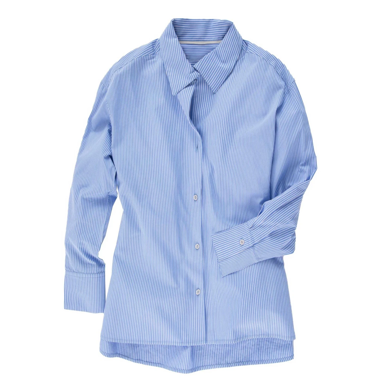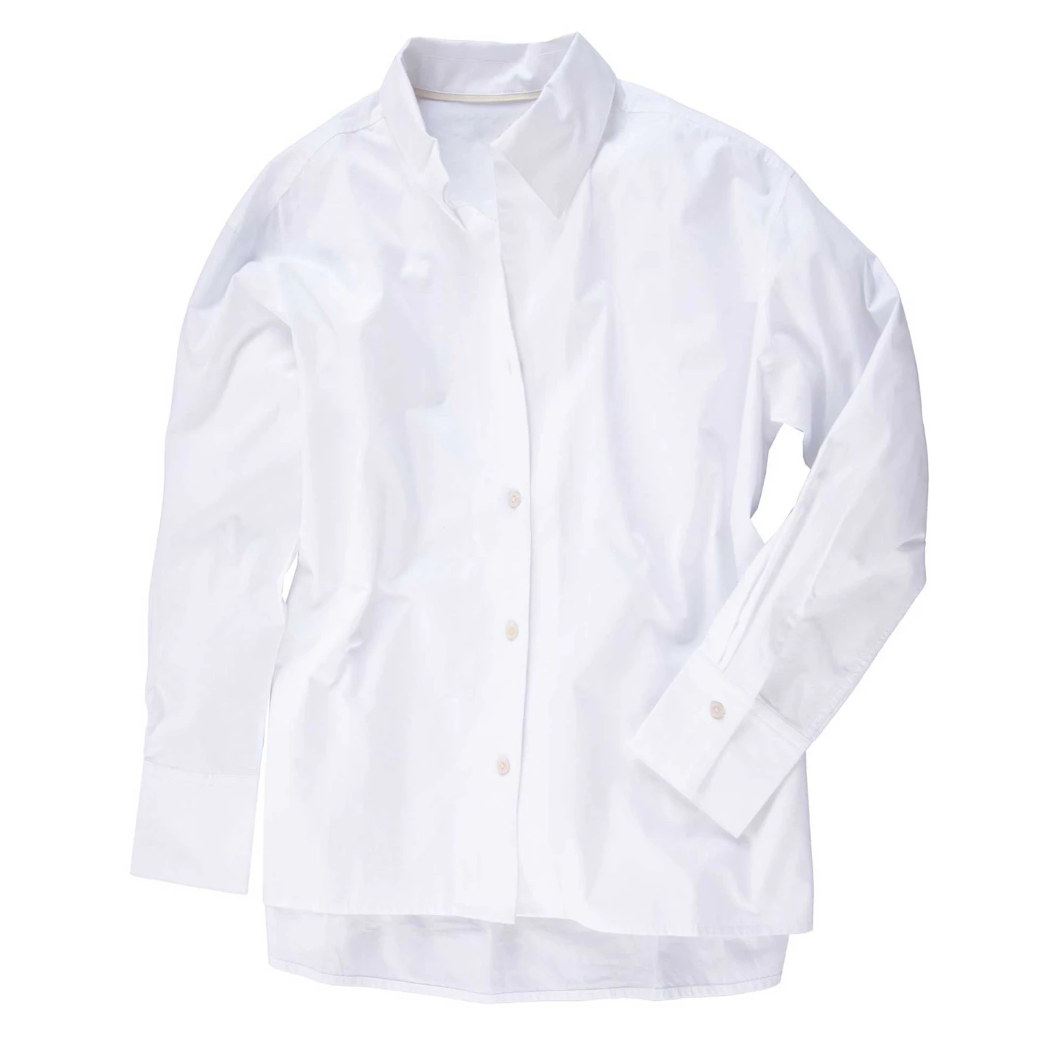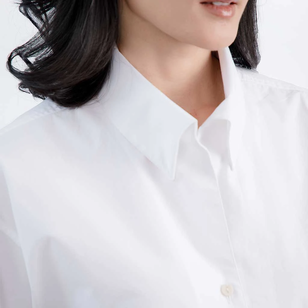 The Grown-Up Cotton Poplin Shirt (No. J8721). A classic Italian dress shirt reimagined. Not stuffy. Casual. Feminine and flattering. A slightly structured drape. Charismatic 4” cuffs. One piece collar. Garment washed for softness. Nonno is smiling. Imported.