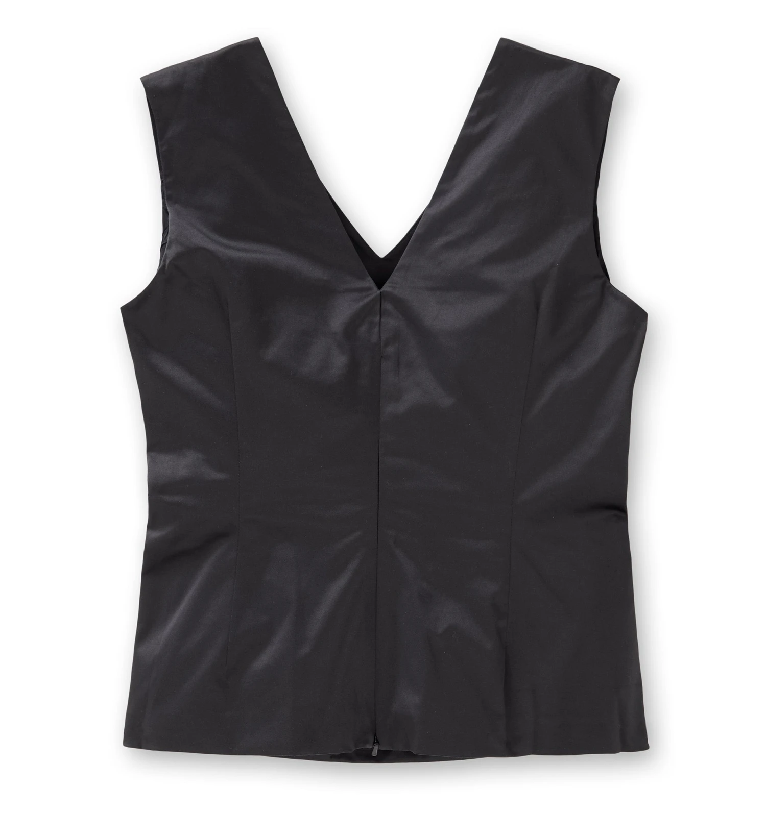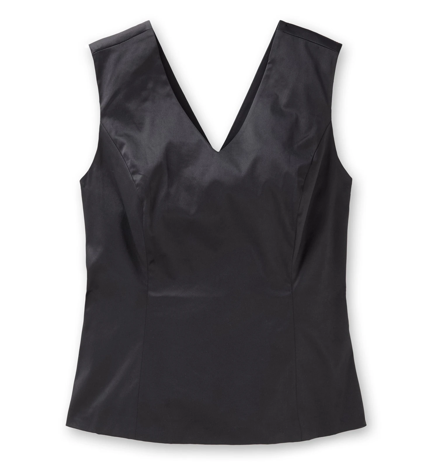 The Holiday Blouse (No. J5824). Double V-neck(front and back) blouse in a stretch cotton-blend satin. Tailored fit with front princess seams and back-shaping darts. Full satin lining. Invisible zipper at center back. Strikingly simple. Simply striking. The best ideas usually are. Imported.