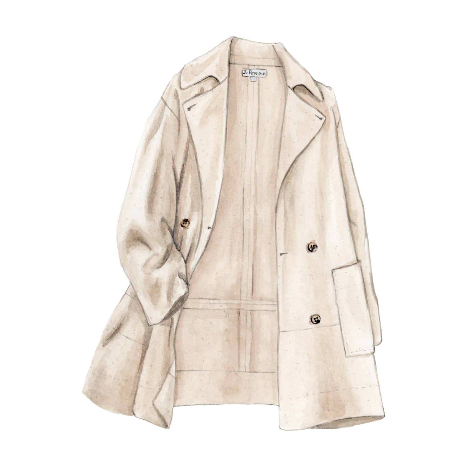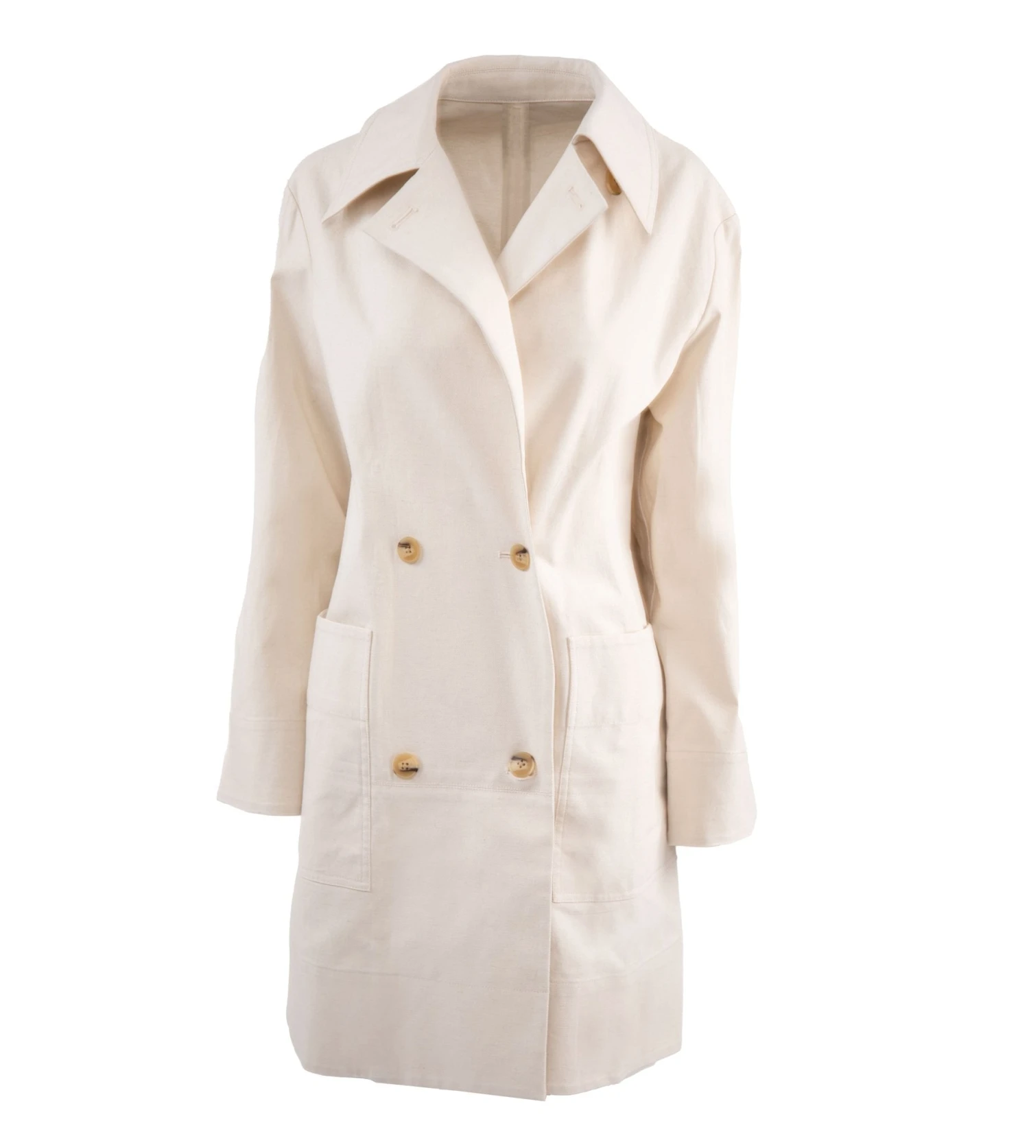 The Time Traveler’s Canvas Peacoat (No. J8229). Gorgeously retro spring peacoat in 30% linen and 70% cotton. Interior face binding. Dyed to match buttons at center front. Clear buttons at interior. Large patch pockets. Wide hem at sleeve and bottom hem. Top stitching at collar, hems, pockets, and center back seam. Imported.