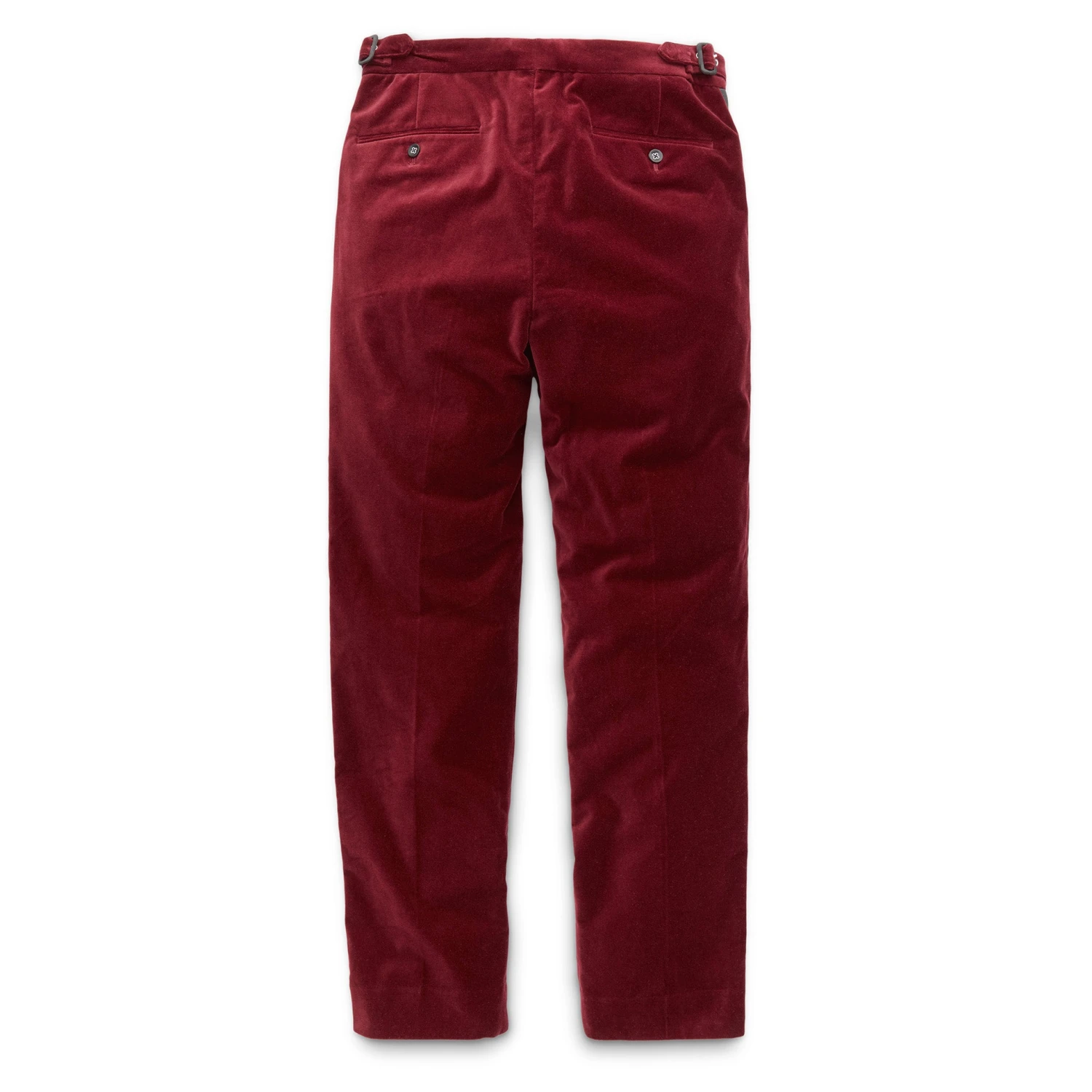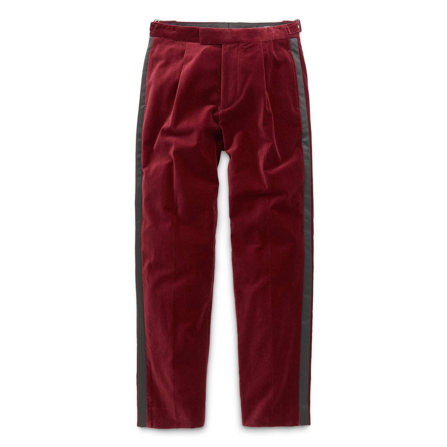 Velvet Tuxedo Trousers (No. 7331). 100% cotton velvet tuxedo trouser. The deep wine color infuses this velvet tuxedo jacket with extra personality without overwhelming. Satin stripe down outside leg. Covered shank button, zipper, and hook and bar closure. Imported.