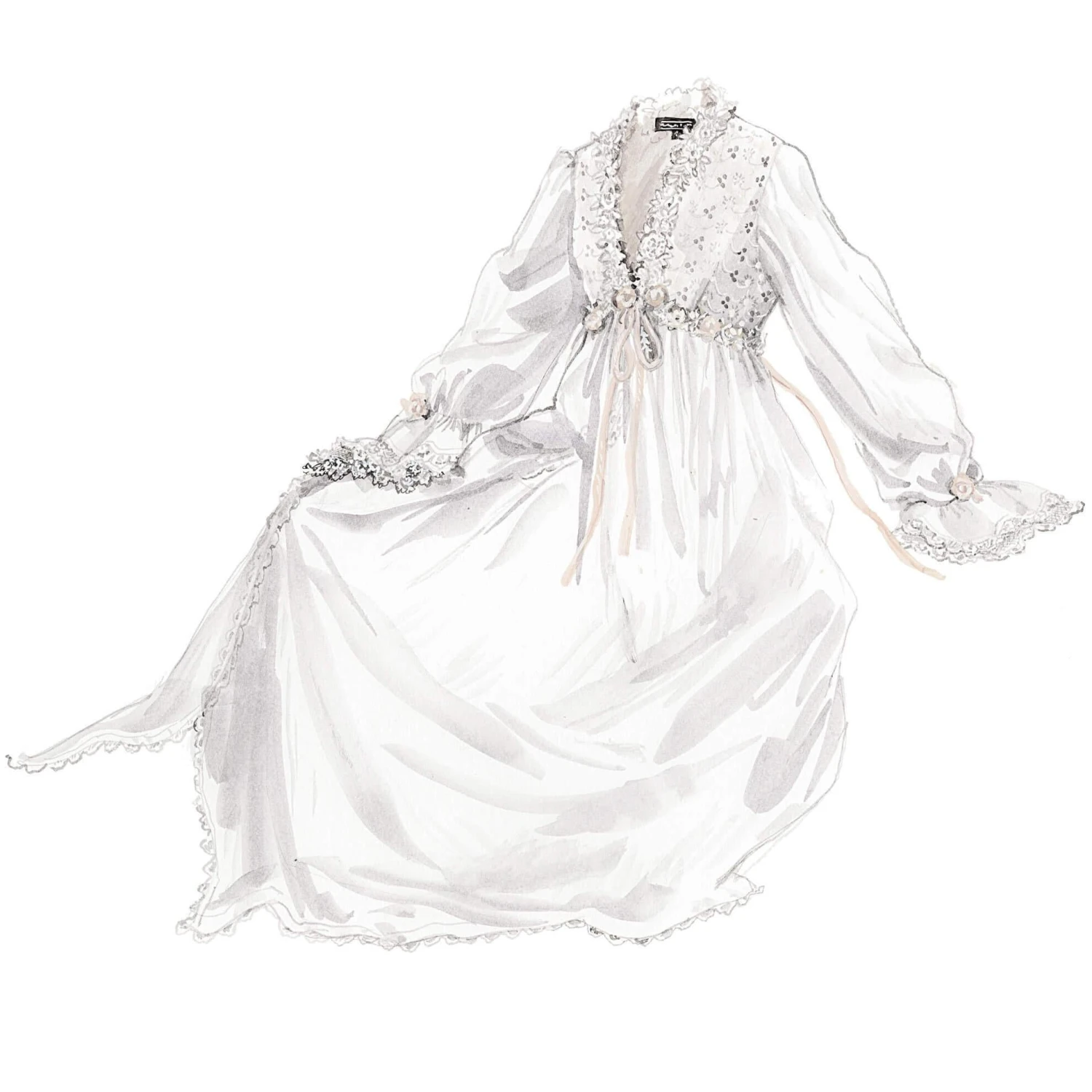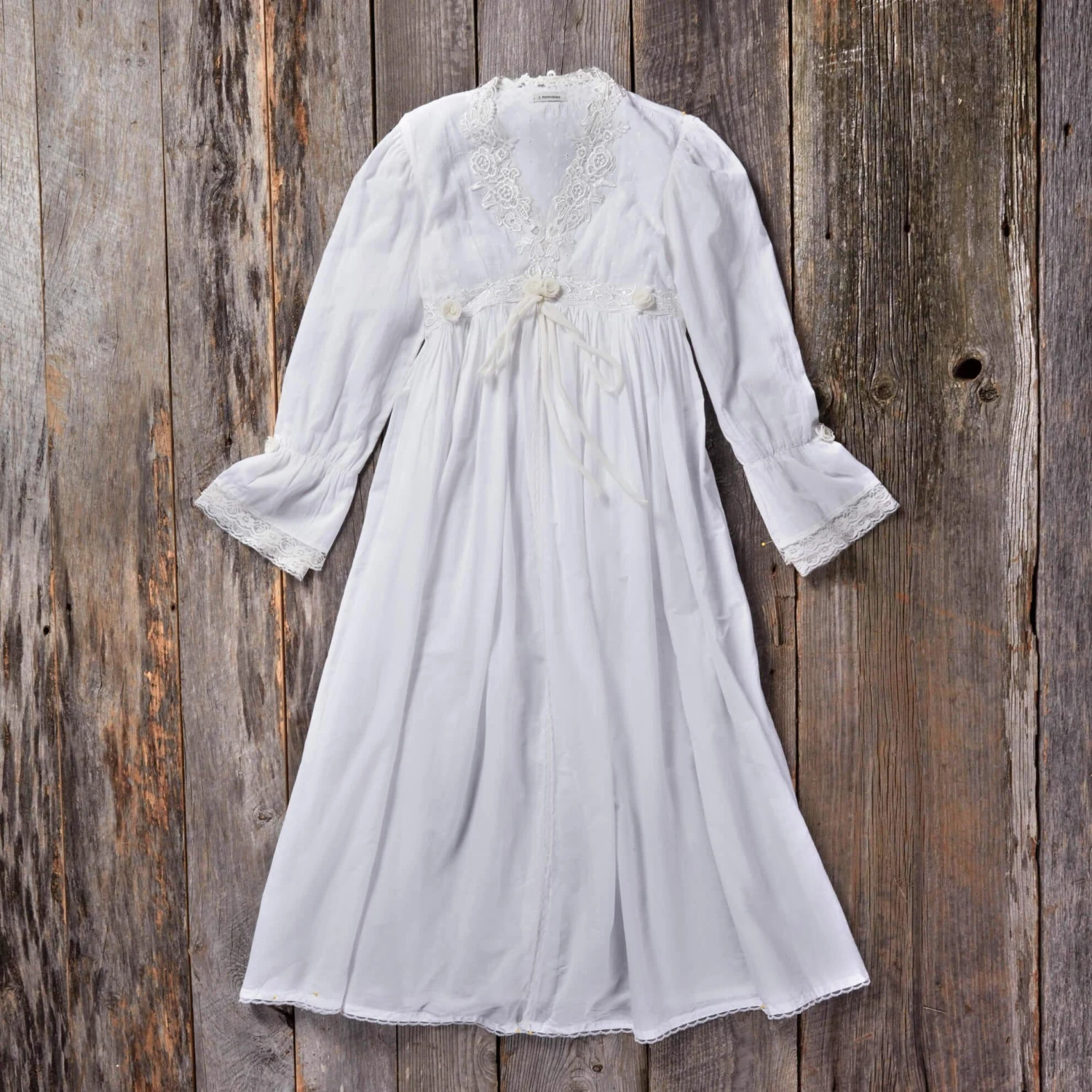 Vintage Tea Length Nightgown (No. J2801). Lace trimmed long sleeves. Lace and fabric rose trim below bodice, continues on hem and front seams. Eyelets, nylon chiffon rosebuds and ribbons all strategically placed. Contrasting fabric ties. It slips off as easily as it goes on. 100% cotton. Imported.